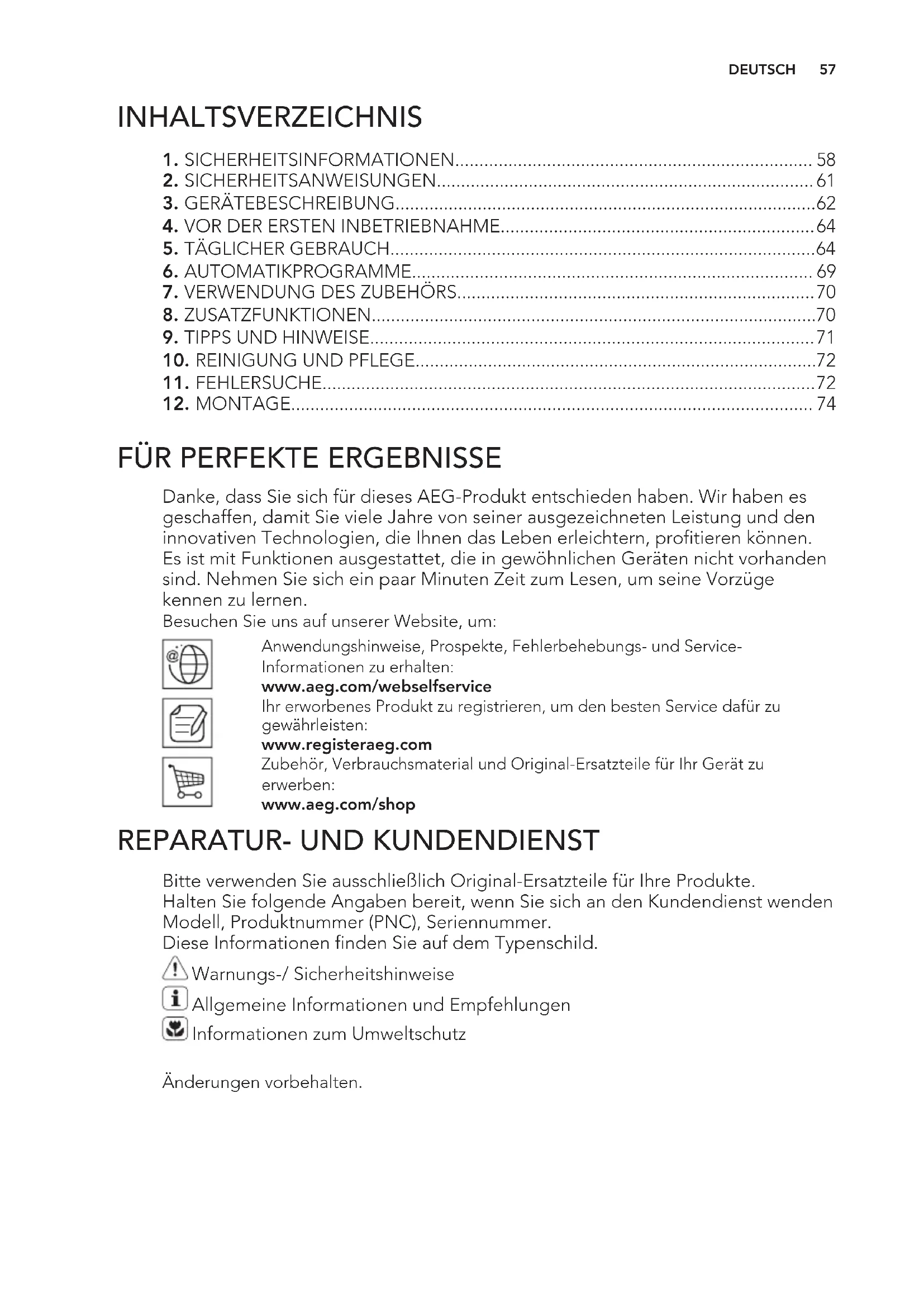 Danke, dass Sie sich für dieses AEG-Produkt entschieden haben. Wir haben es geschaffen, damit Sie viele Jahre von seiner ausgezeichneten Leistung und den innovativen Technologien, die Ihnen das Leben erleichtern, profitieren können. Es ist mit Funktionen ausgestattet, die in gewöhnlichen Geräten nicht vorhanden sind. Nehmen Sie sich ein paar Minuten Zeit zum Lesen, um seine Vorzüge kennen zu lernen. Besuchen Sie uns auf unserer Website, um: Anwendungshinweise, Prospekte, Fehlerbehebungs- und Service- Informationen zu erhalten: www.aeg.com/webselfservice Ihr erworbenes Produkt zu registrieren, um den besten Service dafür zu gewährleisten: www.registeraeg.com Zubehör, Verbrauchsmaterial und Original-Ersatzteile für Ihr Gerät zu erwerben: www.aeg.com/shop