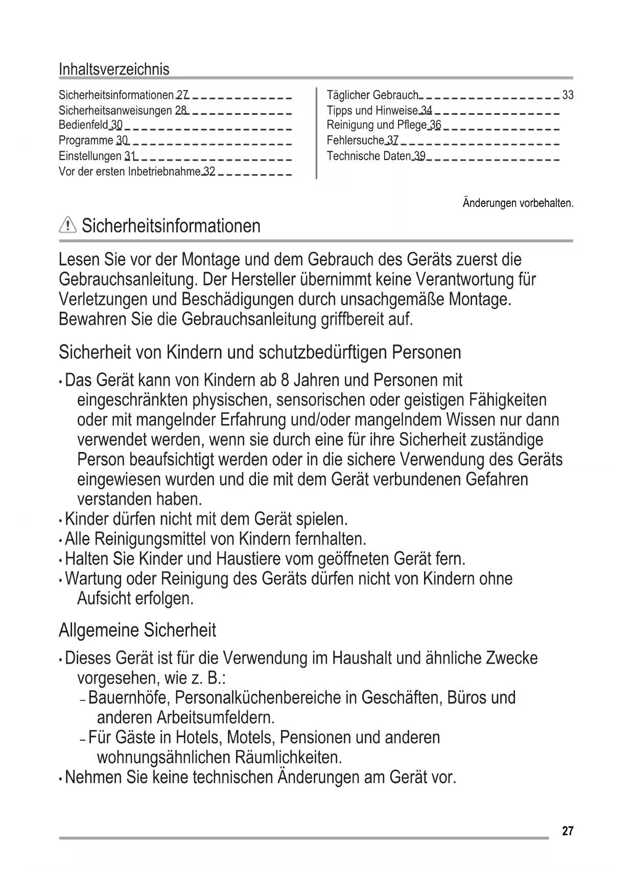 Tipps und Hinweise 34 Reinigung und Pflege 36 Fehlersuche 37 Technische Daten 39 Änderungen vorbehalten. Sicherheitsinformationen Lesen Sie vor der Montage und dem Gebrauch des Geräts zuerst die Gebrauchsanleitung. Der Hersteller übernimmt keine Verantwortung für Verletzungen und Beschädigungen durch unsachgemäße Montage. Bewahren Sie die Gebrauchsanleitung griffbereit auf. Sicherheit von Kindern und schutzbedürftigen Personen
