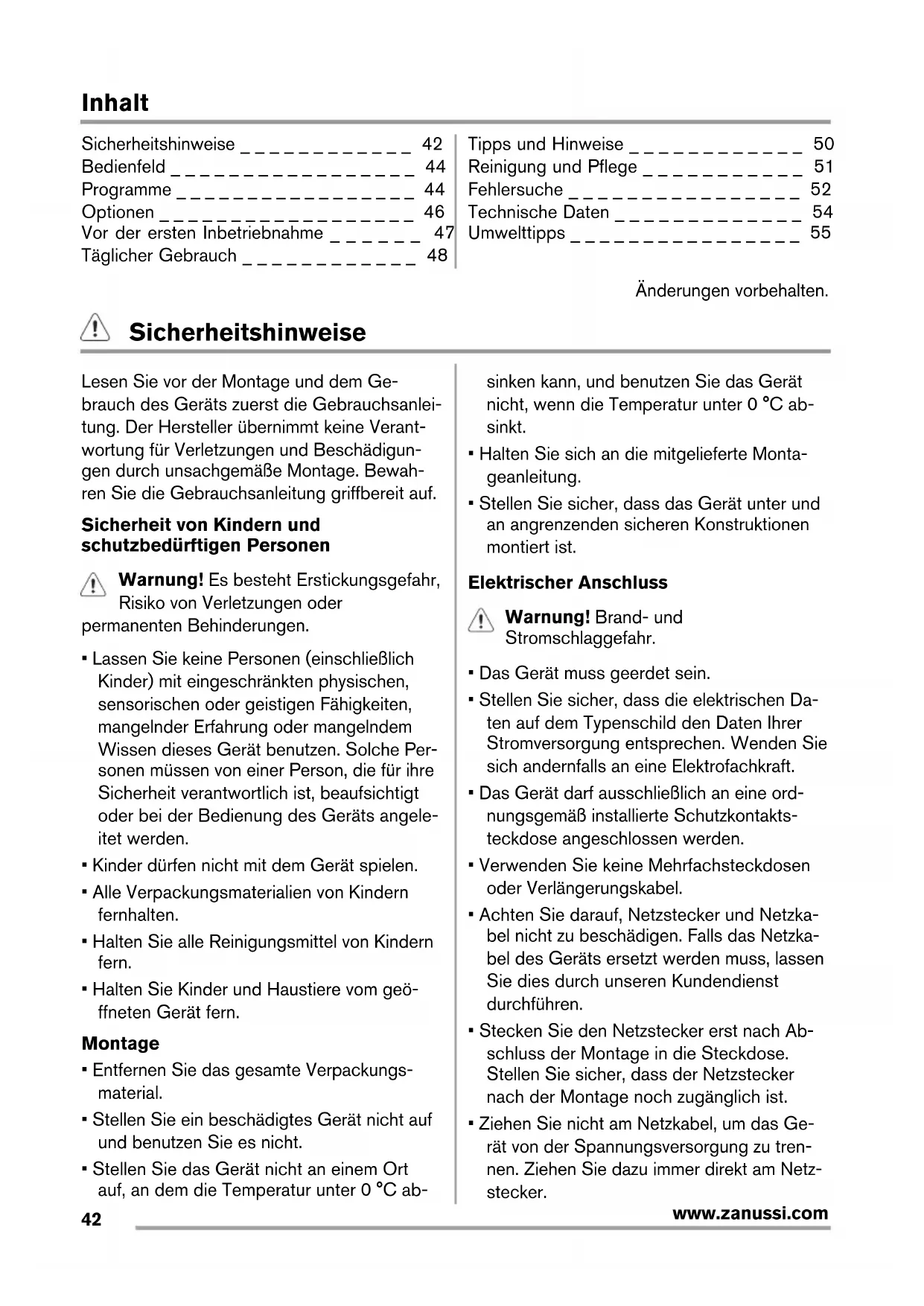 www.zanussi.comInhalt Sicherheitshinweise _ _ _ _ _ _ _ _ _ _ _ _ 42 Bedienfeld _ _ _ _ _ _ _ _ _ _ _ _ _ _ _ _ _ 44 Programme _ _ _ _ _ _ _ _ _ _ _ _ _ _ _ _ _ 44 Optionen _ _ _ _ _ _ _ _ _ _ _ _ _ _ _ _ _ _ 46 Vor der ersten Inbetriebnahme _ _ _ _ _ _ 47 Täglicher Gebrauch _ _ _ _ _ _ _ _ _ _ _ _ 48 Tipps und Hinweise _ _ _ _ _ _ _ _ _ _ _ _ 50 Reinigung und Pflege _ _ _ _ _ _ _ _ _ _ _ 51 Fehlersuche _ _ _ _ _ _ _ _ _ _ _ _ _ _ _ _ 52 Technische Daten _ _ _ _ _ _ _ _ _ _ _ _ _ 54 Umwelttipps _ _ _ _ _ _ _ _ _ _ _ _ _ _ _ _ 55 Änderungen vorbehalten. Sicherheitshinweise Lesen Sie vor der Montage und dem Ge- brauch des Geräts zuerst die Gebrauchsanlei- tung. Der Hersteller übernimmt keine Verant- wortung für Verletzungen und Beschädigun- gen durch unsachgemäße Montage. Bewah- ren Sie die Gebrauchsanleitung griffbereit auf. Sicherheit von Kindern und schutzbedürftigen Personen Warnung! Es besteht Erstickungsgefahr, Risiko von Verletzungen oder permanenten Behinderungen.