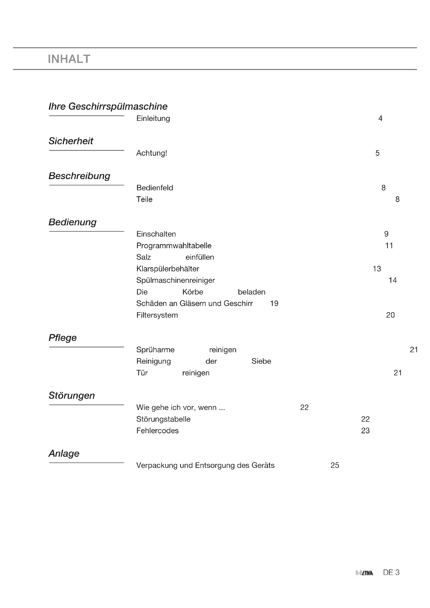 - FCKW-freies Polystyrol (PS-Hartschaum). Diese Materialien sind auf verantwortliche und vorschriftsmäßige Weise zu entsorgen. Um auf die Verpflichtung zu getrennter Entsorgung elektrischer Haushaltsgeräte hinzuweisen, ist auf dem Produkt das Symbol eines durchgestrichenen Mülleimers angebracht. Dies bedeutet, dass das Gerät am Ende seiner Lebensdauer nicht mit dem normalen Hausmüll entsorgt werden darf. Das Gerät muss in einem Spezialzentrum für getrennte Abfalleinsammlung der Gemeinde oder bei einer Verkaufsstelle, die diesen Service bietet, abgeliefert werden. Die getrennte Entsorgung von Haushaltsgeräten verhindert eventuelle negative Folgen für Umwelt und Gesundheit, die durch ungeeignete Entsorgung entstehen. So wird sichergestellt, dass die Materialien, aus denen das Gerät besteht, wiedergewonnen werden können und so eine erhebliche Einsparung von Energie und Rohstoffen erzielt wird. Achtung! Verpackungsmaterial kann für Kinder gefährlich sein. Konformitätserklärung Wir erklären, dass unsere Produkte die für sie relevanten europäischen Richtlinien, Beschlüsse und Verordnungen erfüllen, sowie die Anforderungen der angegebenen Normen.DE 26EN 3 CONTENTS Your dishwasher Introduction 4 Safety Note! 5 Description Control panel 8 Components 8 Operation Switching on 9 Cycle selection table 11 Adding salt 12 Rinse agent reservoir 13 Dishwasher detergents 14 Loading the baskets 16 Damage to glassware and other crockery 19 Filter system 20 Maintenance Cleaning the spray arms 21 Cleaning the filters 21 Cleaning the door 21 Errors What should I do, if... 22 Error table 22 Error codes 24 Appendix Disposing of the packaging and appliance 25EN 4 Introduction You have opted to purchase an Etna dishwasher. Optimum user comfort and easy operation were paramount during the development of this product. This manual describes how you can get the most out of your dishwasher. It provides you with information on how to operate the appliance, as well as background information about how it works. You will furthermore also find maintenance tips. The safety instructions that are relevant during the installation are included in the installation guide. This is intended for the installation technician. Read this manual before using the appliance. Keep this manual somewhere safe so that subsequent users can also benefit from the information contained within. YOUR DISHWASHEREN 5 Note! Contact a registered installer to fit your appliance (see “Installation instructions”). Do not connect the appliance to the electrical mains until the installation is complete.