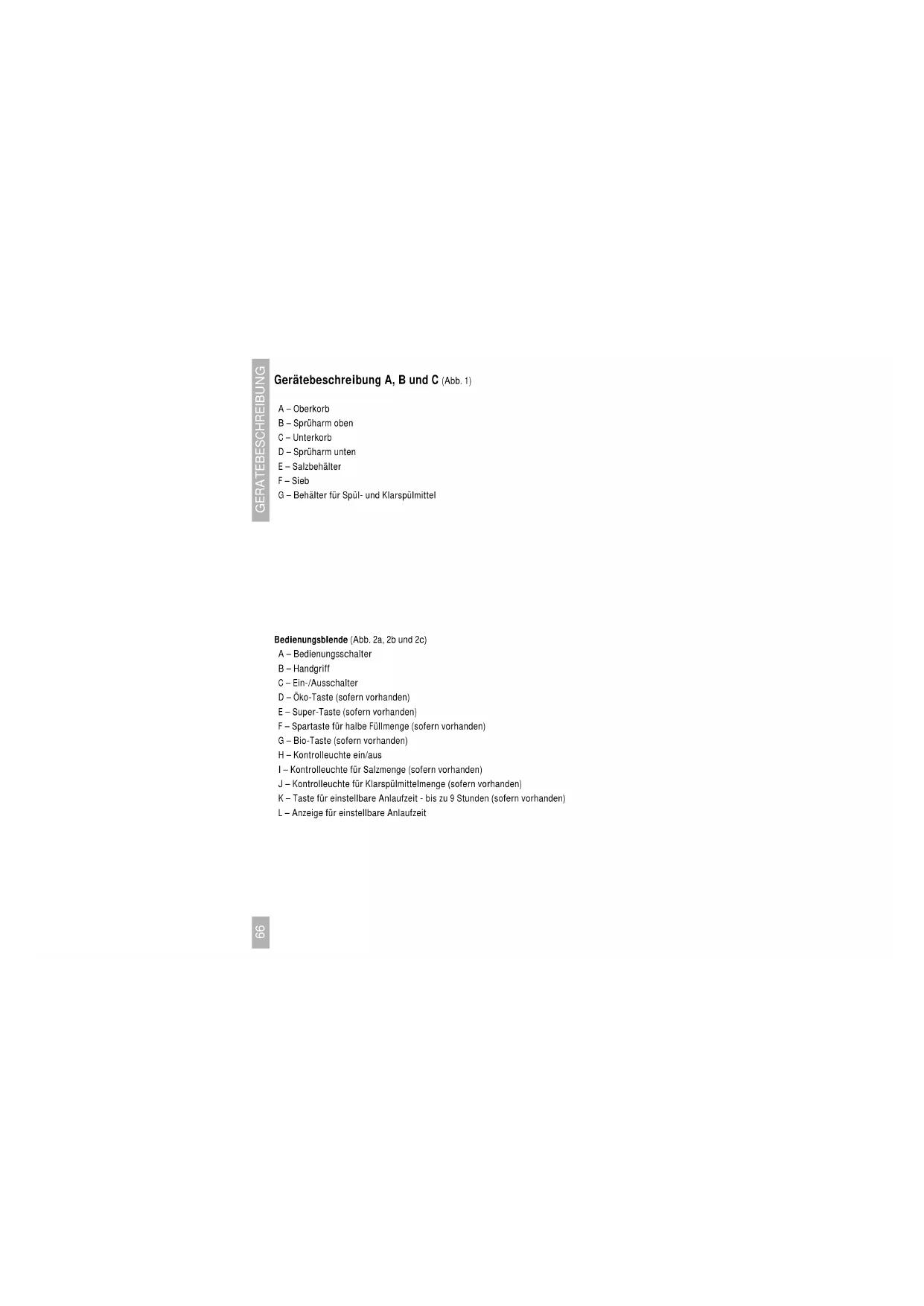 - MONTAGE65 EMBALLAGE Elimination de l’emballage et appareil L’emballage de l’appareil est recyclable. Il contient: – du carton – une feuille de polyéthylène (PE) – du polystyrène exempt de CFC ( mousse dure de PS) – bandes de polypropylène autour du carton Eliminer ces matériaux de façon adéquate et conformément à la réglementation en vigueur dans votre commune. L’administration communale vous informera des moyens adéquats de vous débarrasser de vos anciens appareils ménagers.66 GERATEBESCHREIBUNG Gerätebeschreibung A, B und C (Abb. 1) A – Oberkorb B – Sprüharm oben C – Unterkorb D – Sprüharm unten E – Salzbehälter F – Sieb G – Behälter für Spül- und Klarspülmittel Bedienungsblende (Abb. 2a, 2b und 2c) A – Bedienungsschalter B – Handgriff C – Ein-/Ausschalter D – Öko-Taste (sofern vorhanden) E – Super-Taste (sofern vorhanden) F – Spartaste für halbe Füllmenge (sofern vorhanden) G – Bio-Taste (sofern vorhanden) H – Kontrolleuchte ein/aus I – Kontrolleuchte für Salzmenge (sofern vorhanden) J – Kontrolleuchte für Klarspülmittelmenge (sofern vorhanden) K – Taste für einstellbare Anlaufzeit - bis zu 9 Stunden (sofern vorhanden) L – Anzeige für einstellbare Anlaufzeit67 INHALTSANGABE Einleitung Wenn Sie diese Gebrauchsanleitung lesen, sind Sie rasch über alle Möglichkeiten informiert, die dieses Gerät Ihnen bieten kann. Sie können sich über Sicherheit und Pflege des Gerätes informieren. Außerdem finden Sie Umwelt- und Energiespartips. Bewahren Sie diese Gebrauchsanweisung und die Installationsanweisungen sorgfältig – einem eventuell folgenden Benutzer des Gerätes kann dies von Nutzen sein. Dieses Gerät entspricht den CE-Richtlinien. Inhaltsangabe DE ■ Gerätebeschreibung p. 66