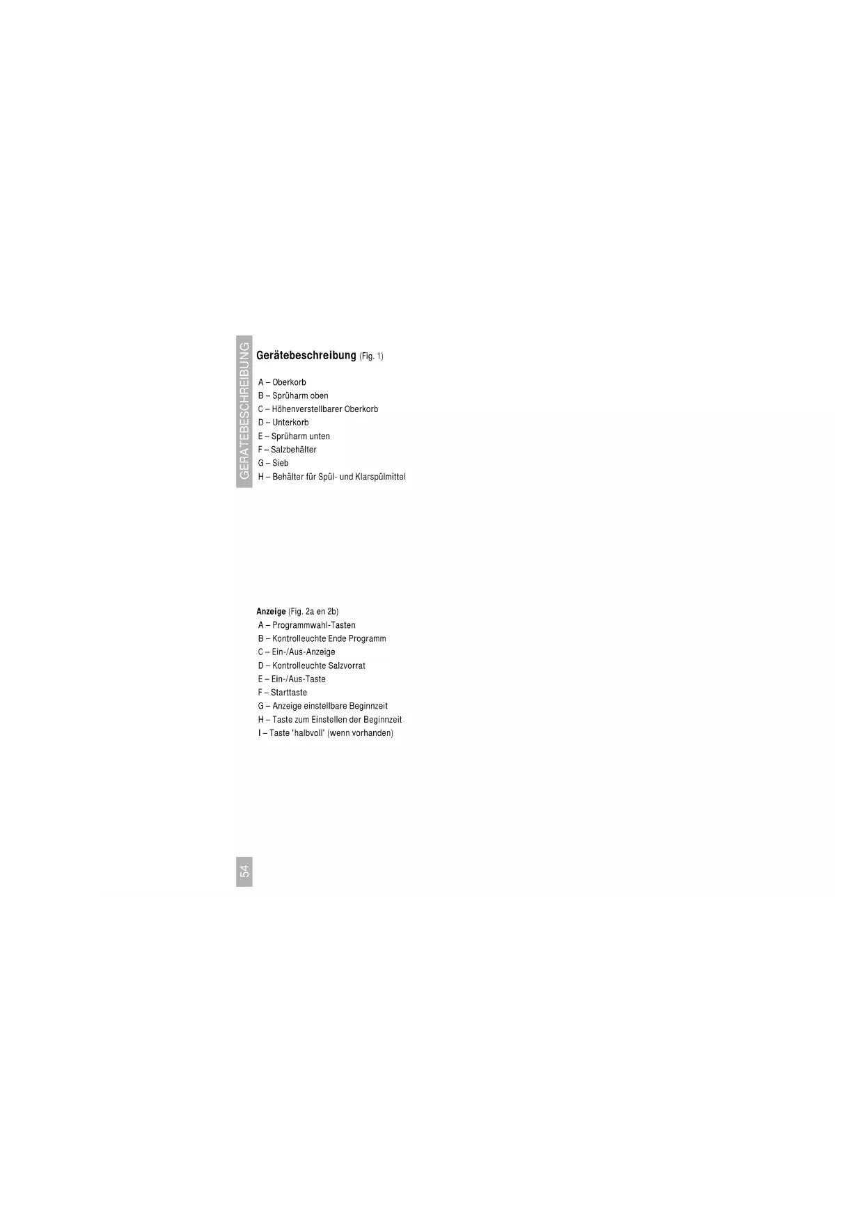 - ■ Monter toutes les pièces de fixation sur la porte, comme est indiquée dans fig. 9b. Attention à la position des côtés plats des goupilles supérieures; Ceux- ci doivent être orientés vers l'extérieur. ■ Fixez le panneau sur le lave-vaisselle en plaçant les crochets inférieurs par dessus les goupilles - à gauche et à droite du devant. Enfoncez les goupilles supérieures dans les encoches de la partie en plastique. Démontage du panneau de porte du lave- vaisselle 45 cm ■ Faites ressortir les goupilles qui se trouvent dans les côtés droit et gauche à l'aide de la clé en plastique fournie (C). Réglage de la tension du ressort (voir fig. 10) fig. 10 ■ Le réglage standard de la tension du ressort correspond à la tension la plus faible. ■ Pour augmenter la tension du ressort, serrez les deux vis de réglage "A" à l'aide d'un tournevis dans le sens des aiguilles d'une montre. La tension du ressort est bonne si la porte est en équilibre en position ouverte. Placement (voir fig. 11) fig. 11 Attention: Les tuyaux ne doivent pas être coudés ou écrasés pendant l'installation du lave- vaisselle à l'endroit prévu. ■ Fixer la plaque métallique livrée avec le lave-vaisselle sous le plan de travail. ■ Mettez le lave-vaisselle de niveau. ■ Fixer la machine à laver la vaisselle au plan de travail. ■ Monter la plinthe. ■ Ouvrir doucement la porte du lave vaisselle afin de contrôler si la porte frotte contre la plinthe. ■ Marquez, le cas échéant, la partie de la plinthe qui doit être retirée. Laissez trois millimètres de jeu entre la porte et la plinthe pour que la porte pivote librement. ■ Étanchez le morceau de plinthe sciée - avec de la peinture par exemple - et replacez la plinthe. A52 MONTAGE/EMBALLAGE Autres points d'attention Ne laissez pas plus de 3 millimètres de jeu autour de la machine, il pourrait se produire un contact avec les éléments électriques de la machine. Evacuation des eaux ■ Le conduit d'évacuation doit être équipé d'un siphon. ■ Le tuyau d'évacuation doit se trouver à une hauteur maximale de 80 cm et à une hauteur minimale de 32 cm. Aquastop Un aquastop est livré avec quelques types des laves-vaisselles. L'aquastop doit être placé en position quatre avec la clé fournie. ■ Montez l'aquastop sur le robinet. Branchez ensuite le tuyau d'adduction du lave- vaisselle sur l'aquastop. Pour d'autres modèles l'aquastop est intégré au tuyau d'adduction. ■ L'aquastop ne rétablit pas de lui-même l'adduction d'eau si elle a été bloquée. Recherchez d'abord pourquoi l'aquastop a bloqué l'arrivée d'eau. Prenez contact auprès de votre installateur ou avec le service après vente. Elimination de l’emballage et appareil L’emballage de l’appareil est recyclable. Il contient: – du carton – une feuille de polyéthylène (PE) – du polystyrène exempt de CFC ( mousse dure de PS) – bandes de polypropylène autour du carton Eliminer ces matériaux de façon adéquate et conformément à la réglementation en vigueur dans votre commune. L’administration communale vous informera des moyens adéquats de vous débarrasser de vos anciens appareils ménagers.5354 GERATEBESCHREIBUNG Gerätebeschreibung (Fig. 1) A – Oberkorb B – Sprüharm oben C – Höhenverstellbarer Oberkorb D – Unterkorb E – Sprüharm unten F – Salzbehälter G – Sieb H – Behälter für Spül- und Klarspülmittel Anzeige (Fig. 2a en 2b) A – Programmwahl-Tasten B – Kontrolleuchte Ende Programm C – Ein-/Aus-Anzeige D – Kontrolleuchte Salzvorrat E – Ein-/Aus-Taste F – Starttaste G – Anzeige einstellbare Beginnzeit H – Taste zum Einstellen der Beginnzeit I – Taste 'halbvoll' (wenn vorhanden)55 Einleitung Wenn Sie diese Gebrauchsanleitung lesen, sind Sie rasch über alle Möglichkeiten informiert, die dieses Gerät Ihnen bieten kann. Sie können sich über Sicherheit und Pflege des Gerätes informieren. Außerdem finden Sie Umwelt- und Energiespartips. Bewahren Sie diese Gebrauchsanweisung und die Installationsanweisungen sorgfältig - einem eventuell folgenden Benutzer des Gerätes kann dies von Nutzen sein. Das Gerät erfüllt die in der EG-Richtlinie 89/336/EEG genannten Vorschriften über elektromagnetische Kompatibilität. Inhaltsangabe ■ Sicherheit p. 56