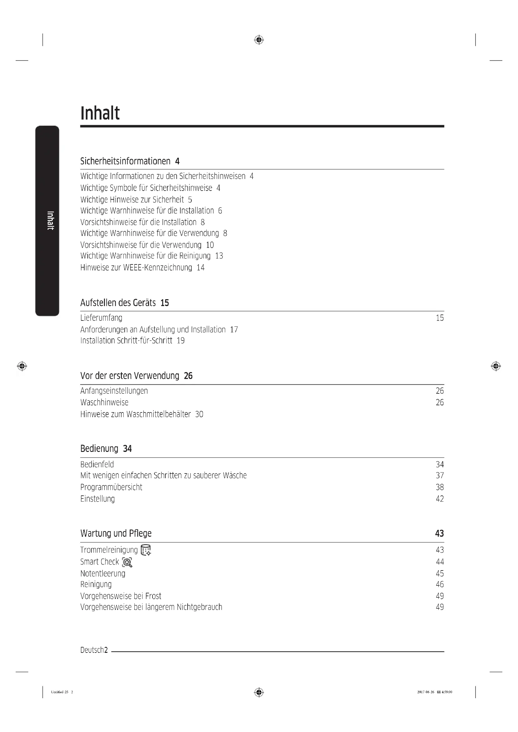 [HHP] 06196 9340224 www.samsung.com/de/support LUXEMBURG 261 03 710 www.samsung.com/be_fr/support DC68-03779J-01 Untitled-26 64 2017-06-26 5:01:04Waschmaschine Benutzerhandbuch WW9*J5**6**/WW8*J5**6**/WW7*J5**6** Untitled-25 1 2017-06-26 4:59:00Deutsch2 Inhalt Inhalt Sicherheitsinformationen 4 Wichtige Informationen zu den Sicherheitshinweisen 4 Wichtige Symbole für Sicherheitshinweise 4 Wichtige Hinweise zur Sicherheit 5 Wichtige Warnhinweise für die Installation 6 Vorsichtshinweise für die Installation 8 Wichtige Warnhinweise für die Verwendung 8 Vorsichtshinweise für die Verwendung 10 Wichtige Warnhinweise für die Reinigung 13 Hinweise zur WEEE-Kennzeichnung 14 Aufstellen des Geräts 15 Lieferumfang 15 Anforderungen an Aufstellung und Installation 17 Installation Schritt-für-Schritt 19 Vor der ersten Verwendung 26 Anfangseinstellungen 26 Waschhinweise 26 Hinweise zum Waschmittelbehälter 30 Bedienung 34 Bedienfeld 34 Mit wenigen einfachen Schritten zu sauberer Wäsche 37 Programmübersicht 38 Einstellung 42 Wartung und Pege 43 Trommelreinigung 43 Smart Check