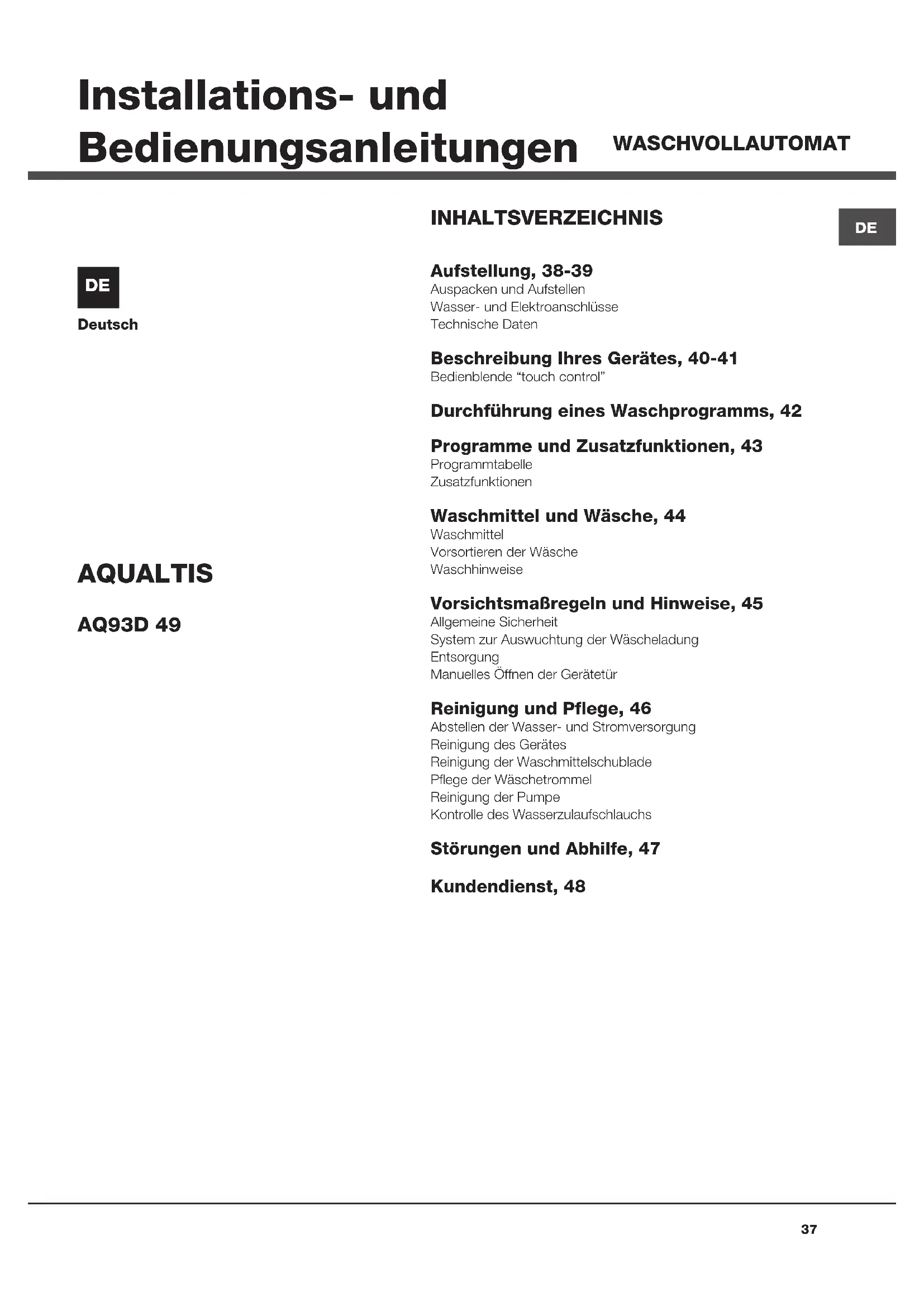 Deutsch INHALTSVERZEICHNIS Aufstellung, 38-39 Auspacken und AufstellenWasser- und ElektroanschlüsseTechnische Daten Beschreibung Ihres Gerätes, 40-41 Bedienblende “touch control” Durchführung eines Waschprogramms, 42 Programme und Zusatzfunktionen, 43 ProgrammtabelleZusatzfunktionen Waschmittel und Wäsche, 44 WaschmittelVorsortieren der WäscheWaschhinweise Vorsichtsmaßregeln und Hinweise, 45 Allgemeine SicherheitSystem zur Auswuchtung der WäscheladungEntsorgungManuelles Öffnen der Gerätetür Reinigung und Pflege, 46 Abstellen der Wasser- und StromversorgungReinigung des GerätesReinigung der WaschmittelschubladePflege der WäschetrommelReinigung der PumpeKontrolle des Wasserzulaufschlauchs Störungen und Abhilfe, 47 Kundendienst, 48