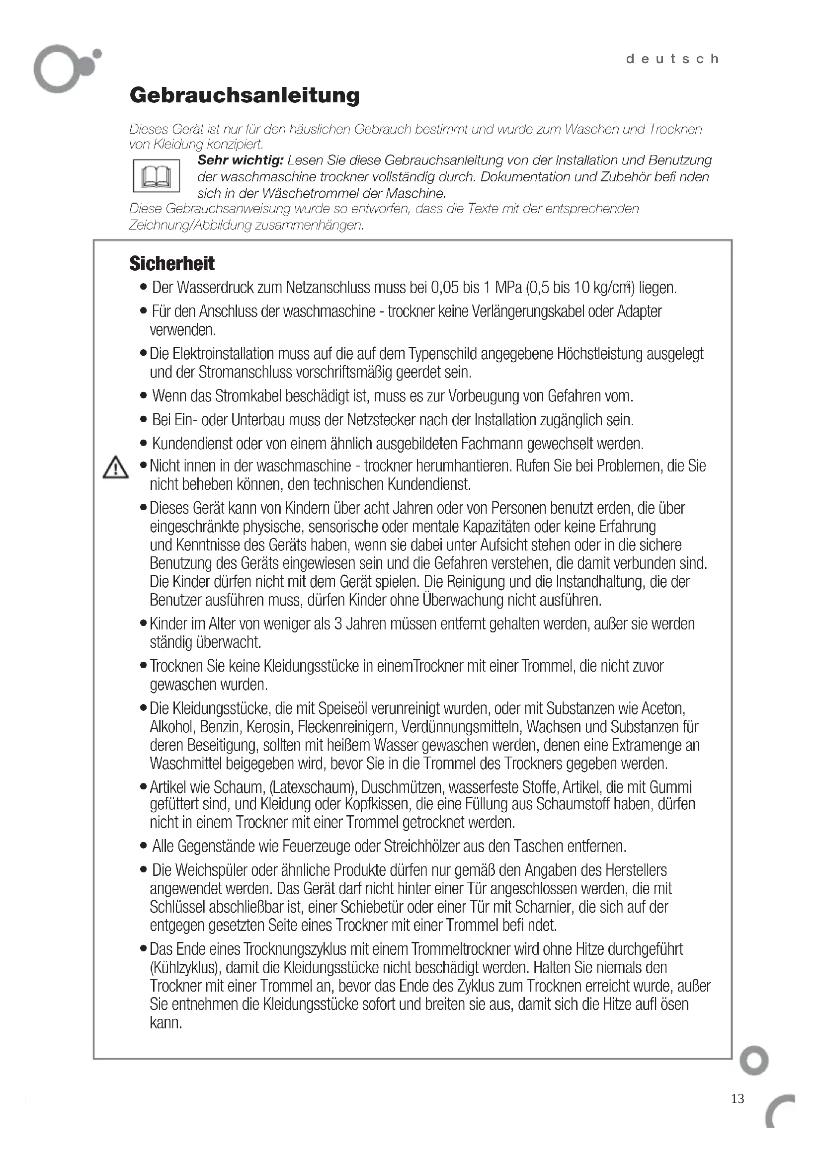 - Das Ende eines Trocknungszyklus mit einem Trommeltrockner wird ohne Hitze durchgeführt (Kühlzyklus), damit die Kleidungsstücke nicht beschädigt werden. Halten Sie niemals den Trockner mit einer Trommel an, bevor das Ende des Zyklus zum Trocknen erreicht wurde, außer Sie entnehmen die Kleidungsstücke sofort und breiten sie aus, damit sich die Hitze aufl ösen kann. Dieses Gerät ist nur für den häuslichen Gebrauch bestimmt und wurde zum Waschen und Trocknen von Kleidung konzipiert. Sehr wichtig: Lesen Sie diese Gebrauchsanleitung von der Installation und Benutzung der waschmaschine trockner vollständig durch. Dokumentation und Zubehör befi nden sich in der Wäschetrommel der Maschine. Diese Gebrauchsanweisung wurde so entworfen, dass die Texte mit der entsprechenden Zeichnung/Abbildung zusammenhängen. Sicherheit14 deutsch
