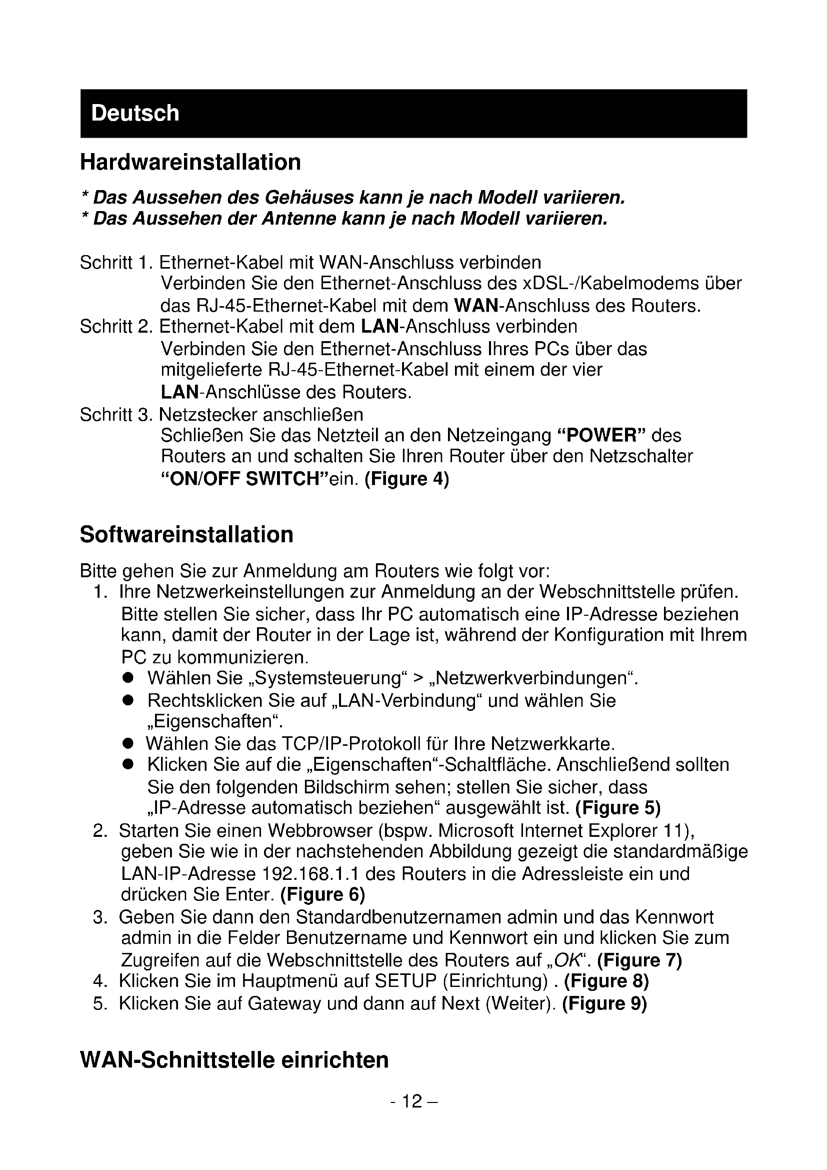 - Das Aussehen der Antenne kann je nach Modell variieren. Schritt 1. Ethernet-Kabel mit WAN-Anschluss verbinden Verbinden Sie den Ethernet-Anschluss des xDSL-/Kabelmodems über das RJ-45-Ethernet-Kabel mit dem WAN-Anschluss des Routers. Schritt 2. Ethernet-Kabel mit dem LAN-Anschluss verbinden Verbinden Sie den Ethernet-Anschluss Ihres PCs über das mitgelieferte RJ-45-Ethernet-Kabel mit einem der vier LAN-Anschlüsse des Routers. Schritt 3. Netzstecker anschließen Schließen Sie das Netzteil an den Netzeingang “POWER” des Routers an und schalten Sie Ihren Router über den Netzschalter “ON/OFF SWITCH”ein. (Figure 4) Softwareinstallation Bitte gehen Sie zur Anmeldung am Routers wie folgt vor: