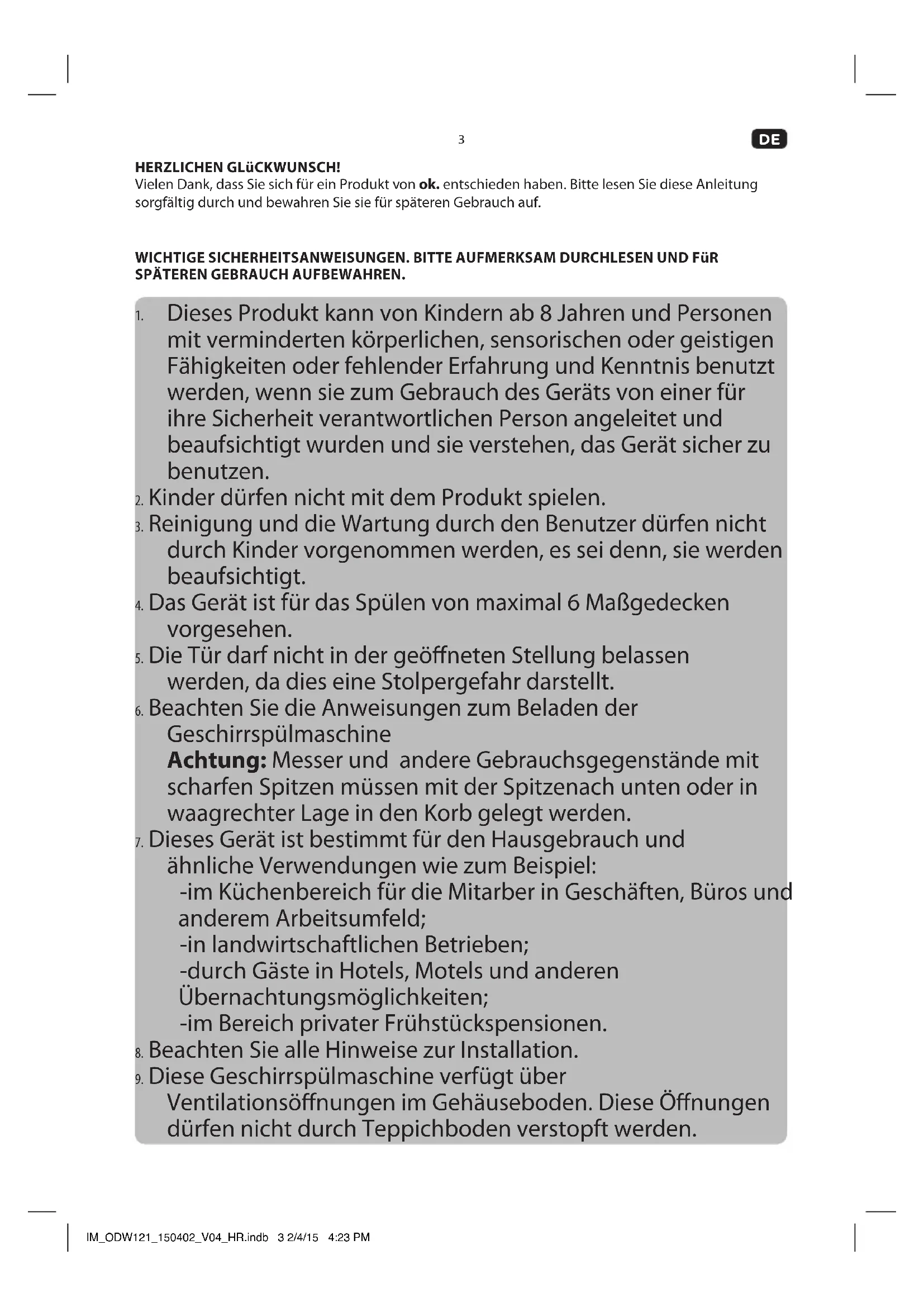 Dieses Produkt ist nur für das Reinigen von Geschirr und Besteck geeignet. Jeglicher anderer Gebrauch kann zu Schaden am Produkt oder Verletzungen fuhren. Das Gerät ist nur für die Benutzung im privaten Haushalt bestimmt und nicht für kommerziellen Gebrauch geeignet. IM_ODW121_150402_V04_HR.indb 4 2/4/15 4:23 PM5