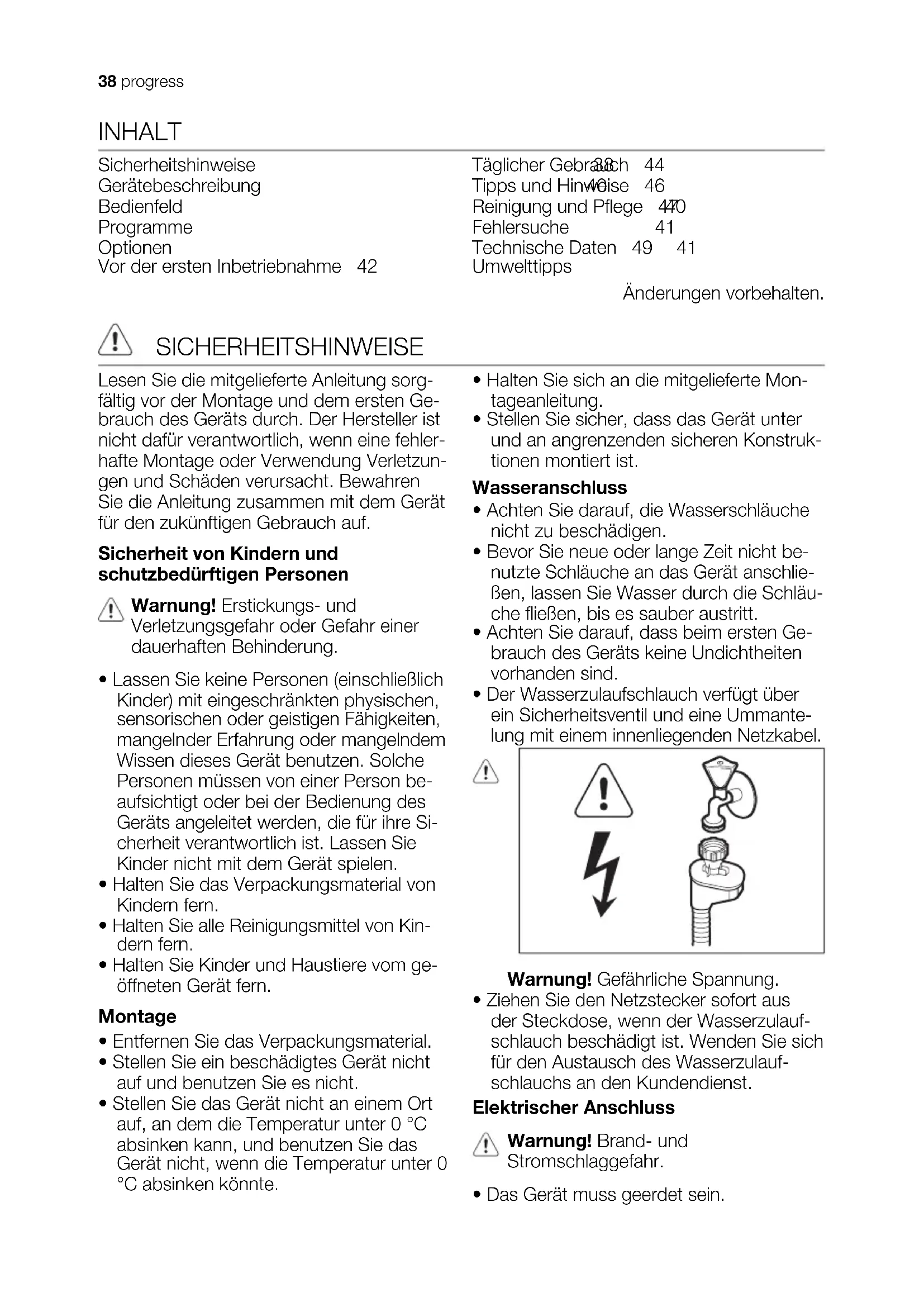 progress 37INHALT Sicherheitshinweise 38 Gerätebeschreibung 40 Bedienfeld 40 Programme 41 Optionen 41 Vor der ersten Inbetriebnahme 42 Täglicher Gebrauch 44 Tipps und Hinweise 46 Reinigung und Pflege 47 Fehlersuche 48 Technische Daten 49 Umwelttipps 49 Änderungen vorbehalten. SICHERHEITSHINWEISE Lesen Sie die mitgelieferte Anleitung sorg- fältig vor der Montage und dem ersten Ge- brauch des Geräts durch. Der Hersteller ist nicht dafür verantwortlich, wenn eine fehler- hafte Montage oder Verwendung Verletzun- gen und Schäden verursacht. Bewahren Sie die Anleitung zusammen mit dem Gerät für den zukünftigen Gebrauch auf. Sicherheit von Kindern und schutzbedürftigen Personen Warnung! Erstickungs- und Verletzungsgefahr oder Gefahr einer dauerhaften Behinderung.