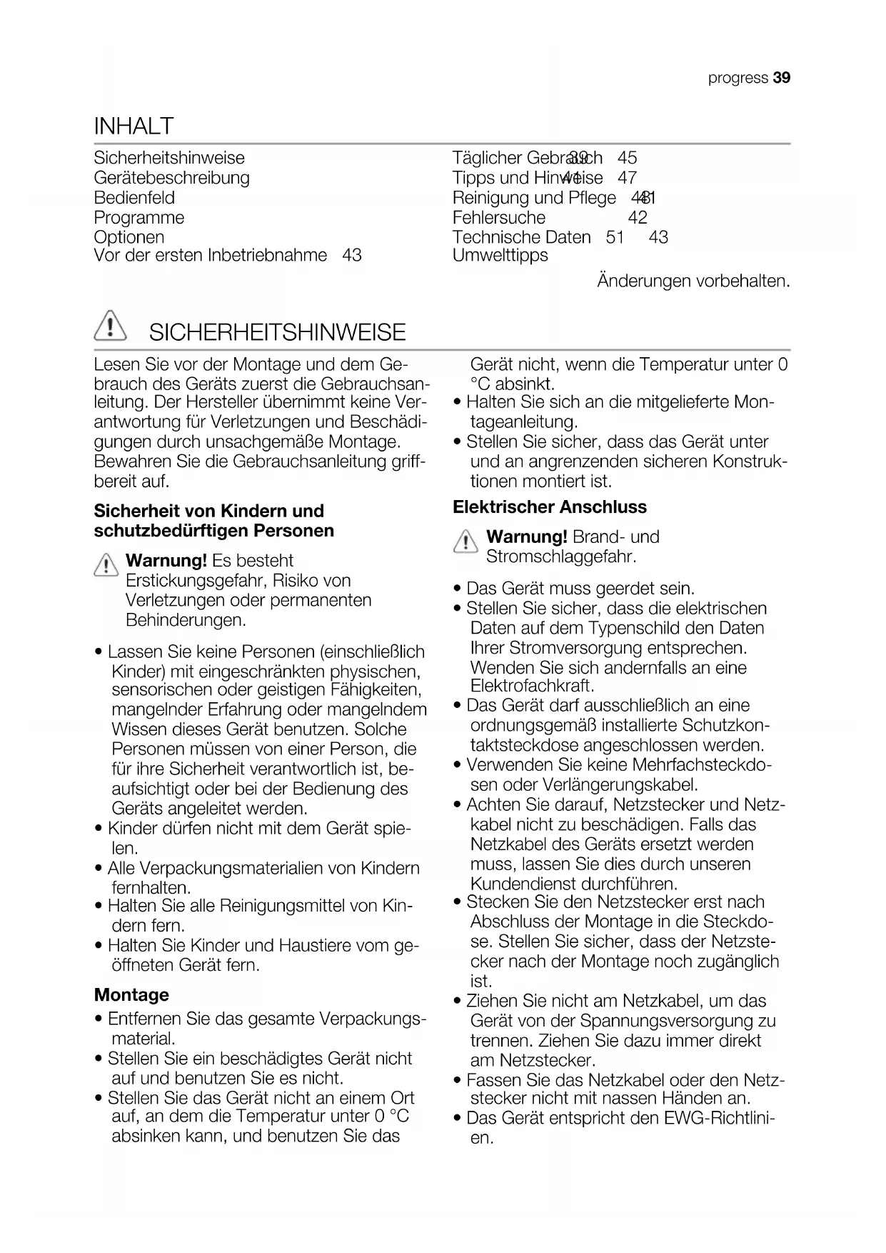 38 progressINHALT Sicherheitshinweise 39 Gerätebeschreibung 41 Bedienfeld 41 Programme 42 Optionen 43 Vor der ersten Inbetriebnahme 43 Täglicher Gebrauch 45 Tipps und Hinweise 47 Reinigung und Pflege 48 Fehlersuche 49 Technische Daten 51 Umwelttipps 51 Änderungen vorbehalten. SICHERHEITSHINWEISE Lesen Sie vor der Montage und dem Ge- brauch des Geräts zuerst die Gebrauchsan- leitung. Der Hersteller übernimmt keine Ver- antwortung für Verletzungen und Beschädi- gungen durch unsachgemäße Montage. Bewahren Sie die Gebrauchsanleitung griff- bereit auf. Sicherheit von Kindern und schutzbedürftigen Personen Warnung! Es besteht Erstickungsgefahr, Risiko von Verletzungen oder permanenten Behinderungen.