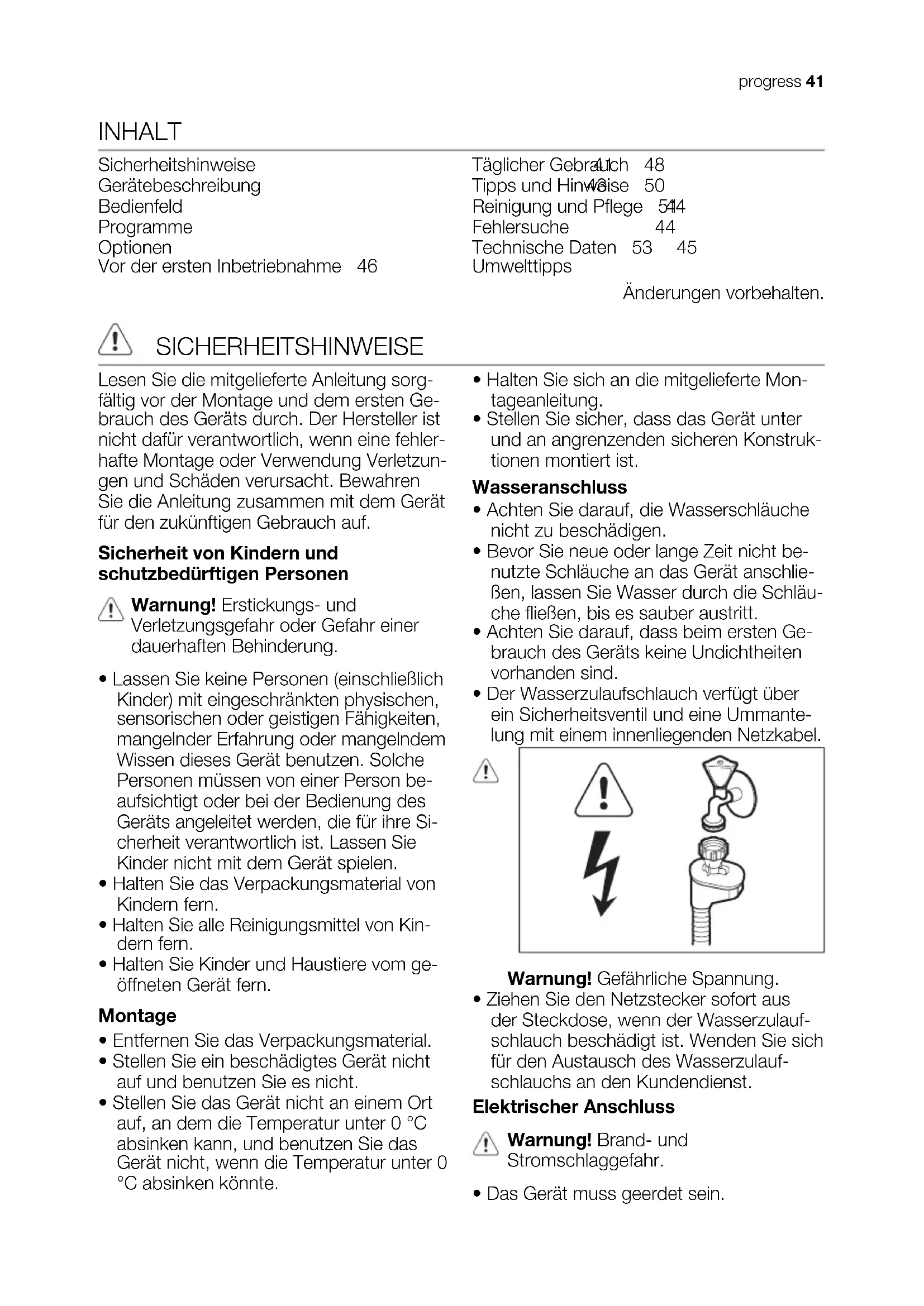 40 progressINHALT Sicherheitshinweise 41 Gerätebeschreibung 43 Bedienfeld 44 Programme 44 Optionen 45 Vor der ersten Inbetriebnahme 46 Täglicher Gebrauch 48 Tipps und Hinweise 50 Reinigung und Pflege 51 Fehlersuche 52 Technische Daten 53 Umwelttipps 53 Änderungen vorbehalten. SICHERHEITSHINWEISE Lesen Sie die mitgelieferte Anleitung sorg- fältig vor der Montage und dem ersten Ge- brauch des Geräts durch. Der Hersteller ist nicht dafür verantwortlich, wenn eine fehler- hafte Montage oder Verwendung Verletzun- gen und Schäden verursacht. Bewahren Sie die Anleitung zusammen mit dem Gerät für den zukünftigen Gebrauch auf. Sicherheit von Kindern und schutzbedürftigen Personen Warnung! Erstickungs- und Verletzungsgefahr oder Gefahr einer dauerhaften Behinderung.