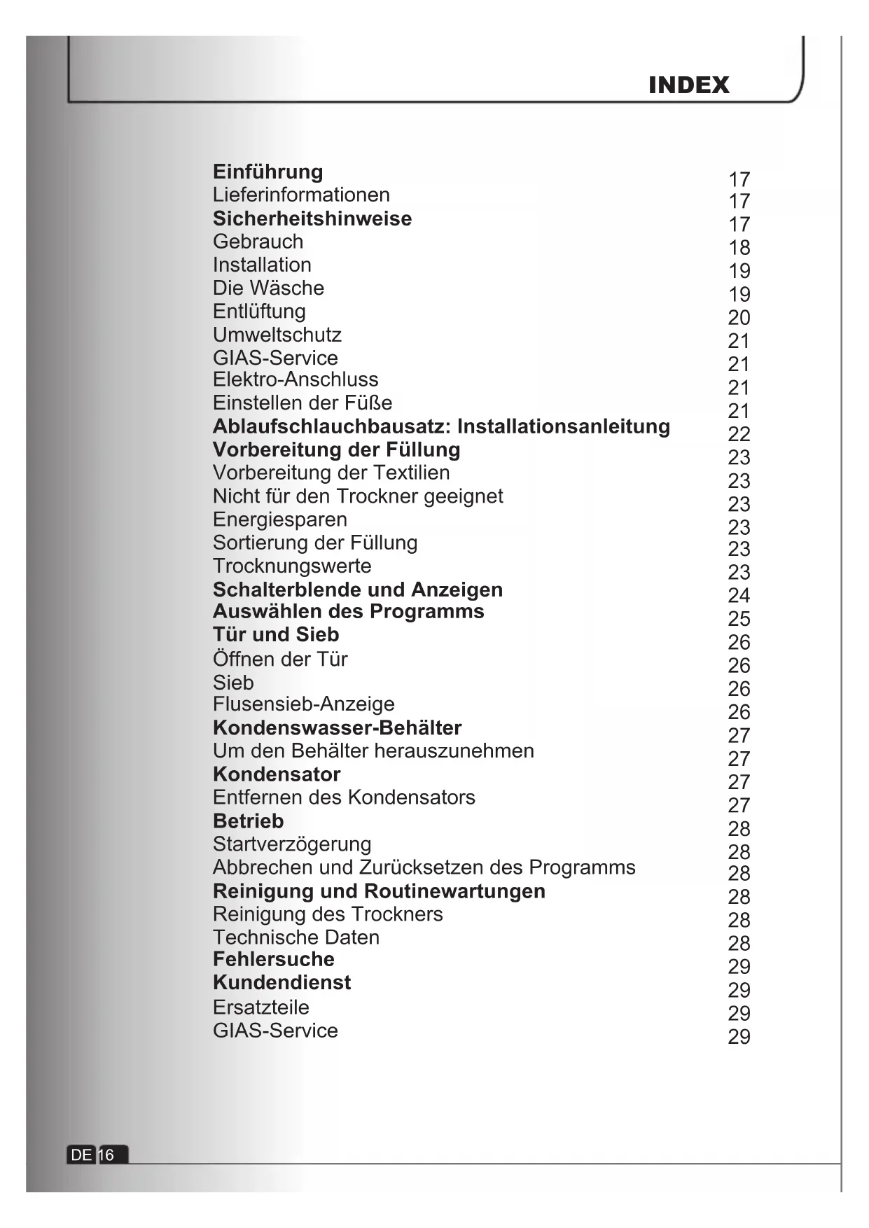 -EASY-CARE TEXTILE EN 14INDEX Einführung Lieferinformationen Sicherheitshinweise Gebrauch Installation Die Wäsche Entlüftung Umweltschutz GIAS-Service Elektro-Anschluss Einstellen der Füße Ablaufschlauchbausatz: Installationsanleitung Vorbereitung der Füllung Vorbereitung der Textilien Nicht für den Trockner geeignet Energiesparen Sortierung der Füllung Trocknungswerte Schalterblende und Anzeigen Auswählen des Programms Tür und Sieb Öffnen der Tür Sieb Flusensieb-Anzeige Kondenswasser-Behälter Um den Behälter herauszunehmen Kondensator Entfernen des Kondensators Betrieb Startverzögerung Abbrechen und Zurücksetzen des Programms Reinigung und Routinewartungen Reinigung des Trockners Technische Daten Fehlersuche Kundendienst Ersatzteile GIAS-Service