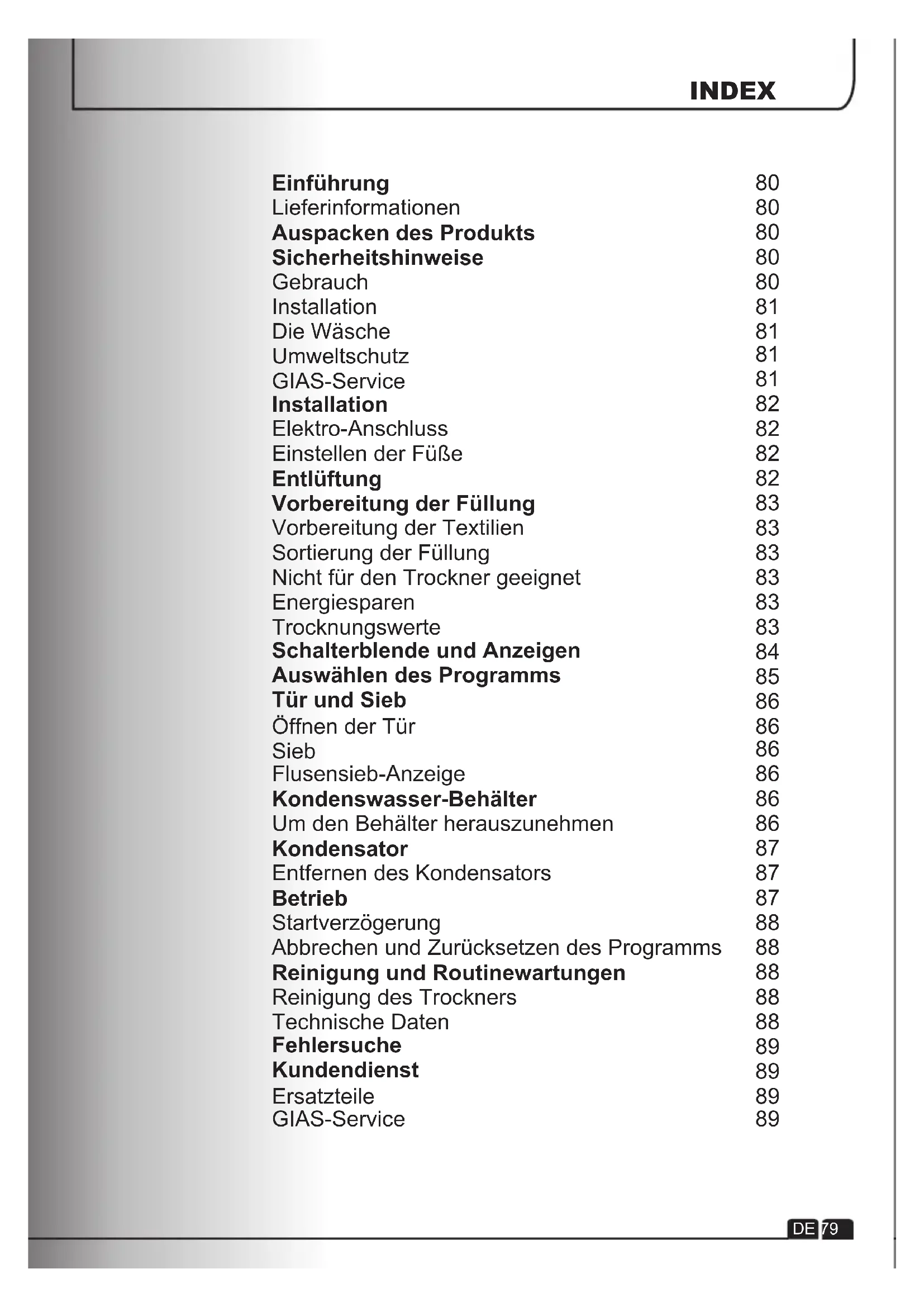 Einführung Lieferinformationen Auspacken des Produkts Sicherheitshinweise Gebrauch Installation Die Wäsche Umweltschutz GIAS-Service Installation Elektro-Anschluss Einstellen der Füße Entlüftung Vorbereitung der Füllung Vorbereitung der Textilien Sortierung der Füllung Nicht für den Trockner geeignet Energiesparen Trocknungswerte Schalterblende und Anzeigen Auswählen des Programms Tür und Sieb Öffnen der Tür Sieb Flusensieb-Anzeige Kondenswasser-Behälter Um den Behälter herauszunehmen Kondensator Entfernen des Kondensators Betrieb Startverzögerung Abbrechen und Zurücksetzen des Programms Reinigung und Routinewartungen Reinigung des Trockners Technische Daten Fehlersuche Kundendienst Ersatzteile GIAS-Service DE 79 INDEXZum Lieferumfang Ihrer Waschmaschine gehören folgende Dokumentation und Zusatzteile: ● Bedienungsanleitung ● Garantieschein ● Energieeffizienzklasse E n t f e r n e n S i e d i e Verpackung der Maschine dicht an dem Platz, wo sie aufgestellt werden soll.