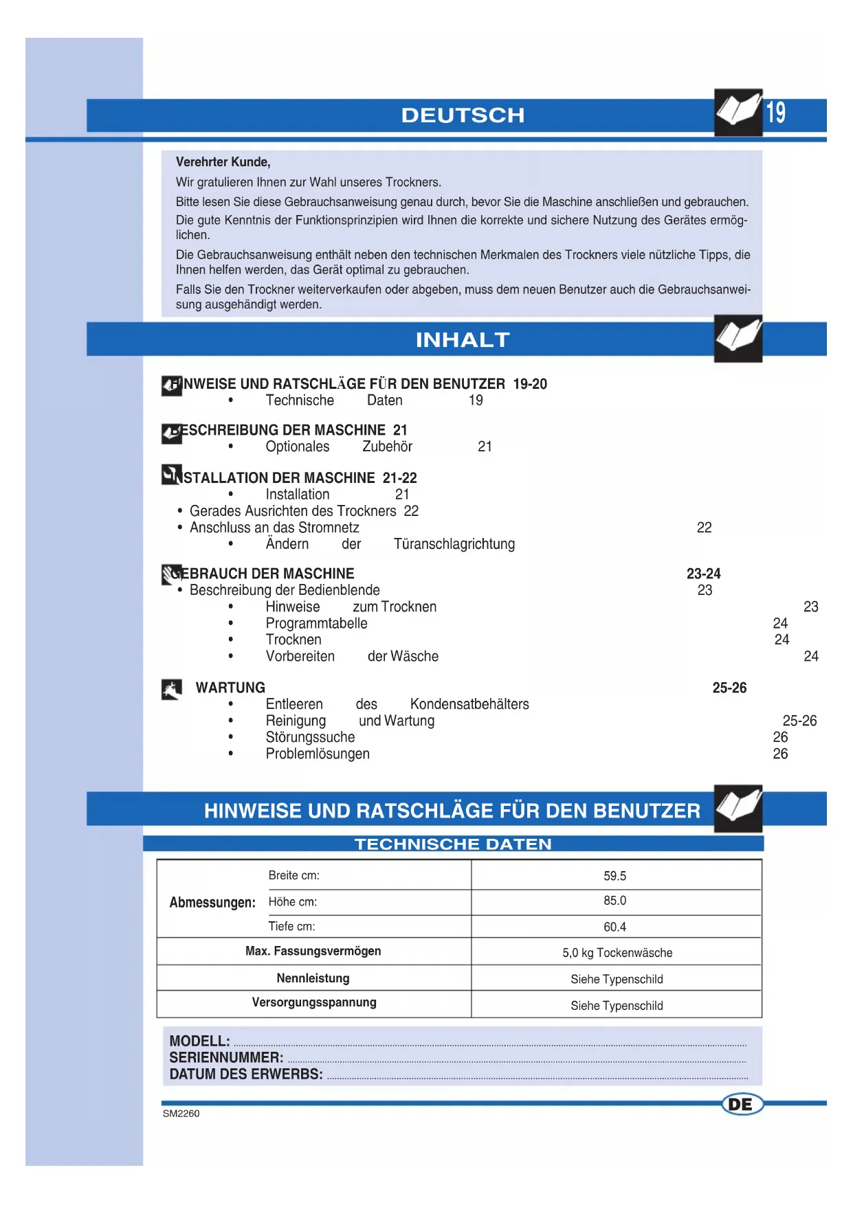 5,0 kg TockenwäscheSiehe TypenschildSiehe TypenschildMax. FassungsvermögenNennleistungVersorgungsspannung TECHNISCHE DATEN HINWEISE UND RATSCHLÄGE FÜR DEN BENUTZER 19-20
