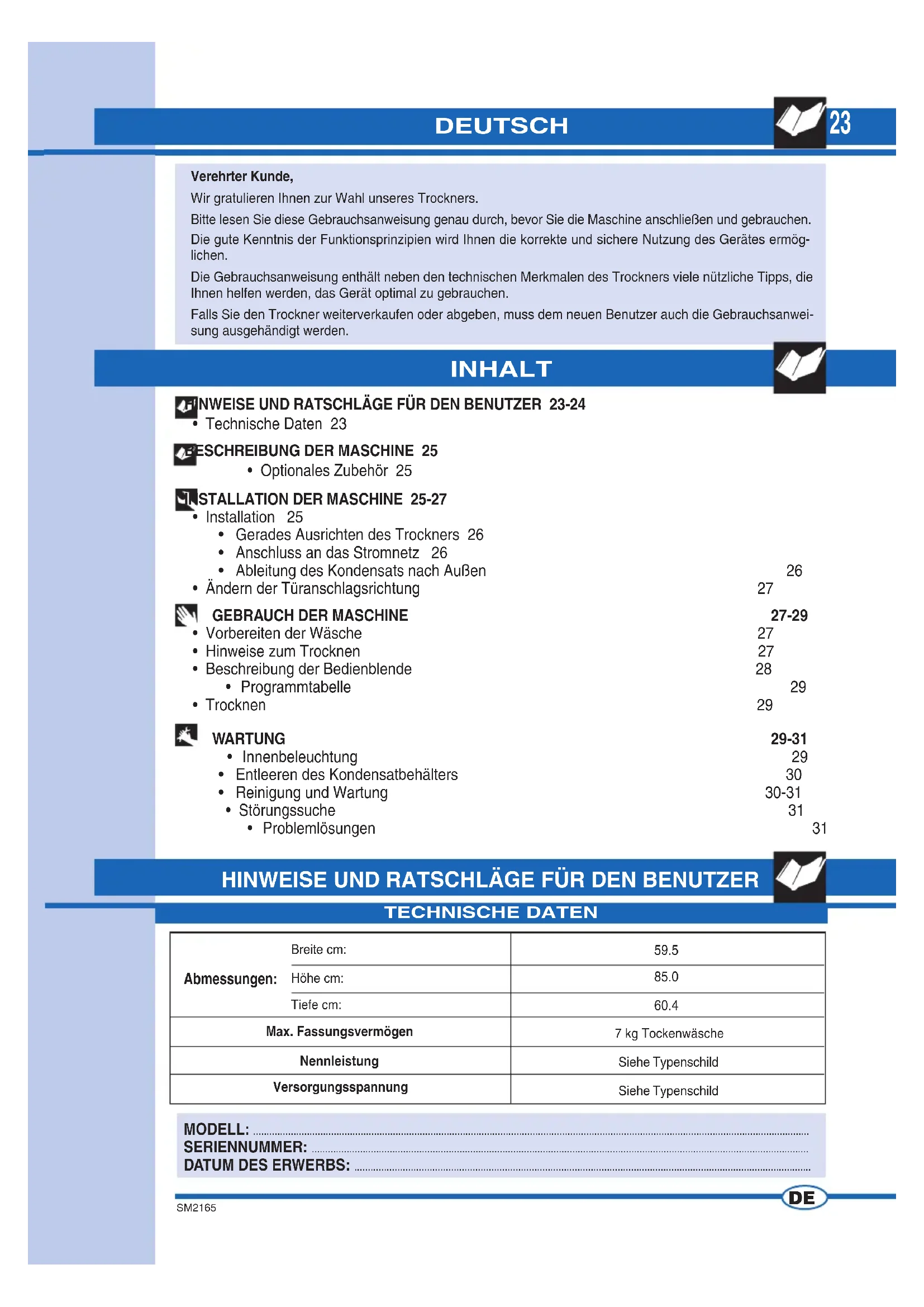 SM2165 NOTES23 SM2165 INHALT MODELL: ............................................................................................................................................................................................................... SERIENNUMMER: ......................................................................................................................................................................................... DATUM DES ERWERBS: .......................................................................................................................................................................... DEUTSCH Verehrter Kunde, Wir gratulieren Ihnen zur Wahl unseres Trockners. Bitte lesen Sie diese Gebrauchsanweisung genau durch, bevor Sie die Maschine anschließen und gebrauchen. Die gute Kenntnis der Funktionsprinzipien wird Ihnen die korrekte und sichere Nutzung des Gerätes ermög- lichen. Die Gebrauchsanweisung enthält neben den technischen Merkmalen des Trockners viele nützliche Tipps, die Ihnen helfen werden, das Gerät optimal zu gebrauchen. Falls Sie den Trockner weiterverkaufen oder abgeben, muss dem neuen Benutzer auch die Gebrauchsanwei- sung ausgehändigt werden.