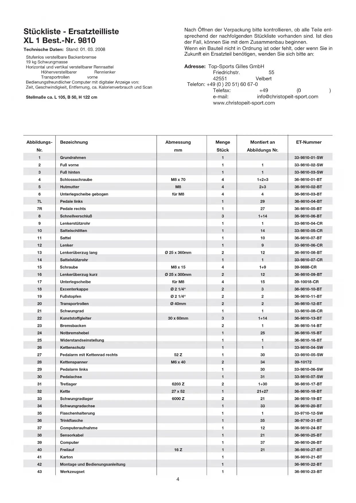 Der Schlüssel für ein erfolgreiches Programm ist ein regelmäßiges Training. Sie sollten sich einen festen Zeitpunkt und Platz pro Trainingstag einrichten und sich auch geistig auf das Training vorbereiten. Trainieren Sie nur gut gelaunt und halten Sie sich stets Ihr Ziel vor Augen. Bei kontinuierlichem Training werden Sie Tag für Tag feststellen, wie Sie sich weiterentwickeln und Ihrem persönlichen Trainingsziel Stück für Stück näher kommen. Garantiebestimmungen Die Garantie beginnt mit dem Rechnungs- bzw. Auslieferdatum und beträgt 24 Monate. Während der Garantiezeit werden eventuelle Mängel kostenlos beseitigt. Bei Feststellung eines Mangels sind Sie verpfl ichtet diesen unverzüglich dem Hersteller zu melden. Es steht im Ermessen des Herstellers die Garantie durch Ersatzteilversand oder Reparatur zu erfüllen. Die Garantieleistung gilt nur für Material oder Fabrikationsfehler. Bei Ver- schleißteilen oder Beschädigungen durch missbräuchliche oder unsach- gemäße Behandlung, Gewaltanwendung und Eingriffen die ohne vorherige Absprache mit unserer Service Abteilung vorgenommen werden, erlischt die Garantie. Bitte bewahren Sie, falls möglich, die Originalverpackung für die Dauer der Garantiezeit auf, um im Falle einer Retournierung die Ware ausreichend zu schützen.und senden Sie keine Ware unfrei zur Service Abteilung ein!9 Contents 1. Summary of Parts Page 3 2. Important Recommendations and Safety Information Page 93. Parts List Page 104. Assembly Instructions With Exploded Diagrams Page 11 - 135. Computer Instructions Page 135. Training Instructions Page 14Dear customer, We congratulate you on your purchase of this home training sports unit and hope that we will have a great deal of pleasure with it. Please take heed of the enclosed notes and instructions and follow them closely concerning assembly and use.Please do not hesitate to contact us at any time if you should have any questions. Top Sport Gilles GmbH