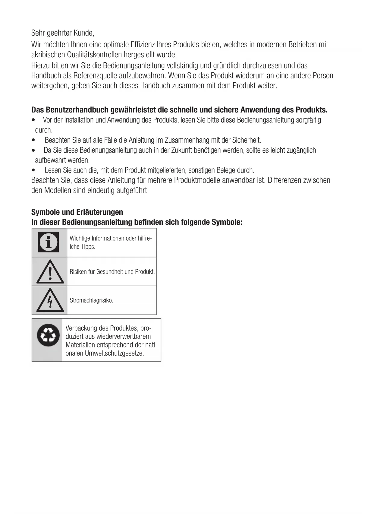 or an Authorized Service. Do not try to repair the product.Sehr geehrter Kunde, Wir möchten Ihnen eine optimale Effizienz Ihres Produkts bieten, welches in modernen Betrieben mit akribischen Qualitätskontrollen hergestellt wurde. Hierzu bitten wir Sie die Bedienungsanleitung vollständig und gründlich durchzulesen und das Handbuch als Referenzquelle aufzubewahren. Wenn Sie das Produkt wiederum an eine andere Person weitergeben, geben Sie auch dieses Handbuch zusammen mit dem Produkt weiter. Das Benutzerhandbuch gewährleistet die schnelle und sichere Anwendung des Produkts. t Vor der Installation und Anwendung des Produkts, lesen Sie bitte diese Bedienungsanleitung sorgfältig durch. t Beachten Sie auf alle Fälle die Anleitung im Zusammenhang mit der Sicherheit.