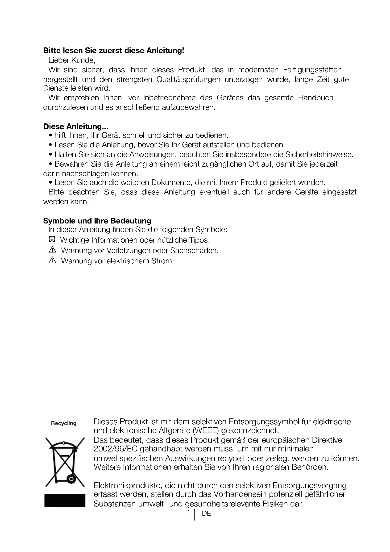 - Lesen Sie auch die weiteren Dokumente, die mit Ihrem Produkt geliefert wurden. Bitte beachten Sie, dass diese Anleitung eventuell auch für andere Geräte eingesetzt werden kann. Symbole und ihre Bedeutung In dieser Anleitung finden Sie die folgenden Symbole: C Wichtige Informationen oder nützliche Tipps. A Warnung vor Verletzungen oder Sachschäden. B Warnung vor elektrischem Strom. Dieses Produkt ist mit dem selektiven Entsorgungssymbol für elektrische und elektronische Altgeräte (WEEE) gekennzeichnet. Das bedeutet, dass dieses Produkt gemäß der europäischen Direktive 2002/96/EC gehandhabt werden muss, um mit nur minimalen umweltspezifischen Auswirkungen recycelt oder zerlegt werden zu können. Weitere Informationen erhalten Sie von Ihren regionalen Behörden. Elektronikprodukte, die nicht durch den selektiven Entsorgungsvorgang erfasst werden, stellen durch das Vorhandensein potenziell gefährlicher Substanzen umwelt- und gesundheitsrelevante Risiken dar. RecyclingDE