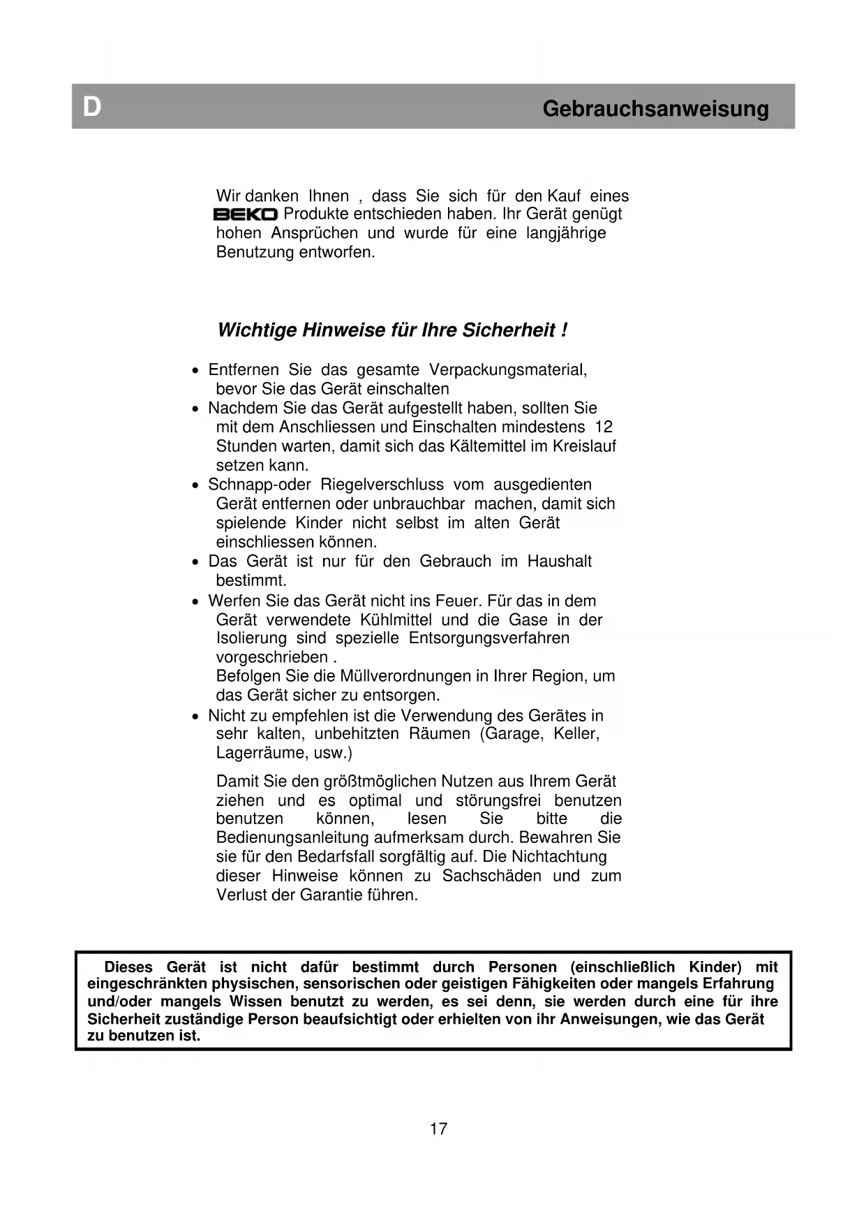 Dieses Gerät ist nicht dafür bestimmt durch Personen (einschließlich Kinder) mit eingeschränkten physischen, sensorischen oder geistigen Fähigkeiten oder mangels Erfahrung und/oder mangels Wissen benutzt zu werden, es sei denn, sie werden durch eine für ihre Sicherheit zuständige Person beaufsichtigt oder erhielten von ihr Anweisungen, wie das Gerät zu benutzen ist.D Gebrauchsanweisung Elektrischer Anschluss Bevor Sie das Gerät anschliessen, prüfen Sie unbedingt, ob die auf dem Typenschild angegebene Wechselspannung mit der Netzspannung übereinstimmt. Die elektrischen Anschlüsse müssen den gesetzlichen Vorschriften entsprechen. Schließen Sie das Gerät an eine leicht zugängliche Steckdose an . Warnung ! Dieses Gerät muss richtig geerdet werden. Reparatur- und Wa rtungsarbeiten sollten nur von Fachkräften durchgeführt werden. Reparaturen, die von nicht qualifizierten Personen ausgeführt werden, sind eine Gefahrenquelle und können gefährliche Konsequenzen für den Benutzer des Gerätes haben. Achtung! Dieses Gerät verwendet das Kühlmittel R600a, ein Gas mit hoher Umweltverträglichkeit, das aber brennbar ist. Achten Sie beim Transportieren und Aufstellen des Geräts darauf, daß keine Teile des Kühlmittelkreislaufs beschädigt werden. Vermeiden Sie bei Beschädigungen offenes Feuer oder Zündquellen, und lüften Sie den Raum, in dem sich das Gerät befindet, mehrere Minuten lang. Warnung ! Verwenden Sie zur Beschleunigung des Abtauprozesses keine mechanischen oder anderen Hilfsmittel als die vom Hersteller empfohlenen Mittel. Warnung ! Achten Sie darauf, dass der Kühlmittelkreislauf nicht beschädigt wird. Warnung ! Keine elektrische Geräte benutzen um den Abtauprozess zu beschleunigen. Verwenden Sie in der Kühl-Gefrier - Kombination keine anderen als die vom Hersteller empfohlenen elektrischen Geräte. Warnung ! Wenn die Netzanschlussleitung dieses Gerätes beschädigt wird, muss sie durch den Hersteller oder seinen Kundendienst oder eine ähnlich qualifizierte Person ersetzt werden, um Gefährdungen zu vermeiden. Transporthinweise