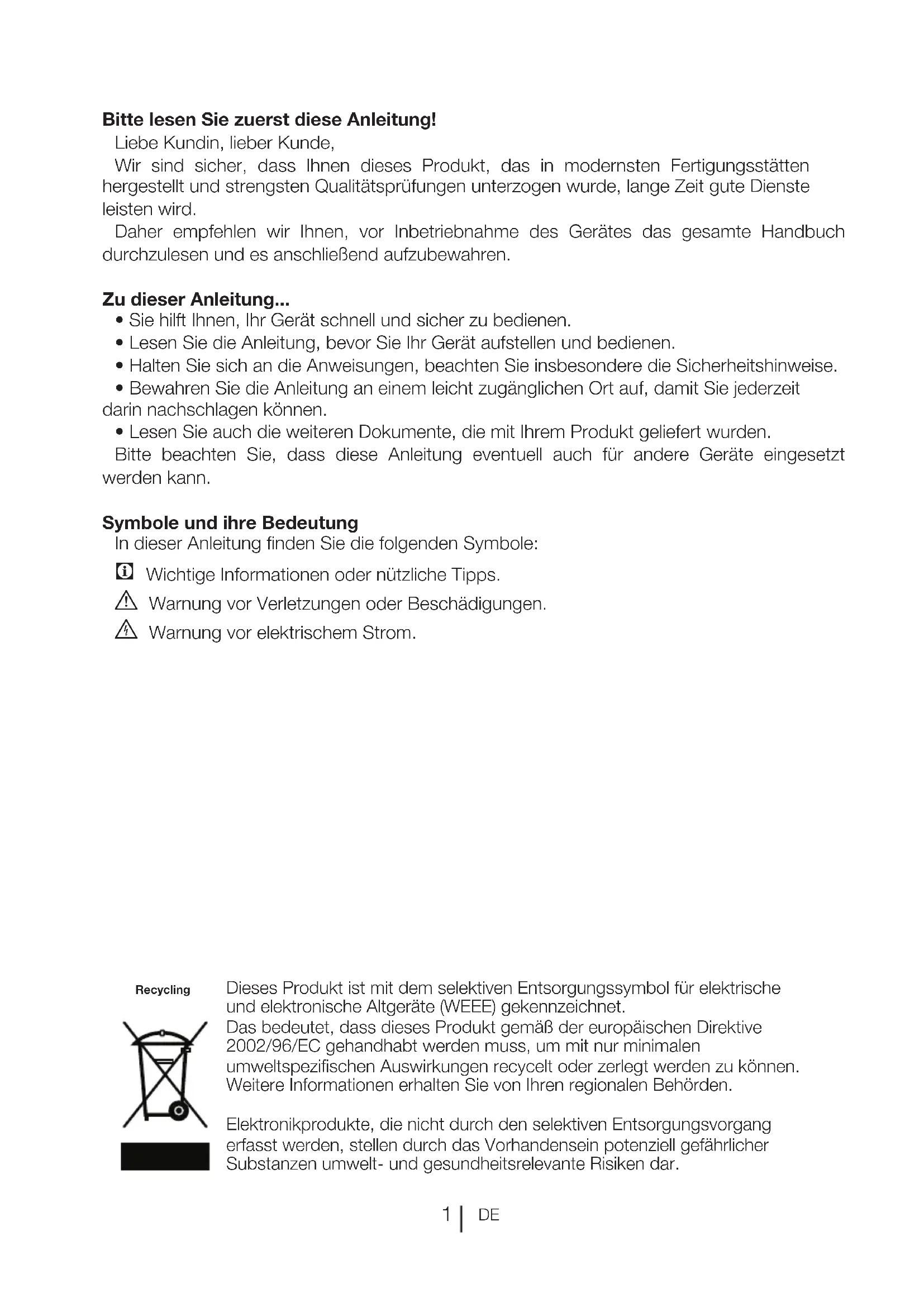 - Lesen Sie auch die weiteren Dokumente, die mit Ihrem Produkt geliefert wurden. Bitte beachten Sie, dass diese Anleitung eventuell auch für andere Geräte eingesetzt werden kann. Symbole und ihre Bedeutung In dieser Anleitung finden Sie die folgenden Symbole: C Wichtige Informationen oder nützliche Tipps. A Warnung vor Verletzungen oder Beschädigungen. B Warnung vor elektrischem Strom. Dieses Produkt ist mit dem selektiven Entsorgungssymbol für elektrische und elektronische Altgeräte (WEEE) gekennzeichnet. Das bedeutet, dass dieses Produkt gemäß der europäischen Direktive 2002/96/EC gehandhabt werden muss, um mit nur minimalen umweltspezifischen Auswirkungen recycelt oder zerlegt werden zu können. Weitere Informationen erhalten Sie von Ihren regionalen Behörden. Elektronikprodukte, die nicht durch den selektiven Entsorgungsvorgang erfasst werden, stellen durch das Vorhandensein potenziell gefährlicher Substanzen umwelt- und gesundheitsrelevante Risiken dar. RecyclingDE