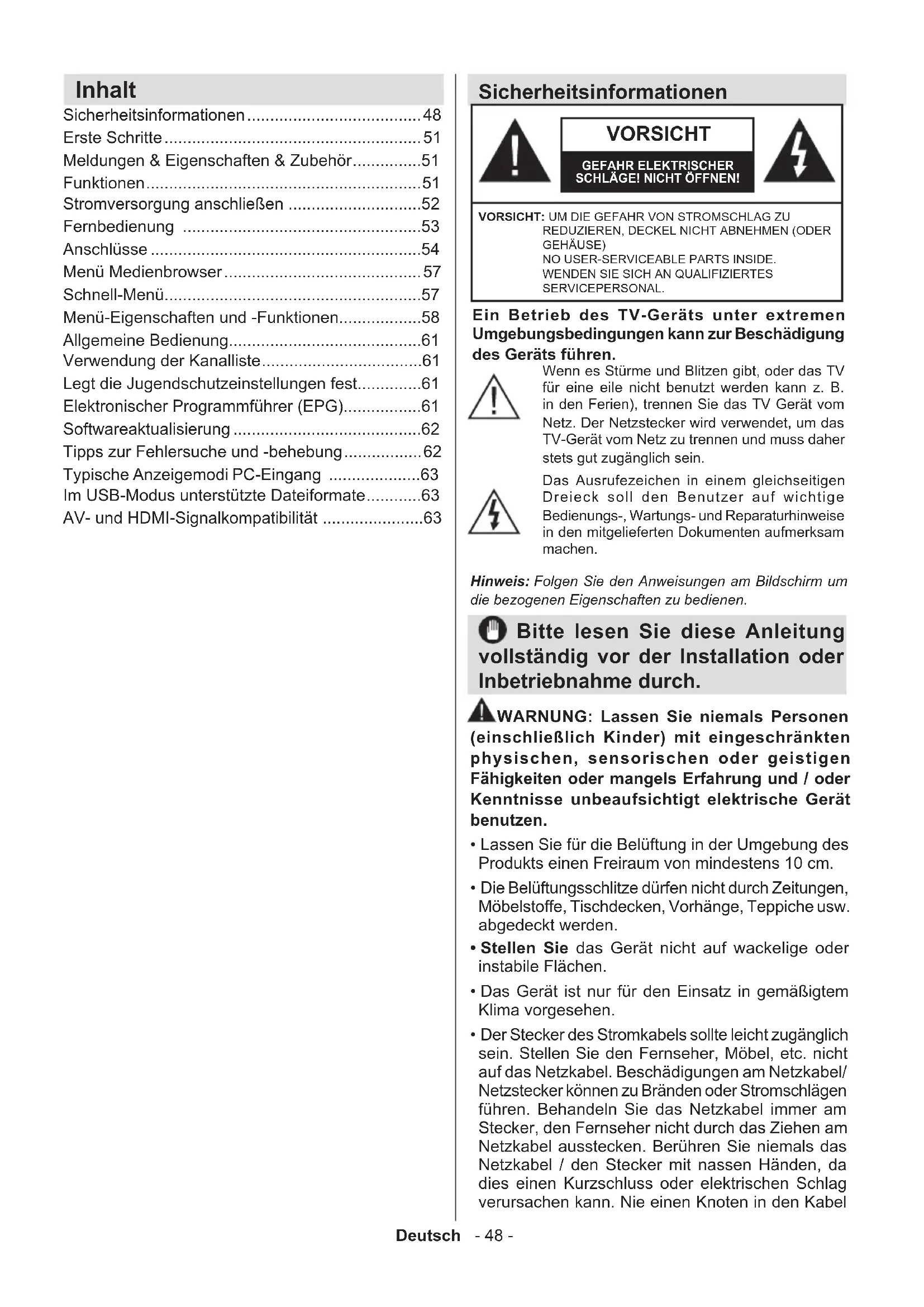 - Der Stecker des Stromkabels sollte leicht zugänglich sein. Stellen Sie den Fernseher, Möbel, etc. nicht auf das Netzkabel. Beschädigungen am Netzkabel/ Netzstecker können zu Bränden oder Stromschlägen führen. Behandeln Sie das Netzkabel immer am Stecker, den Fernseher nicht durch das Ziehen am Netzkabel ausstecken. Berühren Sie niemals das Netzkabel / den Stecker mit nassen Händen, da dies einen Kurzschluss oder elektrischen Schlag verursachen kann. Nie einen Knoten in den Kabel Inhalt Sicherheitsinformationen ...................................... 48 Erste Schritte ........................................................ 51 Meldungen & Eigenschaften & Zubehör ...............51 Funktionen ............................................................ 51 Stromversorgung anschließen .............................52 Fernbedienung ....................................................53 Anschlüsse ...........................................................54 Menü Medienbrowser ........................................... 57 Schnell-Menü........................................................57 Menü-Eigenschaften und -Funktionen..................58 Allgemeine Bedienung..........................................61 Verwendung der Kanalliste ...................................61 Legt die Jugendschutzeinstellungen fest..............61 Elektronischer Programmführer (EPG).................61 Softwareaktualisierung .........................................62 Tipps zur Fehlersuche und -behebung ................. 62 Typische Anzeigemodi PC-Eingang ....................63 Im USB-Modus unterstützte Dateiformate ............63 AV- und HDMI-Signalkompatibilität ......................63Deutsch - 49 - machen oder das Kabel mit anderen Stromkabeln binden. Wird das Netzkabel beschädigt, muss es vom Hersteller, dem Vertrieb oder einer ähnlich qualifizierten Person ersetzt werden, um eine Gefährdung zu vermeiden.