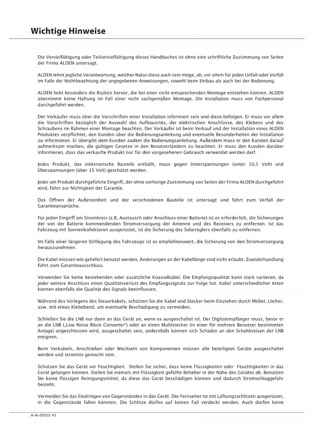 Serial number: ..............................................................................................................................................................................................................A-N-09505 43 Wichtige Hinweise Die Vervielfältigung oder Teilvervielfältigung dieses Handbuches ist ohne eine schriftliche Zustimmung von Seiten der Firma ALDEN untersagt. ALDEN lehnt jegliche Verantwortung, welcher Natur diese auch sein möge, ab, vor allem für jeden Unfall oder Vorfall im Falle der Nichtbeachtung der angegebenen Anweisungen, sowohl beim Einbau als auch bei der Bedienung. ALDEN hebt besonders die Risiken hervor, die bei einer nicht entsprechenden Montage entstehen können. ALDEN übernimmt keine Haftung im Fall einer nicht sachgemäßen Montage. Die Installation muss von Fachpersonal durchgeführt werden. Der Verkäufer muss über die Vorschriften einer Installation informiert sein und diese befolgen. Er muss vor allem die Vorschriften bezüglich der Auswahl des Aufbauortes, der elektrischen Anschlüsse, des Klebens und des Schraubens im Rahmen einer Montage beachten. Der Verkäufer ist beim Verkauf und der Installation eines ALDEN Produktes verpflichtet, den Kunden über die Bedienungsanleitung und eventuelle Besonderheiten der Installation zu informieren. Er übergibt dem Kunden zudem die Bedienungsanleitung. Außerdem muss er den Kunden darauf aufmerksam machen, die gültigen Gesetze in den Benutzerländern zu beachten. Er muss den Kunden darüber informieren, dass das verkaufte Produkt nur für den vorgesehenen Gebrauch verwendet werden darf. Jedes Produkt, das elektronische Bauteile enthällt, muss gegen Unterspannungen (unter 10,5 Volt) und Überspannungen (über 15 Volt) geschützt werden. Jeder am Produkt durchgeführte Eingriff, der ohne vorherige Zustimmung von Seiten der Firma ALDEN durchgeführt wird, führt zur Nichtigkeit der Garantie. Das Öffnen der Außeneinheit und der verschiedenen Bauteile ist untersagt und führt zum Verfall der Garantieansprüche. Für jeden Eingriff am Stromkreis (z.B. Austausch oder Anschluss einer Batterie) ist es erforderlich, die Sicherungen der von der Batterie kommendenden Stromversorgung der Antenne und des Receivers zu entfernen. Ist das Fahrzeug mit Sonnenkollektoren ausgerüstet, ist die Sicherung des Solarreglers ebenfalls zu entfernen. Im Falle einer längeren Stilllegung des Fahrzeugs ist es empfehlenswert, die Sicherung von den Stromversorgung herauszunehmen. Die Kabel müssen wie geliefert benutzt werden, Änderungen an der Kabellänge sind nicht erlaubt. Zuwiderhandlung führt zum Garantieausschluss. Verwenden Sie keine bestehenden oder zusätzliche Koaxialkabel. Die Empfangsqualität kann stark variieren, da jeder weitere Anschluss einen Qualitätsverlust des Empfangssignals zur Folge hat. Kabel unterschiedlicher Arten können ebenfalls die Qualität des Signals beeinflussen. Während des Verlegens des Steuerkabels, schützen Sie die Kabel und Stecker beim Einziehen durch Möbel, Löcher, usw. mit etwas Klebeband, um eventuelle Beschädigung zu vermeiden. Schließen Sie die LNB nur dann an das Gerät an, wenn es ausgeschaltet ist. Der Digitalempfänger muss, bevor er an die LNB („Low Noise Block Converter“) oder an einen Multistecker (in einer für mehrere Benutzer bestimmten Anlage) angeschlossen wird, ausgeschaltet sein, andernfalls können sich Schäden an den Schaltkreisen der LNB ereignen. Beim Verkabeln, Anschließen oder Wechseln von Komponenten müssen alle beteiligten Geräte ausgeschaltet werden und stromlos gemacht sein. Schützen Sie das Gerät vor Feuchtigkeit. Stellen Sie sicher, dass keine Flüssigkeiten oder Feuchtigkeiten in das Gerät gelangen können. Stellen Sie niemals mit Flüssigkeit gefüllte Behälter in der Nähe des Gerätes ab. Benutzen Sie keine flüssigen Reinigungsmittel, da diese das Gerät beschädigen können und dadurch Stromschlaggefahr besteht. Vermeiden Sie das Eindringen von Gegenständen in das Gerät. Der Fernseher ist mit Lüftungsschlitzen ausgerüstet, in die Gegenstände fallen könnten. Die Schlitze dürfen auf keinen Fall verdeckt werden. Auch dürfen keineA-N-0950544 Gegenstände auf dem Fernseher abgestellt werden. Schutz vor Blitzschlägen: im Falle eines starkem Gewitter wird empfohlen, den Empfänger auszuschalten, den Netzstecker zu ziehen und das Kabel von der Antenne zu trennen. Verwenden Sie nur original Ersatz- und Zubehörteile, oder die von einem speziellen Einzelhändler empfohlenen Teile; andernfalls wird die Garantie nichtig. Jeder Eingriff am Gerät muss von qualifizierten Technikern durchgeführt werden. Sorgen Sie für eine angemessene Lüftung: Decken Sie niemals Lüftungsschlitze des Gehäuses ab. Wenn der Fernseher eingeschaltet ist, muss er sich auf einer festen und horizontalen Position befinden, abseits von direkten Sonnenstrahlen und weit weg von Wärmequellen, wie z.B. Heizung und Gebläse. Das Gerät muss weiträumig frei stehen, um eine angemessene Lüftung zu ermöglichen. Setzen Sie den Fernseher und dessen Zubehör nicht der direkten Sonneneinstrahlung aus, auch nicht der Nähe von Heizgeräten, Regen oder hoher Luftfeuchtigkeit, starken Vibrationen oder Stößen, Lautsprechermagneten oder Transformatoren, die das Gerät irreparabel beschädigen können. Reinigen Sie das Gerät nicht mit Alkohol- oder Ammoniakhaltigen Reinigungsmitteln. Benutzen Sie stattdessen ein weiches und sauberes Tuch, befeuchtet mit Seifenlauge, nachdem das Gerät ausgeschaltet und der Netzstecker gezogen wurde. Verschließen Sie nicht die Ventilationsöffnungen des Gerätes, da es sonst zu Hitzestau, Stromschlag, Fehlfunktionen und Beschädigungen bis hin zum Brand des Gerätes kommen kann. Öffnen Sie das Gerät nicht, um sich nicht der Gefahr eines elektrischen Stromschlages auszusetzen. Wartung und Pflege des Gerätes hat ausschließlich durch ein ausreichend qualifiziertes Fachpersonal zu erfolgen. Entfernen Sie den 12Volt-Netzstecker 