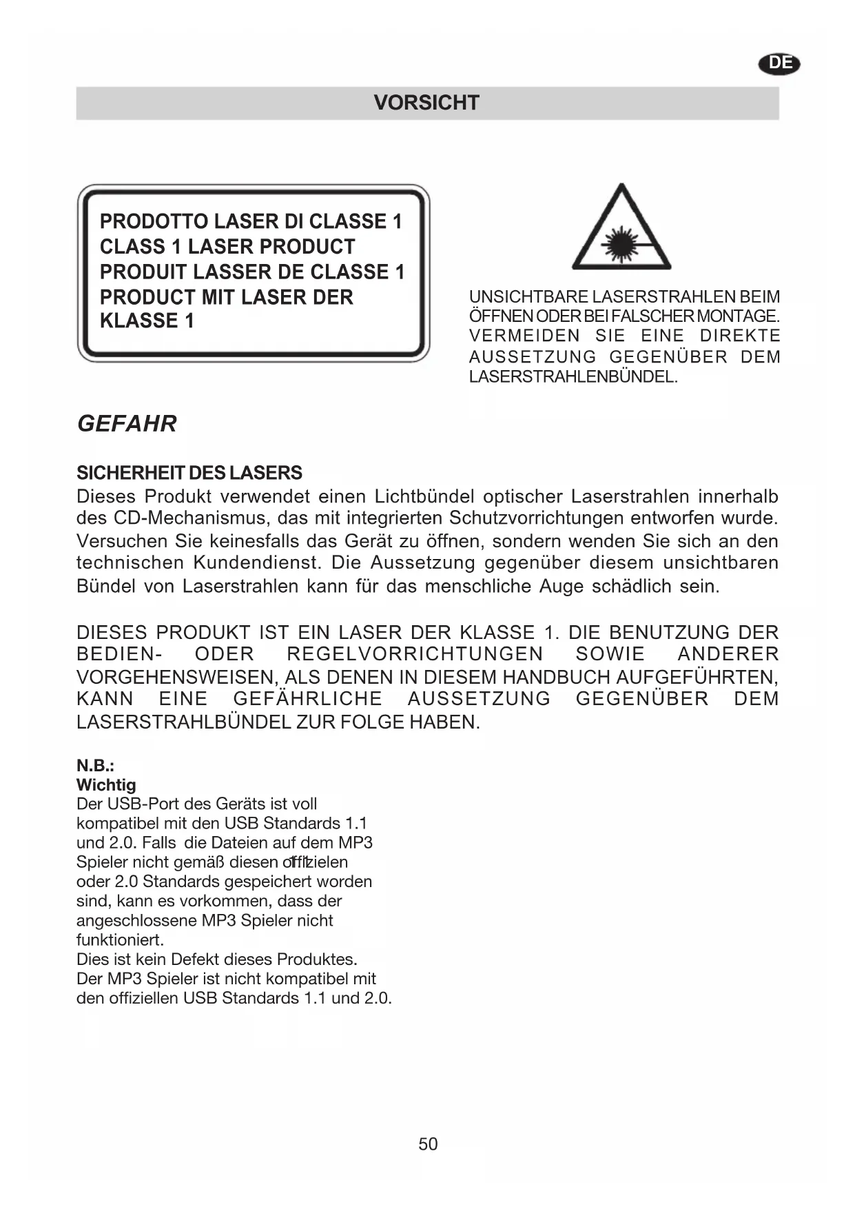 Dieses Produkt verwendet einen Lichtbündel optischer Laserstrahlen innerhalb des CD-Mechanismus, das mit integrierten Schutzvorrichtungen entworfen wurde. Versuchen Sie keinesfalls das Gerät zu öffnen, sondern wenden Sie sich an den technischen Kundendienst. Die Aussetzung gegenüber这点em unsichtbaren Bündel von Laserstrahlen kann für das menschliche Auge schädlich sein.