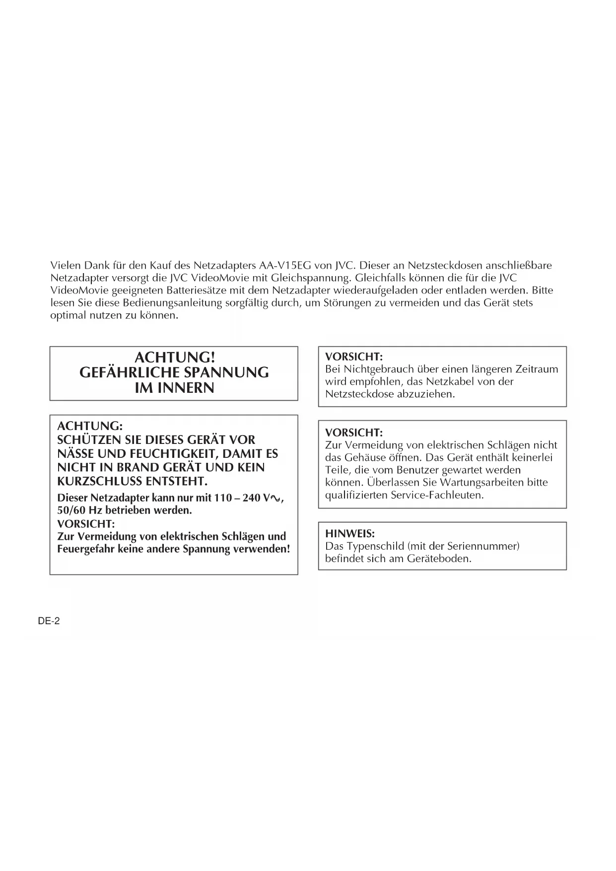 IM INNERN VORSICHT: Zur Vermeidung von elektrischen Schlägen nicht das Gehäuse öffnen. Das Gerät enthält keinerlei Teile, die vom Benutzer gewartet werden können. Überlassen Sie Wartungsarbeiten bitte qualifizierten Service-Fachleuten. HINWEIS: Das Typenschild (mit der Seriennummer) befindet sich am Geräteboden.DE-3 Der Netzadapter/Batterielader AA-V15EG ist ausschließlich für den JVC Camcorder vorgesehen.