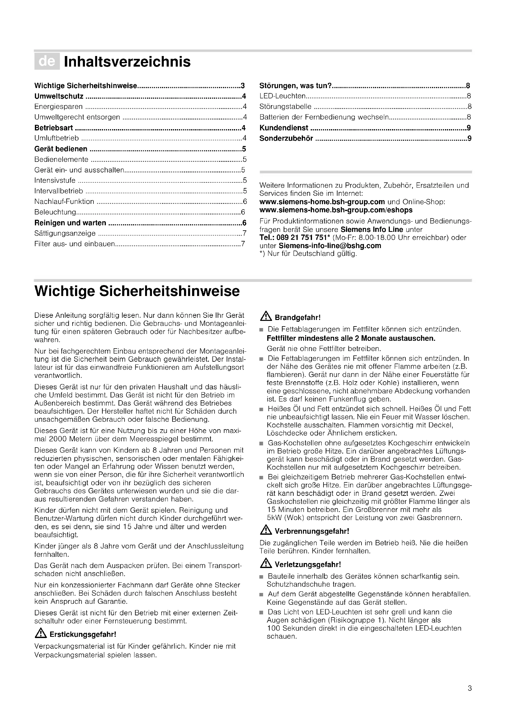 - Sonderzubehör Produktinfo Weitere Informationen zu Produkten, Zubehör, Ersatzteilen und Services finden Sie im Internet: www.siemens-home.bsh-group.com und Online-Shop: www.siemens-home.bsh-group.com/eshops Für Produktinformationen sowie Anwendungs- und Bedienungs- fragen berät Sie unsere Siemens Info Line unter Tel.: 089 21 751 751* (Mo-Fr: 8.00-18.00 Uhr erreichbar) oder unter Siemens-info-line@bshg.com *) Nur für Deutschland gültig. Wichtige Sicherheitshinweise Diese Anleitung sorgfältig lesen. Nur dann können Sie Ihr Gerät sicher und richtig bedienen. Die Gebrauchs- und Montageanlei- tung für einen späteren Gebrauch oder für Nachbesitzer aufbe- wahren. Nur bei fachgerechtem Einbau entsprechend der Montageanlei- tung ist die Sicherheit beim Gebrauch gewährleistet. Der Instal- lateur ist für das einwandfreie Funktionieren am Aufstellungsort verantwortlich. Dieses Gerät ist nur für den privaten Haushalt und das häusli- che Umfeld bestimmt. Das Gerät ist nicht für den Betrieb im Außenbereich bestimmt. Das Gerät während des Betriebes beaufsichtigen. Der Hersteller haftet nicht für Schäden durch unsachgemäßen Gebrauch oder falsche Bedienung. Dieses Gerät ist für eine Nutzung bis zu einer Höhe von maxi- mal 2000 Metern über dem Meeresspiegel bestimmt. Dieses Gerät kann von Kindern ab 8 Jahren und Personen mit reduzierten physischen, sensorischen oder mentalen Fähigkei- ten oder Mangel an Erfahrung oder Wissen benutzt werden, wenn sie von einer Person, die für ihre Sicherheit verantwortlich ist, beaufsichtigt oder von ihr bezüglich des sicheren Gebrauchs des Gerätes unterwiesen wurden und sie die dar- aus resultierenden Gefahren verstanden haben. Kinder dürfen nicht mit dem Gerät spielen. Reinigung und Benutzer-Wartung dürfen nicht durch Kinder durchgeführt wer- den, es sei denn, sie sind 15 Jahre und älter und werden beaufsichtigt. Kinder jünger als 8 Jahre vom Gerät und der Anschlussleitung fernhalten. Das Gerät nach dem Auspacken prüfen. Bei einem Transport- schaden nicht anschließen. Nur ein konzessionierter Fachmann darf Geräte ohne Stecker anschließen. Bei Schäden durch falschen Anschluss besteht kein Anspruch auf Garantie. Dieses Gerät ist nicht für den Betrieb mit einer externen Zeit- schaltuhr oder einer Fernsteuerung bestimmt. : Erstickungsgefahr! Verpackungsmaterial ist für Kinder gefährlich. Kinder nie mit Verpackungsmaterial spielen lassen. : Brandgefahr! ■ Die Fettablagerungen im Fettfilter können sich entzünden. Fettfilter mindestens alle 2 Monate austauschen. Gerät nie ohne Fettfilter betreiben. Brandgefahr!■ Die Fettablagerungen im Fettfilter können sich entzünden. In der Nähe des Gerätes nie mit offener Flamme arbeiten (z.B. flambieren). Gerät nur dann in der Nähe einer Feuerstätte für feste Brennstoffe (z.B. Holz oder Kohle) installieren, wenn eine geschlossene, nicht abnehmbare Abdeckung vorhanden ist. Es darf keinen Funkenflug geben. Brandgefahr!■ Heißes Öl und Fett entzündet sich schnell. Heißes Öl und Fett nie unbeaufsichtigt lassen. Nie ein Feuer mit Wasser löschen. Kochstelle ausschalten. Flammen vorsichtig mit Deckel, Löschdecke oder Ähnlichem ersticken. Brandgefahr!■ Gas-Kochstellen ohne aufgesetztes Kochgeschirr entwickeln im Betrieb große Hitze. Ein darüber angebrachtes Lüftungs- gerät kann beschädigt oder in Brand gesetzt werden. Gas- Kochstellen nur mit aufgesetztem Kochgeschirr betreiben. Brandgefahr!■ Bei gleichzeitigem Betrieb mehrerer Gas-Kochstellen entwi- ckelt sich große Hitze. Ein darüber angebrachtes Lüftungsge- rät kann beschädigt oder in Brand gesetzt werden. Zwei Gaskochstellen nie gleichzeitig mit größter Flamme länger als 15 Minuten betreiben. Ein Großbrenner mit mehr als 5kW (Wok) entspricht der Leistung von zwei Gasbrennern. : Verbrennungsgefahr! Die zugänglichen Teile werden im Betrieb heiß. Nie die heißen Teile berühren. Kinder fernhalten. : Verletzungsgefahr! ■ Bauteile innerhalb des Gerätes können scharfkantig sein. Schutzhandschuhe tragen. Verletzungsgefahr!■ Auf dem Gerät abgestellte Gegenstände können herabfallen. Keine Gegenstände auf das Gerät stellen. Verletzungsgefahr!■ Das Licht von LED-Leuchten ist sehr grell und kann die Augen schädigen (Risikogruppe 1). Nicht länger als 100 Sekunden direkt in die eingeschalteten LED-Leuchten schauen.4 : Stromschlaggefahr! ■ Ein defektes Gerät kann einen Stromschlag verursachen. Nie ein defektes Gerät einschalten. Netzstecker ziehen oder Sicherung im Sicherungskasten ausschalten. Kundendienst rufen. Stromschlaggefahr! ■ Unsachgemäße Reparaturen sind gefährlich. Nur ein von uns geschulter Kundendienst-Techniker darf Reparaturen durch- führen und beschädigte Anschlussleitungen austauschen. Ist das Gerät defekt, Netzstecker ziehen oder Sicherung im Sicherungskasten ausschalten. Kundendienst rufen. Stromschlaggefahr! ■ Eindringende Feuchtigkeit kann einen Stromschlag verursa- chen. Keinen Hochdruckreiniger oder Dampfreiniger verwen- den. Ursachen für Schäden Achtung! Beschädigungsgefahr durch Korrosionsschäden. Gerät beim Kochen immer einschalten, um Kondenswasserbildung zu ver- meiden. Kondenswasser kann zu Korrosionsschäden führen. Beschädigungsgefahr durch eindringende Nässe in die Elektro- nik. Bedienelemente nie mit nassem Tuch reinigen. Oberflächenbeschädigung durch falsche Reinigung. Edel- stahlflächen nur in Schliffrichtung reinigen. Für Bedienelemente keinen Edelstahlreiniger verwenden. Oberflächenbeschädigung durch scharfe oder scheuernde Rei- nigungsmittel. Scharfe und scheuernde Reinigungsmittel nie verwenden. Beschädigungsgefahr durch Kondensat-Rücklauf. Abluftkanal vom Gerät aus leicht abfallend installieren (1° Gefälle). Umweltschutz Ihr neues Gerät ist besonders energieeffizient. Hier erhalten Sie Tipps, wie Sie beim Umgang mit Ihrem Gerät noch mehr Ener- gie sparen können und wie Sie das Gerät richtig entsorgen. Energiesparen ■ Beim