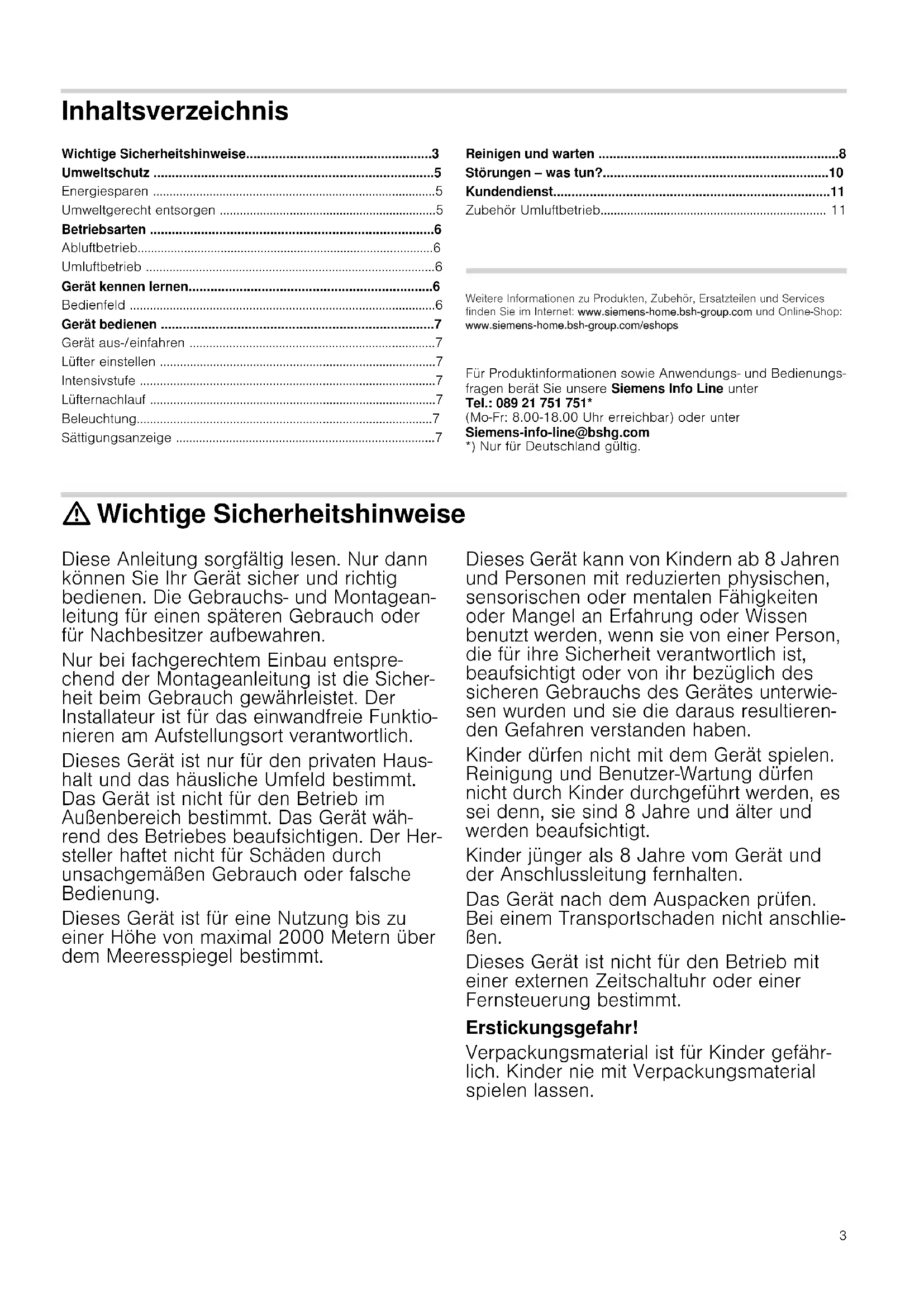 - Zubehör Umluftbetrieb Produktinfo Weitere Informationen zu Produkten, Zubehör, Ersatzteilen und Services finden Sie im Internet: www.siemens-home.com und Online-Shop: www.siemens-eshop.com Für Produktinformationen sowie Anwendungs- und Bedienungs- fragen berät Sie unsere Siemens Info Line unter Tel.: 089 21 751 751* (Mo-Fr: 8.00-18.00 Uhr erreichbar) oder unter Siemens-info-line@bshg.com *) Nur für Deutschland gültig. : Wichtige Sicherheitshinweise Diese Anleitung sorgfältig lesen. Nur dann können Sie Ihr Gerät sicher und richtig bedienen. Die Gebrauchs- und Montagean- leitung für einen späteren Gebrauch oder für Nachbesitzer aufbewahren. Nur bei fachgerechtem Einbau entspre- chend der Montageanleitung ist die Sicher- heit beim Gebrauch gewährleistet. Der Installateur ist für das einwandfreie Funktio- nieren am Aufstellungsort verantwortlich. Dieses Gerät ist nur für den privaten Haus- halt und das häusliche Umfeld bestimmt. Das Gerät ist nicht für den Betrieb im Außenbereich bestimmt. Das Gerät wäh- rend des Betriebes beaufsichtigen. Der Her- steller haftet nicht für Schäden durch unsachgemäßen Gebrauch oder falsche Bedienung. Dieses Gerät ist für eine Nutzung bis zu einer Höhe von maximal 2000 Metern über dem Meeresspiegel bestimmt. Dieses Gerät kann von Kindern ab 8 Jahren und Personen mit reduzierten physischen, sensorischen oder mentalen Fähigkeiten oder Mangel an Erfahrung oder Wissen benutzt werden, wenn sie von einer Person, die für ihre Sicherheit verantwortlich ist, beaufsichtigt oder von ihr bezüglich des sicheren Gebrauchs des Gerätes unterwie- sen wurden und sie die daraus resultieren- den Gefahren verstanden haben. Kinder dürfen nicht mit dem Gerät spielen. Reinigung und Benutzer-Wartung dürfen nicht durch Kinder durchgeführt werden, es sei denn, sie sind 8 Jahre und älter und werden beaufsichtigt. Kinder jünger als 8 Jahre vom Gerät und der Anschlussleitung fernhalten. Das Gerät nach dem Auspacken prüfen. Bei einem Transportschaden nicht anschlie- ßen. Dieses Gerät ist nicht für den Betrieb mit einer externen Zeitschaltuhr oder einer Fernsteuerung bestimmt. Erstickungsgefahr! Verpackungsmaterial ist für Kinder gefähr- lich. Kinder nie mit Verpackungsmaterial spielen lassen. Weitere Informationen zu Produkten, Zubehör, Ersatzteilen und Services finden Sie im Internet: www.siemens-home.bsh-group.com und Online-Shop: www.siemens-home.bsh-group.com/eshops4 Lebensgefahr! Zurückgesaugte Verbrennungsgase können zu Vergiftungen führen. Immer für ausreichend Zuluft sorgen, wenn das Gerät im Abluftbetrieb gleichzeitig mit einer raumluftabhängigen Feuerstätte ver- wendet wird. Raumluftabhängige Feuerstätten (z. B. gas-, öl-, holz- oder kohlebetriebene Heizgeräte, Durchlauferhitzer, Warmwasserbereiter) beziehen Verbrennungsluft aus dem Auf- stellraum und führen die Abgase durch eine Abgasanlage (z. B. Kamin) ins Freie. In Verbindung mit einer eingeschalteten Dunstabzugshaube wird der Küche und den benachbarten Räumen Raumluft entzogen - ohne ausreichende Zuluft entsteht ein Unterdruck. Giftige Gase aus dem Kamin oder Abzugsschacht werden in die Wohn- räume zurückgesaugt. p. 11