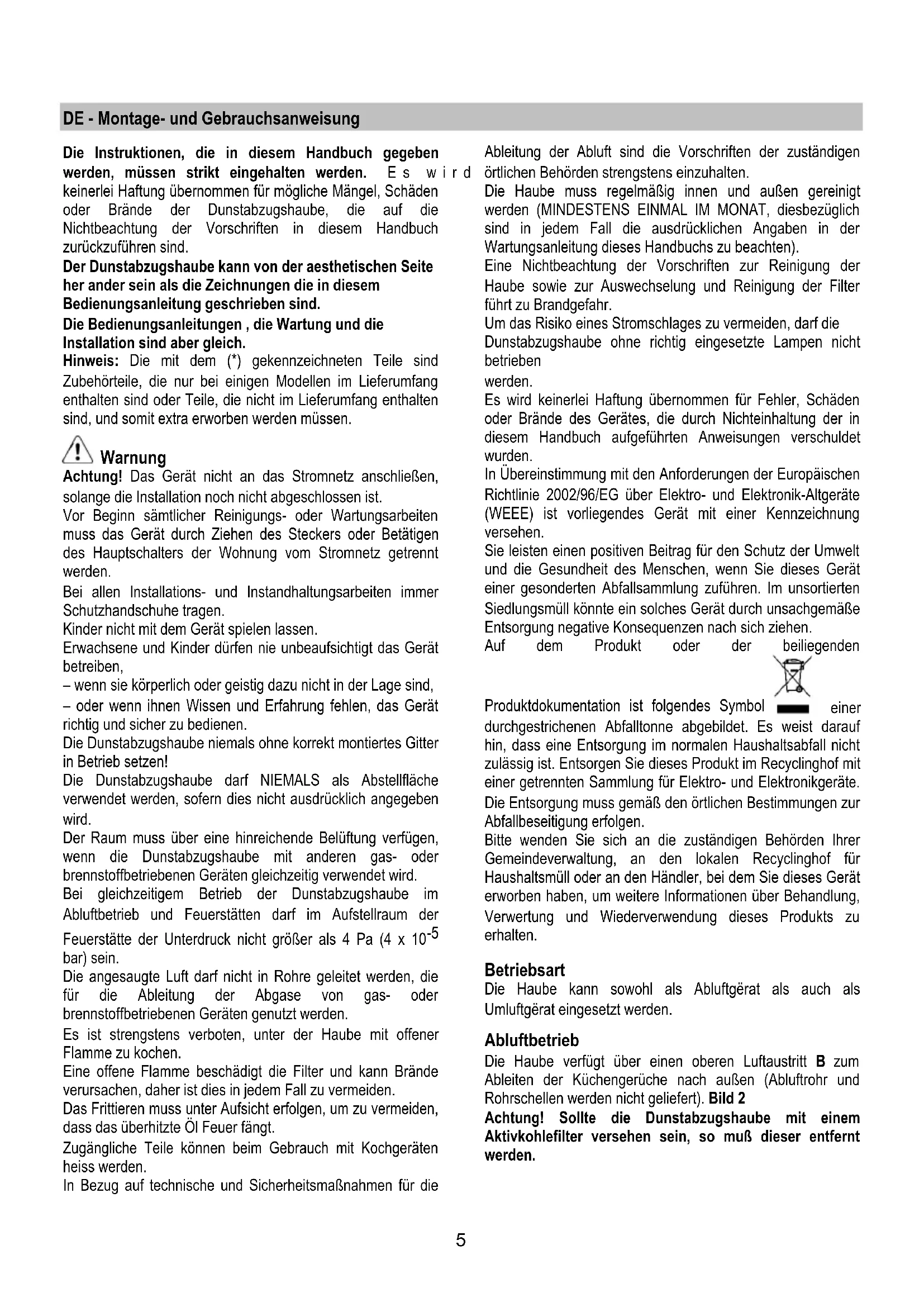 bar) sein. Die angesaugte Luft darf nicht in Rohre geleitet werden, die für die Ableitung der Abgase von gas- oder brennstoffbetriebenen Geräten genutzt werden. Es ist strengstens verboten, unter der Haube mit offener Flamme zu kochen. Eine offene Flamme beschädigt die Filter und kann Brände verursachen, daher ist dies in jedem Fall zu vermeiden. Das Frittieren muss unter Aufsicht erfolgen, um zu vermeiden, dass das überhitzte Öl Feuer fängt. Zugängliche Teile können beim Gebrauch mit Kochgeräten heiss werden. In Bezug auf technische und Sicherheitsmaßnahmen für die Ableitung der Abluft sind die Vorschriften der zuständigen örtlichen Behörden strengstens einzuhalten. Die Haube muss regelmäßig innen und außen gereinigt werden (MINDESTENS EINMAL IM MONAT, diesbezüglich sind in jedem Fall die ausdrücklichen Angaben in der Wartungsanleitung dieses Handbuchs zu beachten). Eine Nichtbeachtung der Vorschriften zur Reinigung der Haube sowie zur Auswechselung und Reinigung der Filter führt zu Brandgefahr. Um das Risiko eines Stromschlages zu vermeiden, darf die Dunstabzugshaube ohne richtig eingesetzte Lampen nicht betrieben werden. Es wird keinerlei Haftung übernommen für Fehler, Schäden oder Brände des Gerätes, die durch Nichteinhaltung der in diesem Handbuch aufgeführten Anweisungen verschuldet wurden. In Übereinstimmung mit den Anforderungen der Europäischen Richtlinie 2002/96/EG über Elektro- und Elektronik-Altgeräte (WEEE) ist vorliegendes Gerät mit einer Kennzeichnung versehen. Sie leisten einen positiven Beitrag für den Schutz der Umwelt und die Gesundheit des Menschen, wenn Sie dieses Gerät einer gesonderten Abfallsammlung zuführen. Im unsortierten Siedlungsmüll könnte ein solches Gerät durch unsachgemäße Entsorgung negative Konsequenzen nach sich ziehen. Auf dem Produkt oder der beiliegenden Produktdokumentation ist folgendes Symbol einer durchgestrichenen Abfalltonne abgebildet. Es weist darauf hin, dass eine Entsorgung im normalen Haushaltsabfall nicht zulässig ist. Entsorgen Sie dieses Produkt im Recyclinghof mit einer getrennten Sammlung für Elektro- und Elektronikgeräte. Die Entsorgung muss gemäß den örtlichen Bestimmungen zur Abfallbeseitigung erfolgen. Bitte wenden Sie sich an die zuständigen Behörden Ihrer Gemeindeverwaltung, an den lokalen Recyclinghof für Haushaltsmüll oder an den Händler, bei dem Sie dieses Gerät erworben haben, um weitere Informationen über Behandlung, Verwertung und Wiederverwendung dieses Produkts zu erhalten. Betriebsart Die Haube kann sowohl als Abluftgërat als auch als Umluftgërat eingesetzt werden. Abluftbetrieb Die Haube verfügt über einen oberen Luftaustritt B zum Ableiten der Küchengerüche nach außen (Abluftrohr und Rohrschellen werden nicht geliefert). Bild 2 Achtung! Sollte die Dunstabzugshaube mit einem Aktivkohlefilter versehen sein, so muß dieser entfernt werden.6 Umluftbetrieb Besteht keine Möglichkeit, die Abluft ins Freie abzuleiten, ist die Verwendung eines AktivKohlefilters vorgesehen. Die luft wird durch den Filter gereinigt und strömt in den Raum zurück. Die Luft wird durch ein Rohr, das durch den Hängeschrank verläuf und den Ringstutzen angeschlossen wird, wieder in den Raum zurückgeführt. Für Hauben mit 2 Motoren sind 2 Kohlefilter notwendig und für Hauben mit 1 Motor 1 Kohlefilter. Achtung! Sollte die Dunstabzugshaube nicht mit einem Aktivkohlefilter versehen sein, ist dieser zu bestellen und vor Inbetriebnahme des Gerätes einzusetzen. Modelle ohne Saugmotor funktionieren nur mit Abluftbetrieb und müssen an eine externe Saugeinheit (nicht im Lieferumfang enthalten) angeschlossen werden. Die Anschlussanleitungen liegen der externe Saugeinheit bei. Befestigung Der Abstand zwischen der Abstellfläche auf dem Kochfeld und der Unterseite der Dunstabzugshaube darf 60cm im Fall von elektrischen Kochfeldern und 70cm im Fall von Gas- oder kombinierten Herden nicht unterschreiten. Wenn die Installationsanweisungen des Gaskochgeräts einen größeren Abstand vorgeben, ist dieser zu berücksichtigen. Elektrischer Anschluss Die Netzspannung muss der Spannung entsprechen, die auf dem Betriebsdatenschild im Innern der Haube angegeben ist. Sofern die Haube einen Netzstecker hat, ist dieser an zugänglicher Stelle an eine den geltenden Vorschriften entsprechende Steckdose anzuschließen. Bei einer Haube ohne Stecker (direkter Netzanschluss) oder falls der Stecker nicht zugänglich ist, ist ein normgerechter zweipoliger Schalter anzubringen, der unter Umständen der Überspannung Kategorie III entsprechend den Installationsregeln ein vollständiges Trennen vom Netz garantiert. Hinweis: Bevor man den Stromkreis der Dunstabzugshaube an die Netzversorgung verbindet und den richtigen Betrieb zu ueberpruefen, bitte immer kontrollieren dass die Netzversorgung immer richtig montiert worden wird. Hinweis! Vor der Inbetriebnahme muss sichergestellt sein, dass die Netzversorgung (Steckdose) ordnungsgemäß montiert wurde. Montage Bevor Sie mit der Montage beginnen:
