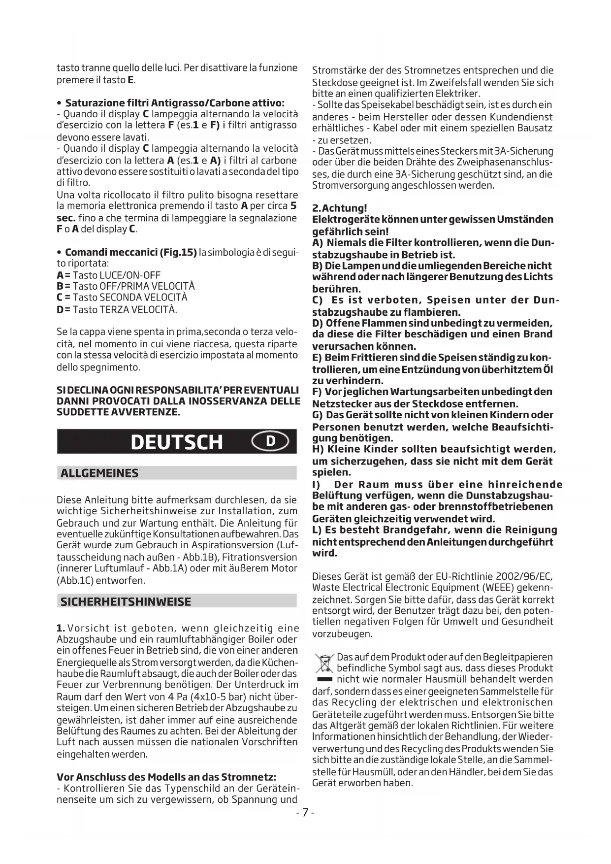 - MechanischeSteuerung(Abb.15)die Symbole sind im Folgenden aufgeführt: A = Taste LICHT/ON-OFF B = Taste OFF/ERSTE GESCHWINDIGKEIT C = Taste ZWEITE GESCHWINDIGKEIT D = Taste DRITTE GESCHWINDIGKEIT. Sollte die Abzugshaube in erster, zweiter oder dritter Geschwindigkeit ausgeschaltet werden, nimmt diese den Betrieb in derselben Geschwindigkeit wieder auf, sobald sie erneut eingeschaltet wird. FÜR SCHÄDEN, DIE AUF DIE NICHTBEACHTUNG DER