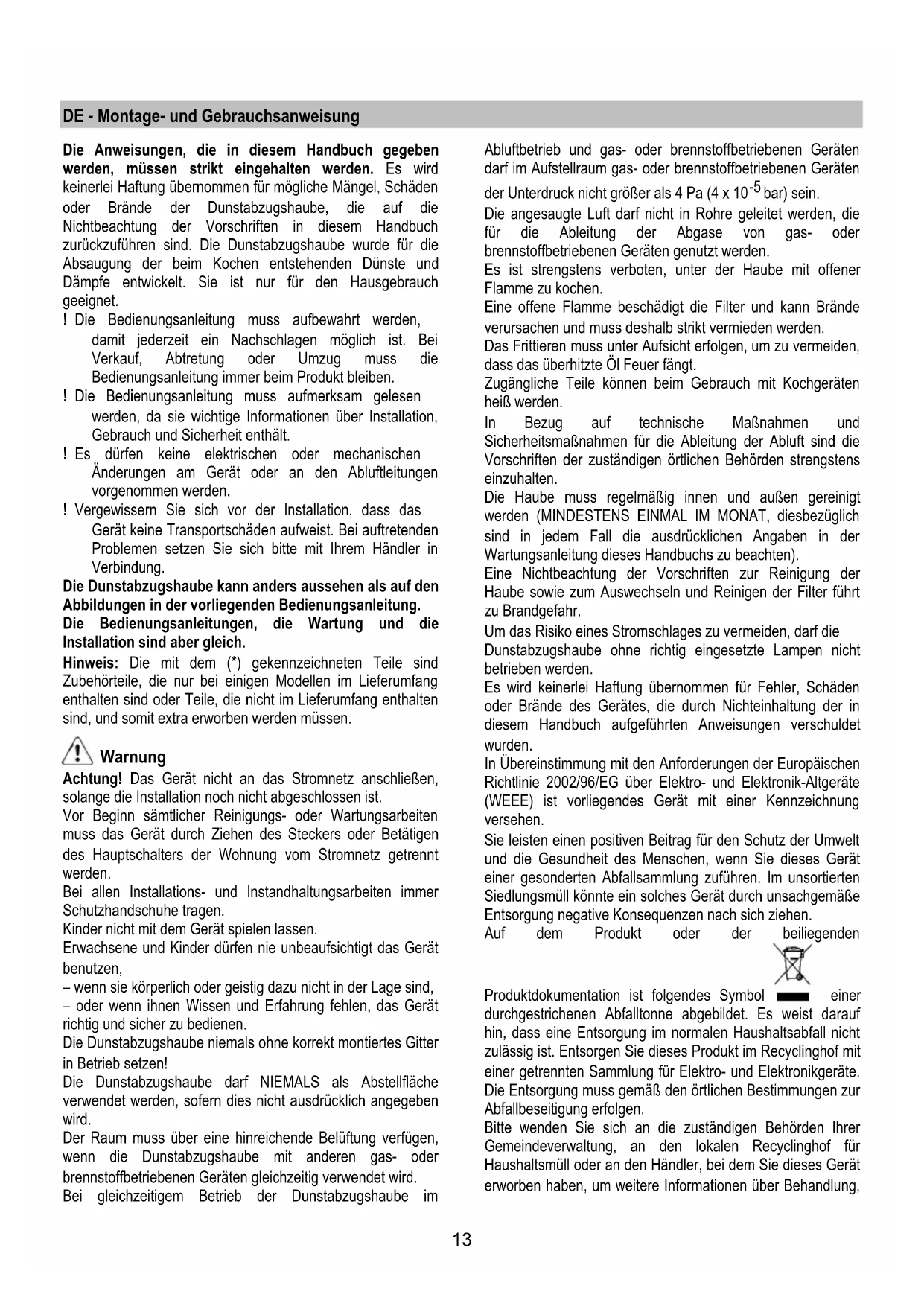 bar) sein. Die angesaugte Luft darf nicht in Rohre geleitet werden, die für die Ableitung der Abgase von gas- oder brennstoffbetriebenen Geräten genutzt werden. Es ist strengstens verboten, unter der Haube mit offener Flamme zu kochen. Eine offene Flamme beschädigt die Filter und kann Brände verursachen und muss deshalb strikt vermieden werden. Das Frittieren muss unter Aufsicht erfolgen, um zu vermeiden, dass das überhitzte Öl Feuer fängt. Zugängliche Teile können beim Gebrauch mit Kochgeräten heiß werden. In Bezug auf technische Maßnahmen und Sicherheitsmaßnahmen für die Ableitung der Abluft sind die Vorschriften der zuständigen örtlichen Behörden strengstens einzuhalten. Die Haube muss regelmäßig innen und außen gereinigt werden (MINDESTENS EINMAL IM MONAT, diesbezüglich sind in jedem Fall die ausdrücklichen Angaben in der Wartungsanleitung dieses Handbuchs zu beachten). Eine Nichtbeachtung der Vorschriften zur Reinigung der Haube sowie zum Auswechseln und Reinigen der Filter führt zu Brandgefahr. Um das Risiko eines Stromschlages zu vermeiden, darf die Dunstabzugshaube ohne richtig eingesetzte Lampen nicht betrieben werden. Es wird keinerlei Haftung übernommen für Fehler, Schäden oder Brände des Gerätes, die durch Nichteinhaltung der in diesem Handbuch aufgeführten Anweisungen verschuldet wurden. In Übereinstimmung mit den Anforderungen der Europäischen Richtlinie 2002/96/EG über Elektro- und Elektronik-Altgeräte (WEEE) ist vorliegendes Gerät mit einer Kennzeichnung versehen. Sie leisten einen positiven Beitrag für den Schutz der Umwelt und die Gesundheit des Menschen, wenn Sie dieses Gerät einer gesonderten Abfallsammlung zuführen. Im unsortierten Siedlungsmüll könnte ein solches Gerät durch unsachgemäße Entsorgung negative Konsequenzen nach sich ziehen. Auf dem Produkt oder der beiliegenden Produktdokumentation ist folgendes Symbol einer durchgestrichenen Abfalltonne abgebildet. Es weist darauf hin, dass eine Entsorgung im normalen Haushaltsabfall nicht zulässig ist. Entsorgen Sie dieses Produkt im Recyclinghof mit einer getrennten Sammlung für Elektro- und Elektronikgeräte. Die Entsorgung muss gemäß den örtlichen Bestimmungen zur Abfallbeseitigung erfolgen. Bitte wenden Sie sich an die zuständigen Behörden Ihrer Gemeindeverwaltung, an den lokalen Recyclinghof für Haushaltsmüll oder an den Händler, bei dem Sie dieses Gerät erworben haben, um weitere Informationen über Behandlung,14 Verwertung und Wiederverwendung dieses Produkts zu erhalten. Gerät entwickelt, getestet und hergestellt nach: