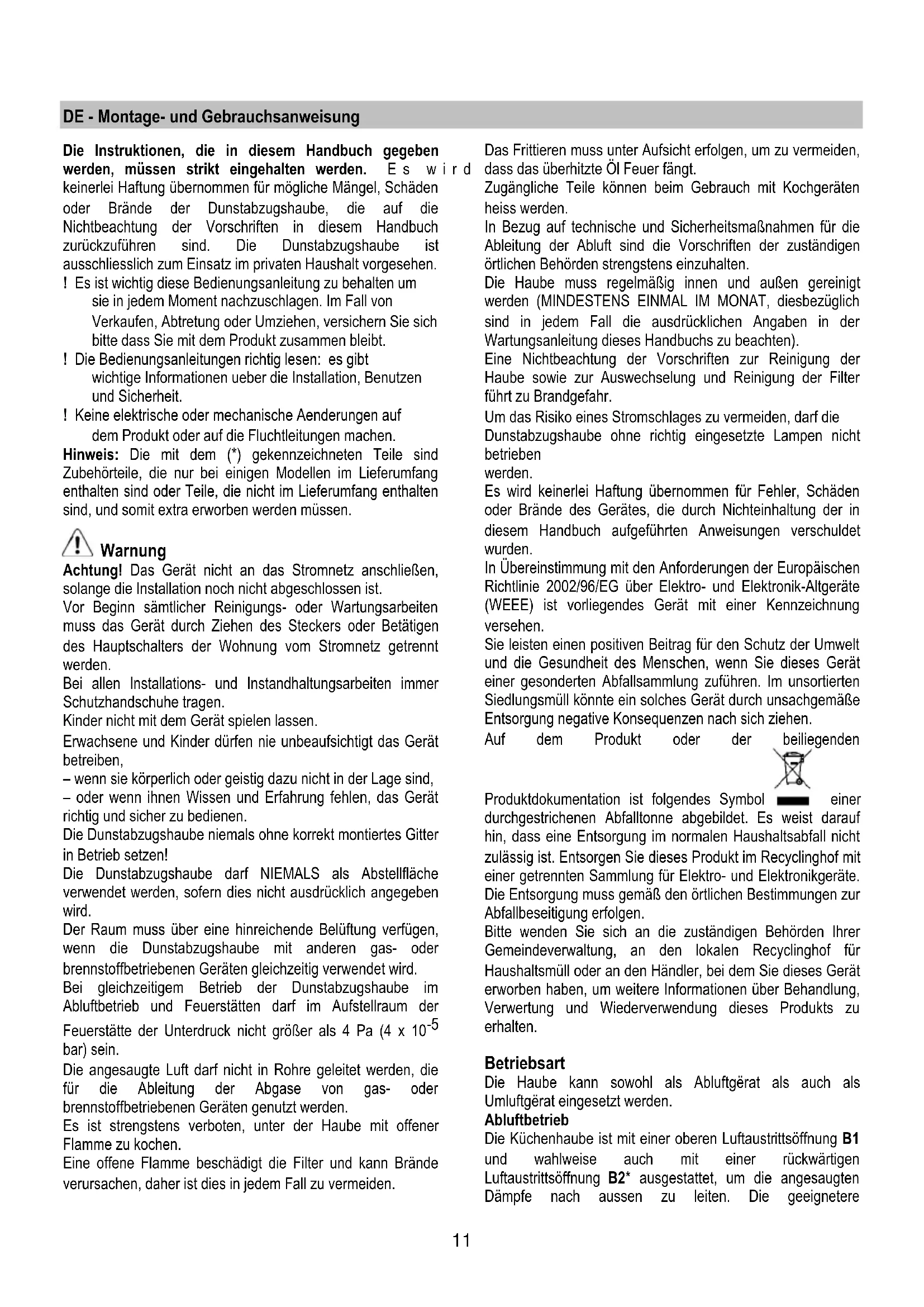 bar) sein. Die angesaugte Luft darf nicht in Rohre geleitet werden, die für die Ableitung der Abgase von gas- oder brennstoffbetriebenen Geräten genutzt werden. Es ist strengstens verboten, unter der Haube mit offener Flamme zu kochen. Eine offene Flamme beschädigt die Filter und kann Brände verursachen, daher ist dies in jedem Fall zu vermeiden. Das Frittieren muss unter Aufsicht erfolgen, um zu vermeiden, dass das überhitzte Öl Feuer fängt. Zugängliche Teile können beim Gebrauch mit Kochgeräten heiss werden. In Bezug auf technische und Sicherheitsmaßnahmen für die Ableitung der Abluft sind die Vorschriften der zuständigen örtlichen Behörden strengstens einzuhalten. Die Haube muss regelmäßig innen und außen gereinigt werden (MINDESTENS EINMAL IM MONAT, diesbezüglich sind in jedem Fall die ausdrücklichen Angaben in der Wartungsanleitung dieses Handbuchs zu beachten). Eine Nichtbeachtung der Vorschriften zur Reinigung der Haube sowie zur Auswechselung und Reinigung der Filter führt zu Brandgefahr. Um das Risiko eines Stromschlages zu vermeiden, darf die Dunstabzugshaube ohne richtig eingesetzte Lampen nicht betrieben werden. Es wird keinerlei Haftung übernommen für Fehler, Schäden oder Brände des Gerätes, die durch Nichteinhaltung der in diesem Handbuch aufgeführten Anweisungen verschuldet wurden. In Übereinstimmung mit den Anforderungen der Europäischen Richtlinie 2002/96/EG über Elektro- und Elektronik-Altgeräte (WEEE) ist vorliegendes Gerät mit einer Kennzeichnung versehen. Sie leisten einen positiven Beitrag für den Schutz der Umwelt und die Gesundheit des Menschen, wenn Sie dieses Gerät einer gesonderten Abfallsammlung zuführen. Im unsortierten Siedlungsmüll könnte ein solches Gerät durch unsachgemäße Entsorgung negative Konsequenzen nach sich ziehen. Auf dem Produkt oder der beiliegenden Produktdokumentation ist folgendes Symbol einer durchgestrichenen Abfalltonne abgebildet. Es weist darauf hin, dass eine Entsorgung im normalen Haushaltsabfall nicht zulässig ist. Entsorgen Sie dieses Produkt im Recyclinghof mit einer getrennten Sammlung für Elektro- und Elektronikgeräte. Die Entsorgung muss gemäß den örtlichen Bestimmungen zur Abfallbeseitigung erfolgen. Bitte wenden Sie sich an die zuständigen Behörden Ihrer Gemeindeverwaltung, an den lokalen Recyclinghof für Haushaltsmüll oder an den Händler, bei dem Sie dieses Gerät erworben haben, um weitere Informationen über Behandlung, Verwertung und Wiederverwendung dieses Produkts zu erhalten. Betriebsart Die Haube kann sowohl als Abluftgërat als auch als Umluftgërat eingesetzt werden. Abluftbetrieb Die Küchenhaube ist mit einer oberen Luftaustrittsöffnung B1 und wahlweise auch mit einer rückwärtigen Luftaustrittsöffnung B2* ausgestattet, um die angesaugten Dämpfe nach aussen zu leiten. Die geeignetere12 Luftaustrittsöffnung auswählen und den mitgegebenen Flansch C anbringen, dann in jedem Falle die nicht benötigte Luftaustrittsöffnung, falls diese vorhanden ist, mit dem mitgegebenen Deckel D* verschliessen. Hinweis: in einigen Modellen wird der obere Luftauslass B1 geschlossen ausgeliefert Fest drucken um den vorgebrochenen Teil wegzumachen , der den Luftauslass schliesst und ihn wegtun. Achtung! Der vorgebrochene Teil darf nicht mehr wieder an siner Stelle montiert werden diese Operation erfuellen nur wenn man sicher ist welche Sorte der Installation man erfuellen muss. Achtung! Bei einigen Modellen ist die rückwärtige Luftaustrittsöffnung nicht sofort zugänglich, selbst wenn der Deckel entfernt wird (falls dieser schon montiert ist). In diesem Fall das Plastikteil E1 oder E2, das die Öffnung verschliesst, mit Hilfe einer Zange und eines Messerchens entfernen. Kontrollieren, dass der Schalter G ‘Abluft/Umluft’ (im Inneren der Küchenhaube) auf der Position ‘Abluft’ (A) steht. Modelle ohne Saugmotor funktionieren nur mit Abluftbetrieb und müssen an eine externe Saugeinheit (nicht im Lieferumfang enthalten) angeschlossen werden. Die Anschlussanleitungen liegen der externe Saugeinheit bei. Befestigung Der Abstand zwischen der Abstellfläche auf dem Kochfeld und der Unterseite der Dunstabzugshaube darf 60cm im Fall von elektrischen Kochfeldern und 75cm im Fall von Gas- oder kombinierten Herden nicht unterschreiten. Wenn die Installationsanweisungen des Gaskochgeräts einen größeren Abstand vorgeben, ist dieser zu berücksichtigen. Elektrischer Anschluss Die Netzspannung muss der Spannung entsprechen, die auf dem Betriebsdatenschild im Innern der Haube angegeben ist. Sofern die Haube einen Netzstecker hat, ist dieser an zugänglicher Stelle an eine den geltenden Vorschriften entsprechende Steckdose auch nach der Montage anzuschließen. Bei einer Haube ohne Stecker (direkter Netzanschluss) oder falls der Stecker nicht zugänglich ist, ist ein normgerechter zweipoliger Schalter auch nach der Montage anzubringen, der unter Umständen der Überspannung Kategorie III entsprechend den Installationsregeln ein vollständiges Trennen vom Netz garantiert. Hinweis! Vor der Inbetriebnahme muss sichergestellt sein, dass die Netzversorgung (Steckdose) ordnungsgemäß montiert wurde. Montage Die Küchenhaube kann an die Wand montiert werden, sie kann aber auch am unteren Brett eines Hängeschrankes befestigt werden; wenn beigefügt, die Schablone H verwenden, um die Löcher im richtigen Abstand zu bohren, ansonsten die Küchenhaube an die Wand oder an das unterste Brett des Hängeschrankes lehnen und mit einem Bleistift die zu bohrenden Löcher markieren. Wandmontage - Die Wanddübel J in die Böhrlöcher und die beiden Schrauben K in die oberen Dübel einsetzen, das Gitter entfernen und die Küchenhaube in die beiden Schrauben einhängen. Danach im Inneren die dritte Schraube L einsetzen und alle Schrauben festziehen. Montage unter dem Hängeschrank - Die 4 Schrauben M im Inneren des Hängeschrankes in die Bohrlöcher einsetzen und damit die Küchenhaube am Hängeschrank befes