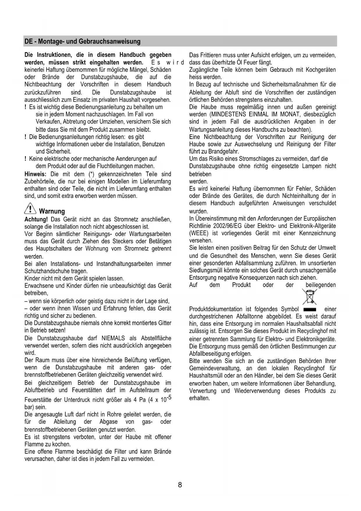 bar) sein. Die angesaugte Luft darf nicht in Rohre geleitet werden, die für die Ableitung der Abgase von gas- oder brennstoffbetriebenen Geräten genutzt werden. Es ist strengstens verboten, unter der Haube mit offener Flamme zu kochen. Eine offene Flamme beschädigt die Filter und kann Brände verursachen, daher ist dies in jedem Fall zu vermeiden. Das Frittieren muss unter Aufsicht erfolgen, um zu vermeiden, dass das überhitzte Öl Feuer fängt. Zugängliche Teile können beim Gebrauch mit Kochgeräten heiss werden. In Bezug auf technische und Sicherheitsmaßnahmen für die Ableitung der Abluft sind die Vorschriften der zuständigen örtlichen Behörden strengstens einzuhalten. Die Haube muss regelmäßig innen und außen gereinigt werden (MINDESTENS EINMAL IM MONAT, diesbezüglich sind in jedem Fall die ausdrücklichen Angaben in der Wartungsanleitung dieses Handbuchs zu beachten). Eine Nichtbeachtung der Vorschriften zur Reinigung der Haube sowie zur Auswechselung und Reinigung der Filter führt zu Brandgefahr. Um das Risiko eines Stromschlages zu vermeiden, darf die Dunstabzugshaube ohne richtig eingesetzte Lampen nicht betrieben werden. Es wird keinerlei Haftung übernommen für Fehler, Schäden oder Brände des Gerätes, die durch Nichteinhaltung der in diesem Handbuch aufgeführten Anweisungen verschuldet wurden. In Übereinstimmung mit den Anforderungen der Europäischen Richtlinie 2002/96/EG über Elektro- und Elektronik-Altgeräte (WEEE) ist vorliegendes Gerät mit einer Kennzeichnung versehen. Sie leisten einen positiven Beitrag für den Schutz der Umwelt und die Gesundheit des Menschen, wenn Sie dieses Gerät einer gesonderten Abfallsammlung zuführen. Im unsortierten Siedlungsmüll könnte ein solches Gerät durch unsachgemäße Entsorgung negative Konsequenzen nach sich ziehen. Auf dem Produkt oder der beiliegenden Produktdokumentation ist folgendes Symbol einer durchgestrichenen Abfalltonne abgebildet. Es weist darauf hin, dass eine Entsorgung im normalen Haushaltsabfall nicht zulässig ist. Entsorgen Sie dieses Produkt im Recyclinghof mit einer getrennten Sammlung für Elektro- und Elektronikgeräte. Die Entsorgung muss gemäß den örtlichen Bestimmungen zur Abfallbeseitigung erfolgen. Bitte wenden Sie sich an die zuständigen Behörden Ihrer Gemeindeverwaltung, an den lokalen Recyclinghof für Haushaltsmüll oder an den Händler, bei dem Sie dieses Gerät erworben haben, um weitere Informationen über Behandlung, Verwertung und Wiederverwendung dieses Produkts zu erhalten.9 Betriebsart Die Haube kann sowohl als Abluftgërat als auch als Umluftgërat eingesetzt werden. Abluftbetrieb Die Küchenhaube ist mit einer oberen Luftaustrittsöffnung B1 und wahlweise auch mit einer rückwärtigen Luftaustrittsöffnung B2* ausgestattet, um die angesaugten Dämpfe nach aussen zu leiten. Die geeignetere Luftaustrittsöffnung auswählen und den mitgegebenen Flansch C anbringen, dann in jedem Falle die nicht benötigte Luftaustrittsöffnung, falls diese vorhanden ist, mit dem mitgegebenen Deckel D* verschliessen. Hinweis: in einigen Modellen wird der obere Luftauslass B1 geschlossen ausgeliefert Fest drucken um den vorgebrochenen Teil wegzumachen , der den Luftauslass schliesst und ihn wegtun. Achtung! Der vorgebrochene Teil darf nicht mehr wieder an siner Stelle montiert werden diese Operation erfuellen nur wenn man sicher ist welche Sorte der Installation man erfuellen muss. Achtung! Bei einigen Modellen ist die rückwärtige Luftaustrittsöffnung nicht sofort zugänglich, selbst wenn der Deckel entfernt wird (falls dieser schon montiert ist). In diesem Fall das Plastikteil E1 oder E2, das die Öffnung verschliesst, mit Hilfe einer Zange und eines Messerchens entfernen. Kontrollieren, dass der Schalter G ‘Abluft/Umluft’ (im Inneren der Küchenhaube) auf der Position ‘Abluft’ (A) steht. Umluftbetrieb Falls es nicht möglich sein sollte, die angesaugten Dämpfe nach aussen abzuleiten, kann die Küchenhaube als Umlufthaube verwendet werden, wenn ein Aktivkohlefilter eingebaut wird. Die angesaugten Dämpfe werden dann mit Hilfe des vorderen Gitters, das sich oberhalb der Bedienungstasten befindet, wiederaufbereitet. Kontrollieren, dass der Schalter G ‘Abluft/Umluft’ (im Inneren der Küchenhaube) auf der Position ‘Umluft’ (F) steht. Modelle ohne Saugmotor funktionieren nur mit Abluftbetrieb und müssen an eine externe Saugeinheit (nicht im Lieferumfang enthalten) angeschlossen werden. Die Anschlussanleitungen liegen der externe Saugeinheit bei. Befestigung Der Abstand zwischen der Abstellfläche auf dem Kochfeld und der Unterseite der Dunstabzugshaube darf 60cm im Fall von elektrischen Kochfeldern und 70cm im Fall von Gas- oder kombinierten Herden nicht unterschreiten. Wenn die Installationsanweisungen des Gaskochgeräts einen größeren Abstand vorgeben, ist dieser zu berücksichtigen. Elektrischer Anschluss Die Netzspannung muss der Spannung entsprechen, die auf dem Betriebsdatenschild im Innern der Haube angegeben ist. Sofern die Haube einen Netzstecker hat, ist dieser an zugänglicher Stelle an eine den geltenden Vorschriften entsprechende Steckdose auch nach der Montage anzuschließen. Bei einer Haube ohne Stecker (direkter Netzanschluss) oder falls der Stecker nicht zugänglich ist, ist ein normgerechter zweipoliger Schalter auch nach der Montage anzubringen, der unter Umständen der Überspannung Kategorie III entsprechend den Installationsregeln ein vollständiges Trennen vom Netz garantiert. Hinweis! Vor der Inbetriebnahme muss sichergestellt sein, dass die Netzversorgung (Steckdose) ordnungsgemäß montiert wurde. Hinweis! Zur Vermeidung von Gefahren darf die Auswechselung des Stromkabels nur vom autorisierten Kundendienst vorgenommen werden. Montage Die Küchenhaube kann an die Wand montiert werden, sie kann aber auch am unteren Brett eines Hängeschrankes befestigt werden; wenn beigefügt, die Schablone H verwenden, um die Löcher im richtigen Abstand zu bo
