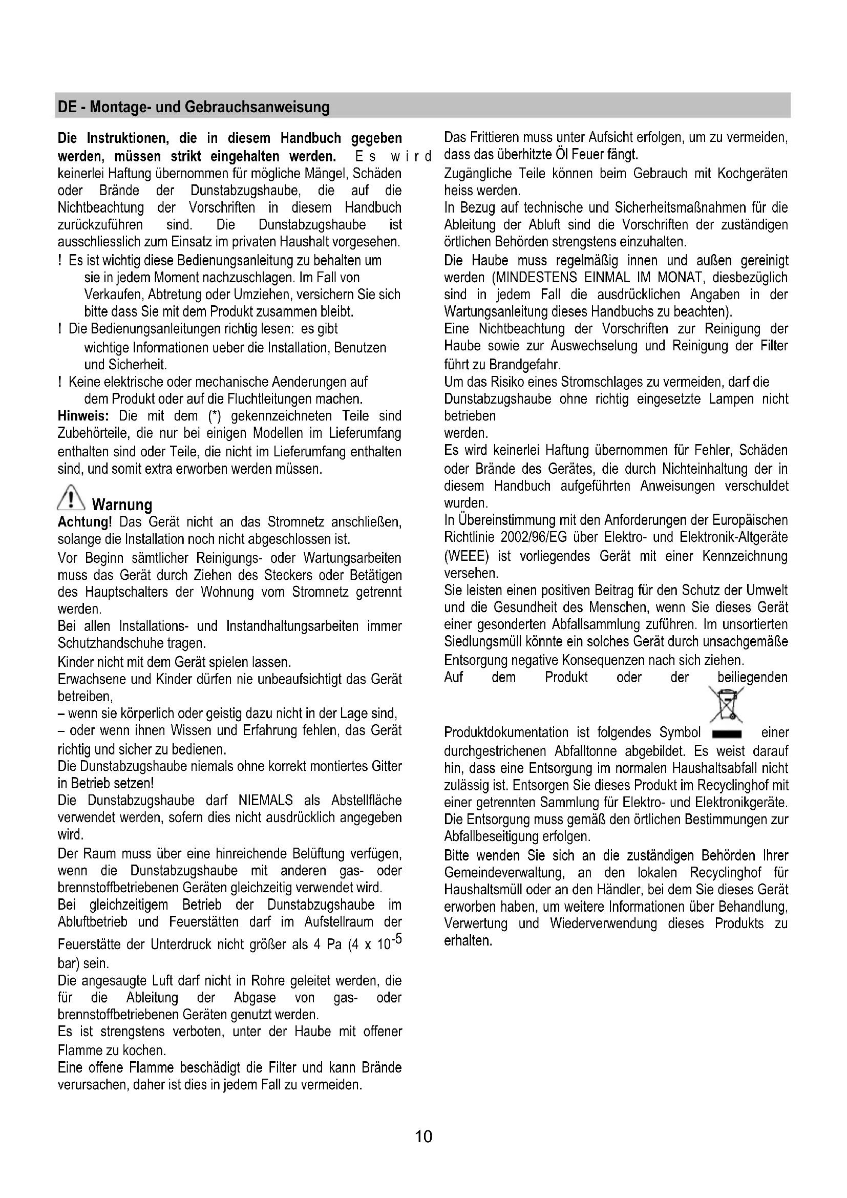 Se l'illuminazione non dovesse funzionare, controllate il corretto inserimento delle lampade nella sede prima di chiamare l'assistenza tecnica.10 DE - Montage- und Gebrauchsanweisung Die Instruktionen, die in diesem Handbuch gegeben werden, müssen strikt eingehalten werden. Es wird keinerlei Haftung übernommen für mögliche Mängel, Schäden oder Brände der Dunstabzugshaube, die auf die Nichtbeachtung der Vorschriften in diesem Handbuch zurückzuführen sind. Die Dunstabzugshaube ist ausschliesslich zum Einsatz im privaten Haushalt vorgesehen. ! Es ist wichtig diese Bedienungsanleitung zu behalten um sie in jedem Moment nachzuschlagen. Im Fall von Verkaufen, Abtretung oder Umziehen, versichern Sie sich bitte dass Sie mit dem Produkt zusammen bleibt. ! Die Bedienungsanleitungen richtig lesen: es gibt wichtige Informationen ueber die Installation, Benutzen und Sicherheit. ! Keine elektrische oder mechanische Aenderungen auf dem Produkt oder auf die Fluchtleitungen machen. Hinweis: Die mit dem (*) gekennzeichneten Teile sind Zubehörteile, die nur bei einigen Modellen im Lieferumfang enthalten sind oder Teile, die nicht im Lieferumfang enthalten sind, und somit extra erworben werden müssen. Warnung Achtung! Das Gerät nicht an das Stromnetz anschließen, solange die Installation noch nicht abgeschlossen ist. Vor Beginn sämtlicher Reinigungs- oder Wartungsarbeiten muss das Gerät durch Ziehen des Steckers oder Betätigen des Hauptschalters der Wohnung vom Stromnetz getrennt werden. Bei allen Installations- und Instandhaltungsarbeiten immer Schutzhandschuhe tragen. Kinder nicht mit dem Gerät spielen lassen. Erwachsene und Kinder dürfen nie unbeaufsichtigt das Gerät betreiben, – wenn sie körperlich oder geistig dazu nicht in der Lage sind, – oder wenn ihnen Wissen und Erfahrung fehlen, das Gerät richtig und sicher zu bedienen. Die Dunstabzugshaube niemals ohne korrekt montiertes Gitter in Betrieb setzen! Die Dunstabzugshaube darf NIEMALS als Abstellfläche verwendet werden, sofern dies nicht ausdrücklich angegeben wird. Der Raum muss über eine hinreichende Belüftung verfügen, wenn die Dunstabzugshaube mit anderen gas- oder brennstoffbetriebenen Geräten gleichzeitig verwendet wird. Bei gleichzeitigem Betrieb der Dunstabzugshaube im Abluftbetrieb und Feuerstätten darf im Aufstellraum der Feuerstätte der Unterdruck nicht größer als 4 Pa (4 x 10