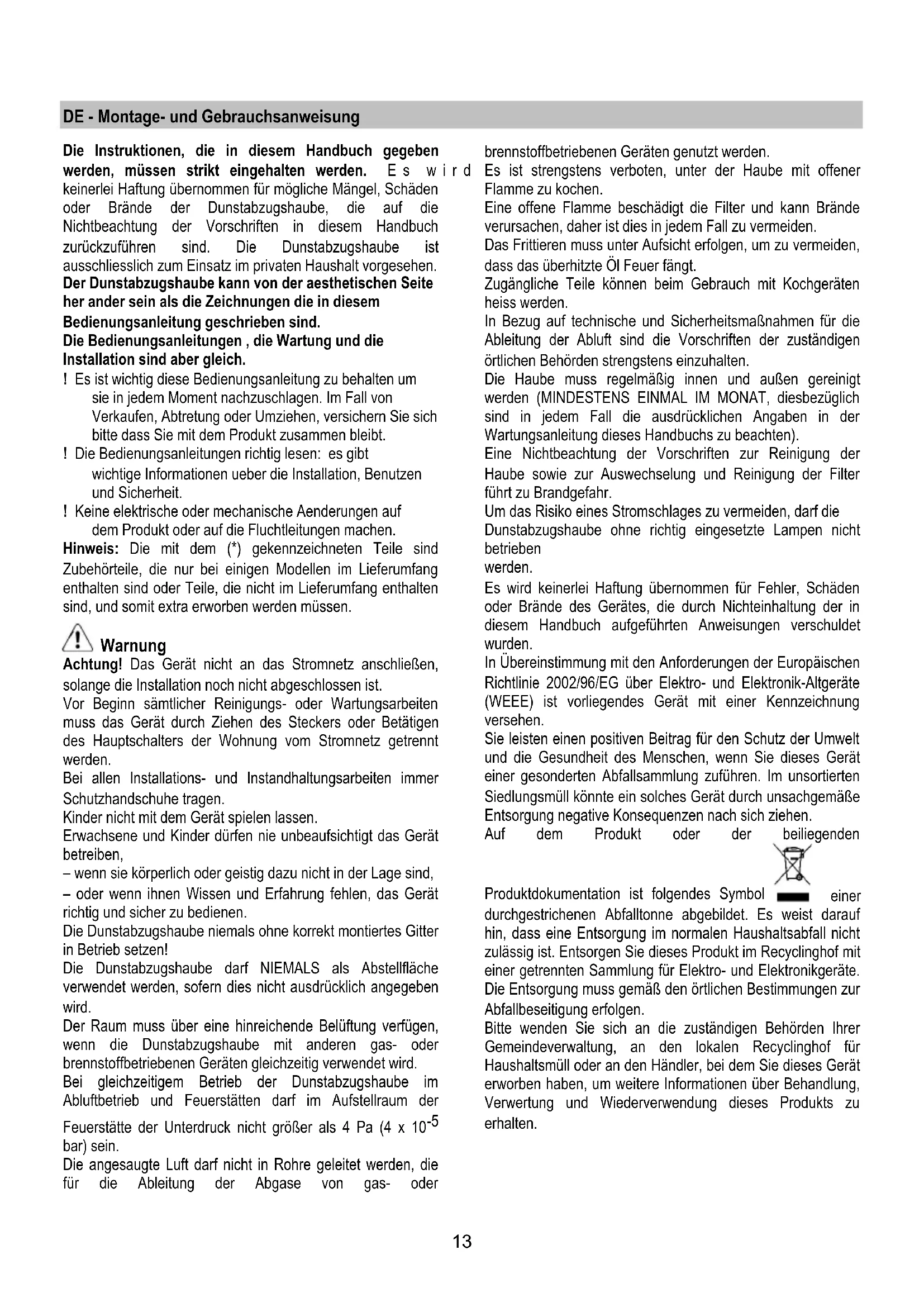 Die Instruktionen, die in thisem Handbuch gegeben werden, müssen strikt eingehalten werden. Es w i keinerlei Haftung übernommen für mögliche Mängel, Schäden oder Brände der Dunstabzugshaube, die auf die Nichtbeachtung der Vorschriften in thisem Handbuch darüberzuführen sind. Die Dunstabzugshaube ist ausschiesslich zum Einsatz im privaten Haushalt vorgesehen. Der Dunstabzugshaube kann von der aesthetischen Seite her ander sein als die Zeichnungen die in thisem Bedienungsanleitung geschrieben sind. Die Bedienungsanleitungen, die Wartung und die Installation sind aber gleich.
