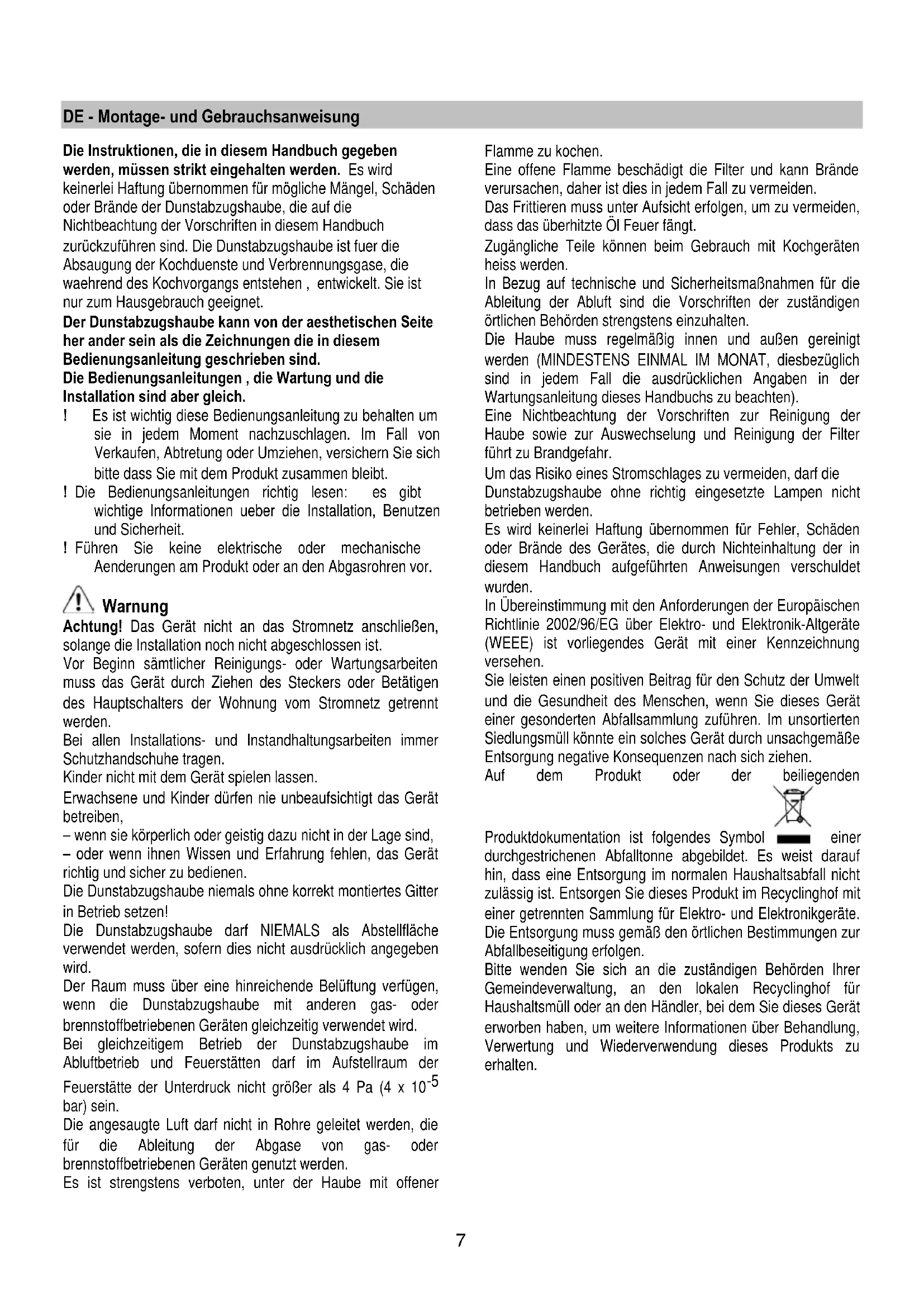 Sostituzione Lampade Disinserire l’apparecchio dalla rete elettrica. Attenzione! Prima di toccare le lampade sincerarsi che siano fredde. Sostituire la lampada danneggiata. Utilizzare solo lampade alogene a candela Ø35mm E14 28W. Se l'illuminazione non dovesse funzionare, controllate il corretto inserimento delle lampade nella sede prima di chiamare l'assistenza tecnica.7 DE - Montage- und Gebrauchsanweisung Die Instruktionen, die in diesem Handbuch gegeben werden, müssen strikt eingehalten werden. Es wird keinerlei Haftung übernommen für mögliche Mängel, Schäden oder Brände der Dunstabzugshaube, die auf die Nichtbeachtung der Vorschriften in diesem Handbuch zurückzuführen sind. Die Dunstabzugshaube ist fuer die Absaugung der Kochduenste und Verbrennungsgase, die waehrend des Kochvorgangs entstehen , entwickelt. Sie ist nur zum Hausgebrauch geeignet. Der Dunstabzugshaube kann von der aesthetischen Seite her ander sein als die Zeichnungen die in diesem Bedienungsanleitung geschrieben sind. Die Bedienungsanleitungen , die Wartung und die Installation sind aber gleich. ! Es ist wichtig diese Bedienungsanleitung zu behalten um sie in jedem Moment nachzuschlagen. Im Fall von Verkaufen, Abtretung oder Umziehen, versichern Sie sich bitte dass Sie mit dem Produkt zusammen bleibt. ! Die Bedienungsanleitungen richtig lesen: es gibt wichtige Informationen ueber die Installation, Benutzen und Sicherheit. ! Führen Sie keine elektrische oder mechanische Aenderungen am Produkt oder an den Abgasrohren vor. Warnung Achtung! Das Gerät nicht an das Stromnetz anschließen, solange die Installation noch nicht abgeschlossen ist. Vor Beginn sämtlicher Reinigungs- oder Wartungsarbeiten muss das Gerät durch Ziehen des Steckers oder Betätigen des Hauptschalters der Wohnung vom Stromnetz getrennt werden. Bei allen Installations- und Instandhaltungsarbeiten immer Schutzhandschuhe tragen. Kinder nicht mit dem Gerät spielen lassen. Erwachsene und Kinder dürfen nie unbeaufsichtigt das Gerät betreiben, – wenn sie körperlich oder geistig dazu nicht in der Lage sind, – oder wenn ihnen Wissen und Erfahrung fehlen, das Gerät richtig und sicher zu bedienen. Die Dunstabzugshaube niemals ohne korrekt montiertes Gitter in Betrieb setzen! Die Dunstabzugshaube darf NIEMALS als Abstellfläche verwendet werden, sofern dies nicht ausdrücklich angegeben wird. Der Raum muss über eine hinreichende Belüftung verfügen, wenn die Dunstabzugshaube mit anderen gas- oder brennstoffbetriebenen Geräten gleichzeitig verwendet wird. Bei gleichzeitigem Betrieb der Dunstabzugshaube im Abluftbetrieb und Feuerstätten darf im Aufstellraum der Feuerstätte der Unterdruck nicht größer als 4 Pa (4 x 10