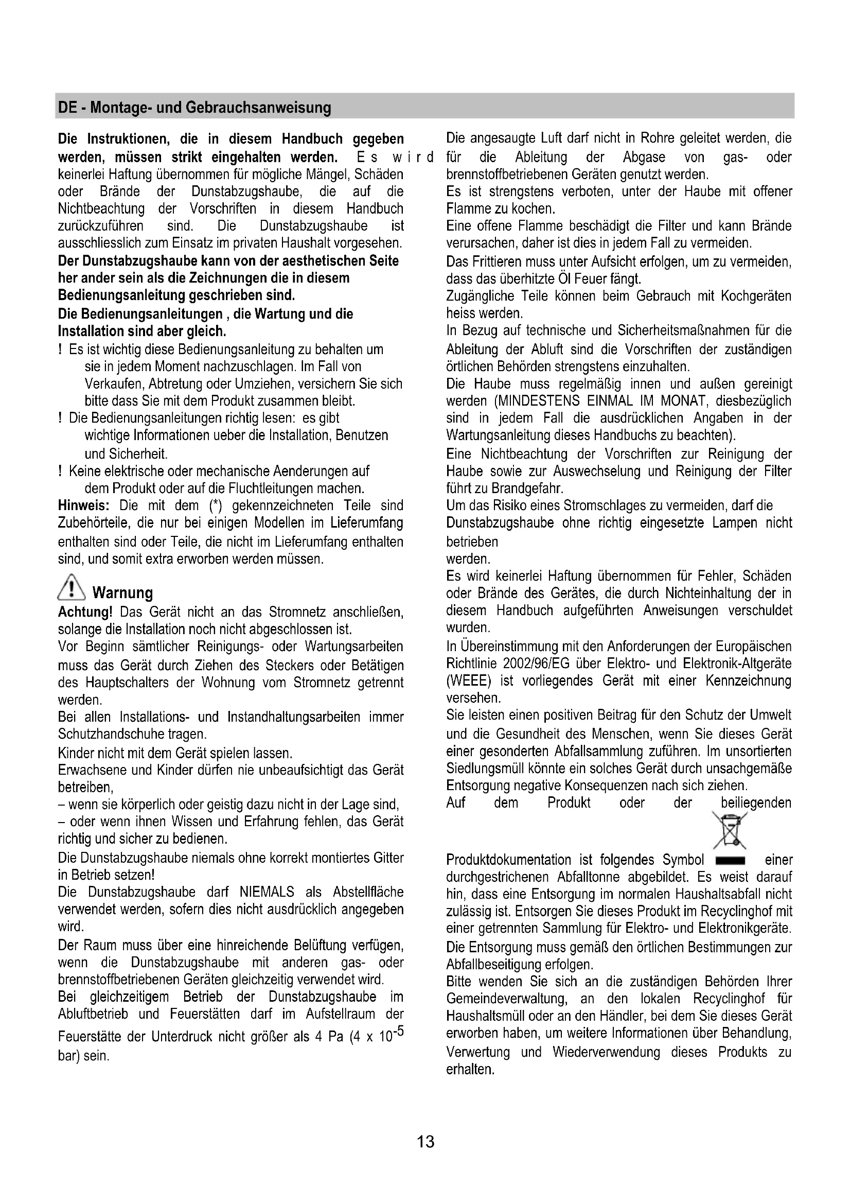 - Eseguire il montaggio della nuova lampada procedendo in senso inverso. Se l'illuminazione non dovesse funzionare, controllate il corretto inserimento delle lampade nella sede prima di chiamare l'assistenza tecnica.13 DE - Montage- und Gebrauchsanweisung Die Instruktionen, die in diesem Handbuch gegeben werden, müssen strikt eingehalten werden. Es wird keinerlei Haftung übernommen für mögliche Mängel, Schäden oder Brände der Dunstabzugshaube, die auf die Nichtbeachtung der Vorschriften in diesem Handbuch zurückzuführen sind. Die Dunstabzugshaube ist ausschliesslich zum Einsatz im privaten Haushalt vorgesehen. Der Dunstabzugshaube kann von der aesthetischen Seite her ander sein als die Zeichnungen die in diesem Bedienungsanleitung geschrieben sind. Die Bedienungsanleitungen , die Wartung und die Installation sind aber gleich. ! Es ist wichtig diese Bedienungsanleitung zu behalten um sie in jedem Moment nachzuschlagen. Im Fall von Verkaufen, Abtretung oder Umziehen, versichern Sie sich bitte dass Sie mit dem Produkt zusammen bleibt. ! Die Bedienungsanleitungen richtig lesen: es gibt wichtige Informationen ueber die Installation, Benutzen und Sicherheit. ! Keine elektrische oder mechanische Aenderungen auf dem Produkt oder auf die Fluchtleitungen machen. Hinweis: Die mit dem (*) gekennzeichneten Teile sind Zubehörteile, die nur bei einigen Modellen im Lieferumfang enthalten sind oder Teile, die nicht im Lieferumfang enthalten sind, und somit extra erworben werden müssen. Warnung Achtung! Das Gerät nicht an das Stromnetz anschließen, solange die Installation noch nicht abgeschlossen ist. Vor Beginn sämtlicher Reinigungs- oder Wartungsarbeiten muss das Gerät durch Ziehen des Steckers oder Betätigen des Hauptschalters der Wohnung vom Stromnetz getrennt werden. Bei allen Installations- und Instandhaltungsarbeiten immer Schutzhandschuhe tragen. Kinder nicht mit dem Gerät spielen lassen. Erwachsene und Kinder dürfen nie unbeaufsichtigt das Gerät betreiben, – wenn sie körperlich oder geistig dazu nicht in der Lage sind, – oder wenn ihnen Wissen und Erfahrung fehlen, das Gerät richtig und sicher zu bedienen. Die Dunstabzugshaube niemals ohne korrekt montiertes Gitter in Betrieb setzen! Die Dunstabzugshaube darf NIEMALS als Abstellfläche verwendet werden, sofern dies nicht ausdrücklich angegeben wird. Der Raum muss über eine hinreichende Belüftung verfügen, wenn die Dunstabzugshaube mit anderen gas- oder brennstoffbetriebenen Geräten gleichzeitig verwendet wird. Bei gleichzeitigem Betrieb der Dunstabzugshaube im Abluftbetrieb und Feuerstätten darf im Aufstellraum der Feuerstätte der Unterdruck nicht größer als 4 Pa (4 x 10