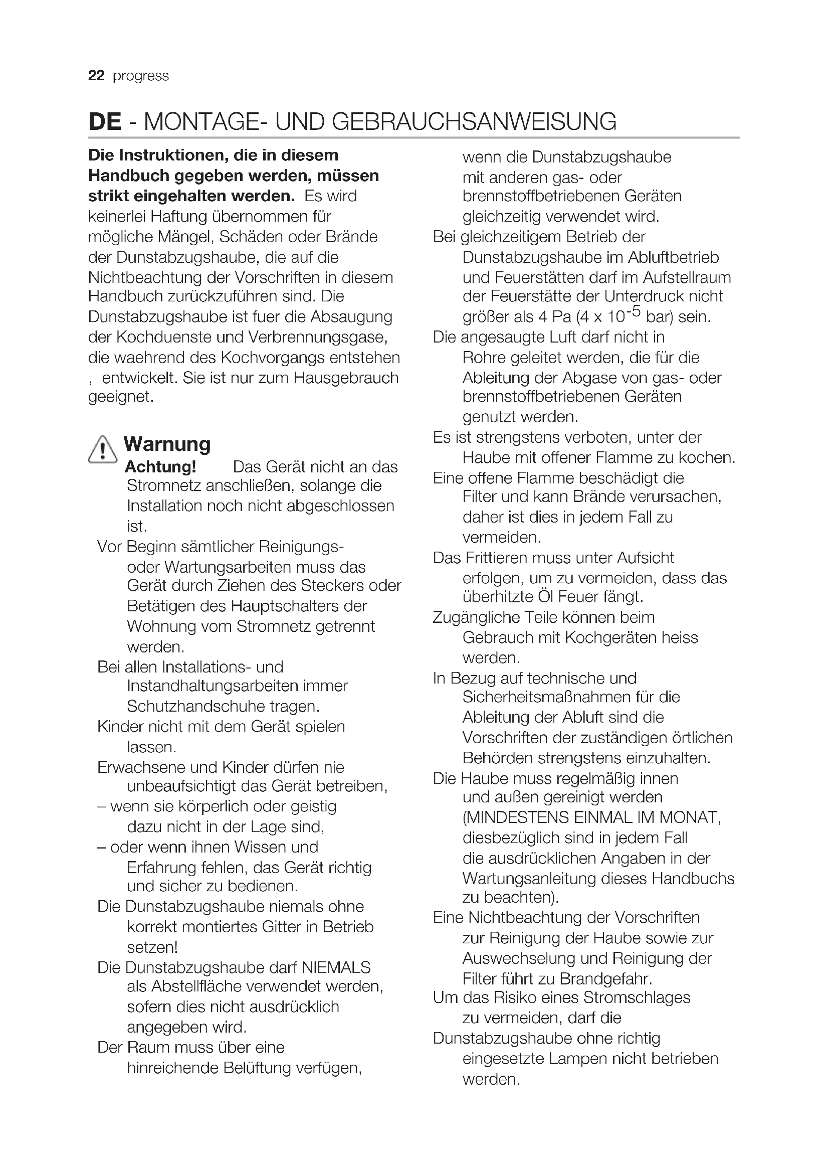 Die Instruktionen, die in diesem Handbuch gegeben werden, müssen strikt eingehalten werden. Es wird keinerlei Haftung übernommen für mögliche Mängel, Schäden oder Brände der Dunstabzugshaube, die auf die Nichtbeachtung der Vorschriften in diesem Handbuch zurückzuführen sind. Die Dunstabzugshaube ist fuer die Absaugung der Kochduenste und Verbrennungsgase, die waehrend des Kochvorgangs entstehen , entwickelt. Sie ist nur zum Hausgebrauch geeignet. Warnung Achtung! Das Gerät nicht an das Stromnetz anschließen, solange die Installation noch nicht abgeschlossen ist. Vor Beginn sämtlicher Reinigungs- oder Wartungsarbeiten muss das Gerät durch Ziehen des Steckers oder Betätigen des Hauptschalters der Wohnung vom Stromnetz getrennt werden. Bei allen Installations- und Instandhaltungsarbeiten immer Schutzhandschuhe tragen. Kinder nicht mit dem Gerät spielen lassen. Erwachsene und Kinder dürfen nie unbeaufsichtigt das Gerät betreiben, – wenn sie körperlich oder geistig dazu nicht in der Lage sind, – oder wenn ihnen Wissen und Erfahrung fehlen, das Gerät richtig und sicher zu bedienen. Die Dunstabzugshaube niemals ohne korrekt montiertes Gitter in Betrieb setzen! Die Dunstabzugshaube darf NIEMALS als Abstellfläche verwendet werden, sofern dies nicht ausdrücklich angegeben wird. Der Raum muss über eine hinreichende Belüftung verfügen, wenn die Dunstabzugshaube mit anderen gas- oder brennstoffbetriebenen Geräten gleichzeitig verwendet wird. Bei gleichzeitigem Betrieb der Dunstabzugshaube im Abluftbetrieb und Feuerstätten darf im Aufstellraum der Feuerstätte der Unterdruck nicht größer als 4 Pa (4 x 10