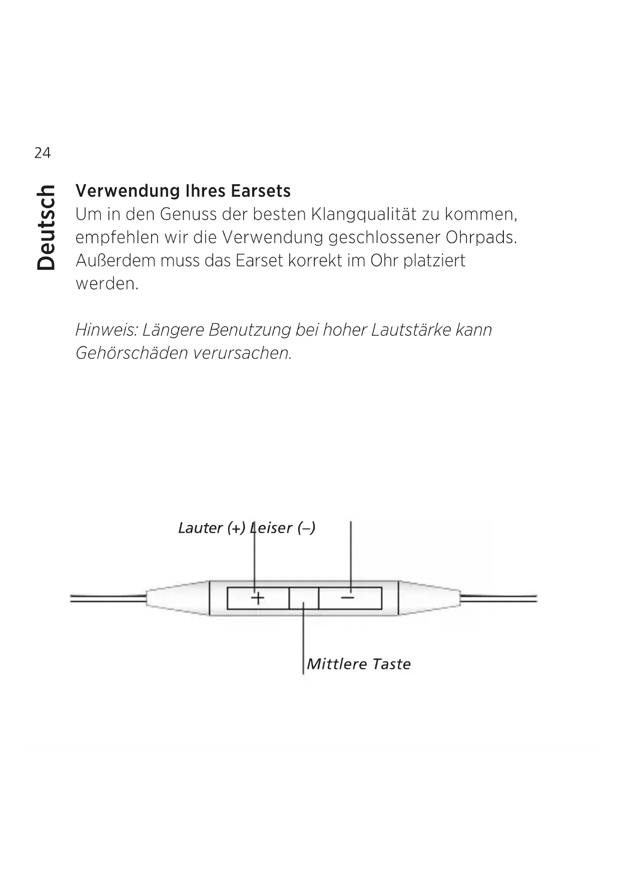 hören ist und lassen Sie dann die Taste los. > Erst wird die aktuelle Wiedergabeliste genannt und dann alle Ihre Wiedergabelisten. > Drücken Sie die mittlere Taste, wenn die von Ihnen gewünschte Wiedergabeliste genannt wird. > Mit der +/–-Taste schalten Sie schnell durch alle verfügbaren Wiedergabelisten. Anrufbedienung Ein Anruf bzw. Gespräch annehmen bzw. beenden … > Drücken Sie die mittlere Taste einmal, um den Anruf anzunehmen. > Drücken Sie erneut die mittlere Taste, um das Gespräch zu beenden. 26Einen Anruf ablehnen … > Halten Sie die mittlere Taste zwei Sekunden lang gedrückt und lassen Sie sie anschließend los. > Die Abweisung des Anrufs wird durch zwei tiefe Signaltöne bestätigt. Umschalten auf einen eingehenden Anruf/Gespräch in der Warteschleife und das aktuelle Gespräch in die Warteschleife legen ... > Drücken Sie die mittlere Taste. > Drücken Sie die Taste erneut, um zum ersten Gespräch zurück zu wechseln. Umschalten auf einen eingehenden Anruf/Gespräch in der Warteschleife und das aktuelle Gespräch beenden ... > Halten Sie die mittlere Taste zwei Sekunden lang gedrückt und lassen Sie sie anschließend los. > Das Beenden des Gesprächs wird durch zwei tiefe Signaltöne bestätigt. Nicht alle Features und Funktionen, die in dieser Anleitung beschrieben werden, sind auf allen anschließbaren Geräten verfügbar.. 27Nederlands Uw EarSet3i gebruiken Voor een optimale geluidskwaliteit raden wij u aan de twee bijgesloten oorkussentjes op de EarSet3i te bevestigen en vervolgens de EarSet3i op de juiste manier in uw oor in te brengen. Opgelet: langdurige blootstelling aan hard geluid kan uw gehoor beschadigen.