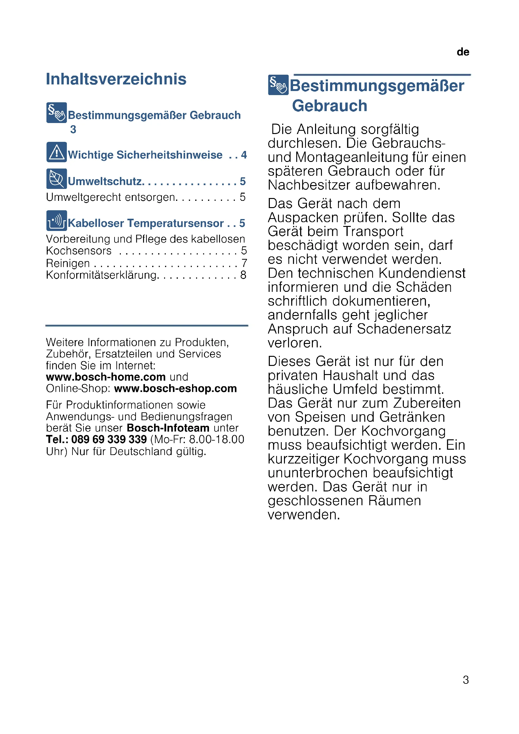 - Konformitätserklärung Produktinfo Weitere Informationen zu Produkten, Zubehör, Ersatzteilen und Services finden Sie im Internet: www.bosch-home.com und Online-Shop: www.bosch-eshop.com Für Produktinformationen sowie Anwendungs- und Bedienungsfragen berät Sie unser Bosch-Infoteam unter Tel.: 089 69 339 339 (Mo-Fr: 8.00-18.00 Uhr) Nur für Deutschland gültig. 8 Bestimmungsgemäßer Gebrauch Be s t i mmungsgemäßer Gebr auch Die Anleitung sorgfältig durchlesen. Die Gebrauchs- und Montageanleitung für einen späteren Gebrauch oder für Nachbesitzer aufbewahren. Das Gerät nach dem Auspacken prüfen. Sollte das Gerät beim Transport beschädigt worden sein, darf es nicht verwendet werden. Den technischen Kundendienst informieren und die Schäden schriftlich dokumentieren, andernfalls geht jeglicher Anspruch auf Schadenersatz verloren. Dieses Gerät ist nur für den privaten Haushalt und das häusliche Umfeld bestimmt. Das Gerät nur zum Zubereiten von Speisen und Getränken benutzen. Der Kochvorgang muss beaufsichtigt werden. Ein kurzzeitiger Kochvorgang muss ununterbrochen beaufsichtigt werden. Das Gerät nur in geschlossenen Räumen verwenden.de p. 8