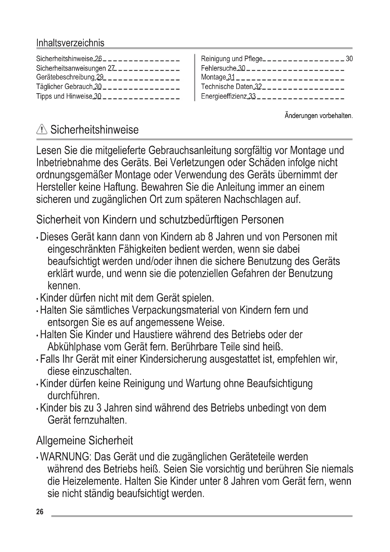 Fehlersuche 30 Montage 31 Technische Daten 32 Energieeffizienz 33 Änderungen vorbehalten. Sicherheitshinweise Lesen Sie die mitgelieferte Gebrauchsanleitung sorgfältig vor Montage und Inbetriebnahme des Geräts. Bei Verletzungen oder Schäden infolge nicht ordnungsgemäßer Montage oder Verwendung des Geräts übernimmt der Hersteller keine Haftung. Bewahren Sie die Anleitung immer an einem sicheren und zugänglichen Ort zum späteren Nachschlagen auf. Sicherheit von Kindern und schutzbedürftigen Personen