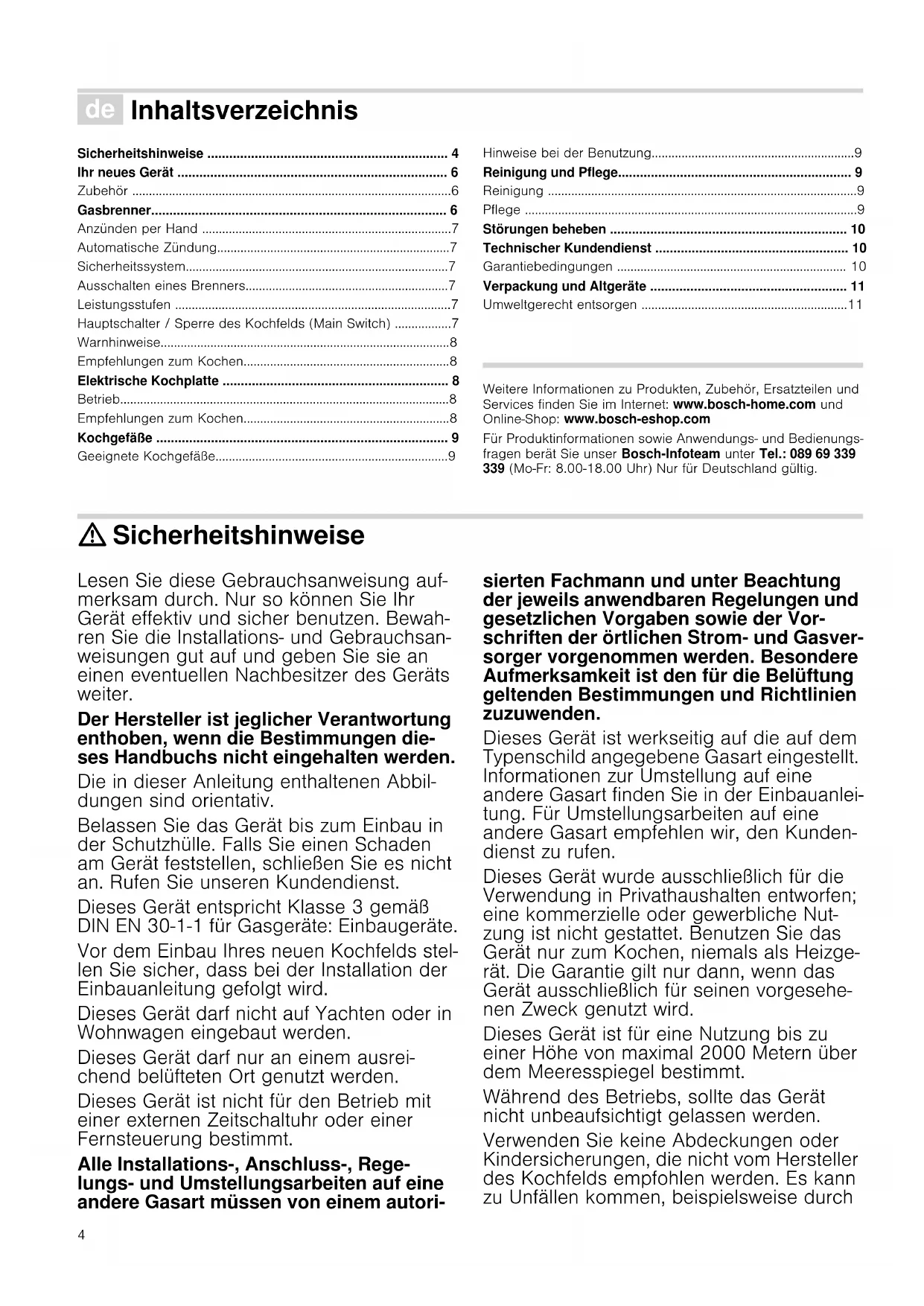 - Umweltgerecht entsorgen Produktinfo Weitere Informationen zu Produkten, Zubehör, Ersatzteilen und Services finden Sie im Internet: www.bosch-home.com und Online-Shop: www.bosch-eshop.com Für Produktinformationen sowie Anwendungs- und Bedienungs- fragen berät Sie unser Bosch-Infoteam unter Tel.: 089 69 339 339 (Mo-Fr: 8.00-18.00 Uhr) Nur für Deutschland gültig. : Sicherheitshinweise Lesen Sie diese Gebrauchsanweisung auf- merksam durch. Nur so können Sie Ihr Gerät effektiv und sicher benutzen. Bewah- ren Sie die Installations- und Gebrauchsan- weisungen gut auf und geben Sie sie an einen eventuellen Nachbesitzer des Geräts weiter. Der Hersteller ist jeglicher Verantwortung enthoben, wenn die Bestimmungen die- ses Handbuchs nicht eingehalten werden. Die in dieser Anleitung enthaltenen Abbil- dungen sind orientativ. Belassen Sie das Gerät bis zum Einbau in der Schutzhülle. Falls Sie einen Schaden am Gerät feststellen, schließen Sie es nicht an. Rufen Sie unseren Kundendienst. Dieses Gerät entspricht Klasse 3 gemäß DIN EN 30-1-1 für Gasgeräte: Einbaugeräte. Vor dem Einbau Ihres neuen Kochfelds stel- len Sie sicher, dass bei der Installation der Einbauanleitung gefolgt wird. Dieses Gerät darf nicht auf Yachten oder in Wohnwagen eingebaut werden. Dieses Gerät darf nur an einem ausrei- chend belüfteten Ort genutzt werden. Dieses Gerät ist nicht für den Betrieb mit einer externen Zeitschaltuhr oder einer Fernsteuerung bestimmt. Alle Installations-, Anschluss-, Rege- lungs- und Umstellungsarbeiten auf eine andere Gasart müssen von einem autori- sierten Fachmann und unter Beachtung der jeweils anwendbaren Regelungen und gesetzlichen Vorgaben sowie der Vor- schriften der örtlichen Strom- und Gasver- sorger vorgenommen werden. Besondere Aufmerksamkeit ist den für die Belüftung geltenden Bestimmungen und Richtlinien zuzuwenden. Dieses Gerät ist werkseitig auf die auf dem Typenschild angegebene Gasart eingestellt. Informationen zur Umstellung auf eine andere Gasart finden Sie in der Einbauanlei- tung. Für Umstellungsarbeiten auf eine andere Gasart empfehlen wir, den Kunden- dienst zu rufen. Dieses Gerät wurde ausschließlich für die Verwendung in Privathaushalten entworfen; eine kommerzielle oder gewerbliche Nut- zung ist nicht gestattet. Benutzen Sie das Gerät nur zum Kochen, niemals als Heizge- rät. Die Garantie gilt nur dann, wenn das Gerät ausschließlich für seinen vorgesehe- nen Zweck genutzt wird. Dieses Gerät ist für eine Nutzung bis zu einer Höhe von maximal 2000 Metern über dem Meeresspiegel bestimmt. Während des Betriebs, sollte das Gerät nicht unbeaufsichtigt gelassen werden. Verwenden Sie keine Abdeckungen oder Kindersicherungen, die nicht vom Hersteller des Kochfelds empfohlen werden. Es kann zu Unfällen kommen, beispielsweise durch5 Überhitzung, Entflammung oder Ablösung von Materialteilen. Dieses Gerät kann von Kindern ab 8 Jahren und Personen mit reduzierten physischen, sensorischen oder mentalen Fähigkeiten oder Mangel an Erfahrung oder Wissen benutzt werden, wenn sie von einer Person, die für ihre Sicherheit verantwortlich ist, beaufsichtigt oder von ihr bezüglich des sicheren Gebrauchs des Gerätes unterwie- sen wurden und sie die daraus resultieren- den Gefahren verstanden haben. Kinder dürfen nicht mit dem Gerät spielen. Reinigung und Benutzer-Wartung dürfen nicht durch Kinder durchgeführt werden, es sei denn, sie sind 8 Jahre und älter und werden beaufsichtigt. Kinder jünger als 8 Jahre vom Gerät und der Anschlussleitung fernhalten. Gefahr der Verpuffung! Bei Ansammlung von unverbranntem Gas in geschlossenen Räumen besteht Verpuf- fungsgefahr. Das Gerät nicht der Zugluft aussetzen. Die Brenner können sonst aus- gehen. Lesen Sie die Warnhinweise bezüg- lich der Funktionsweise der Gasbrenner aufmerksam durch. Vergiftungsgefahr! Die Benutzung eines Gaskochgeräts erzeugt in dem Raum, in dem es betrieben wird, Wärme, Feuchtigkeit und Verbren- nungsprodukte. Stellen Sie sicher, dass die Küche gut durchlüftet ist, vor allem wenn das Kochfeld in Betrieb ist: halten Sie die natürlichen Belüftungsöffnungen frei oder installieren Sie eine mechanische Belüf- tung (Abzugshaube). Ein langer und dauer- hafter Betrieb des Geräts kann eine zusätzliche oder effizientere Belüftung erfor- dern: öffnen Sie ein Fenster oder erhöhen Sie die Leistung der Abzugshaube. Verbrennungsgefahr! p. 11