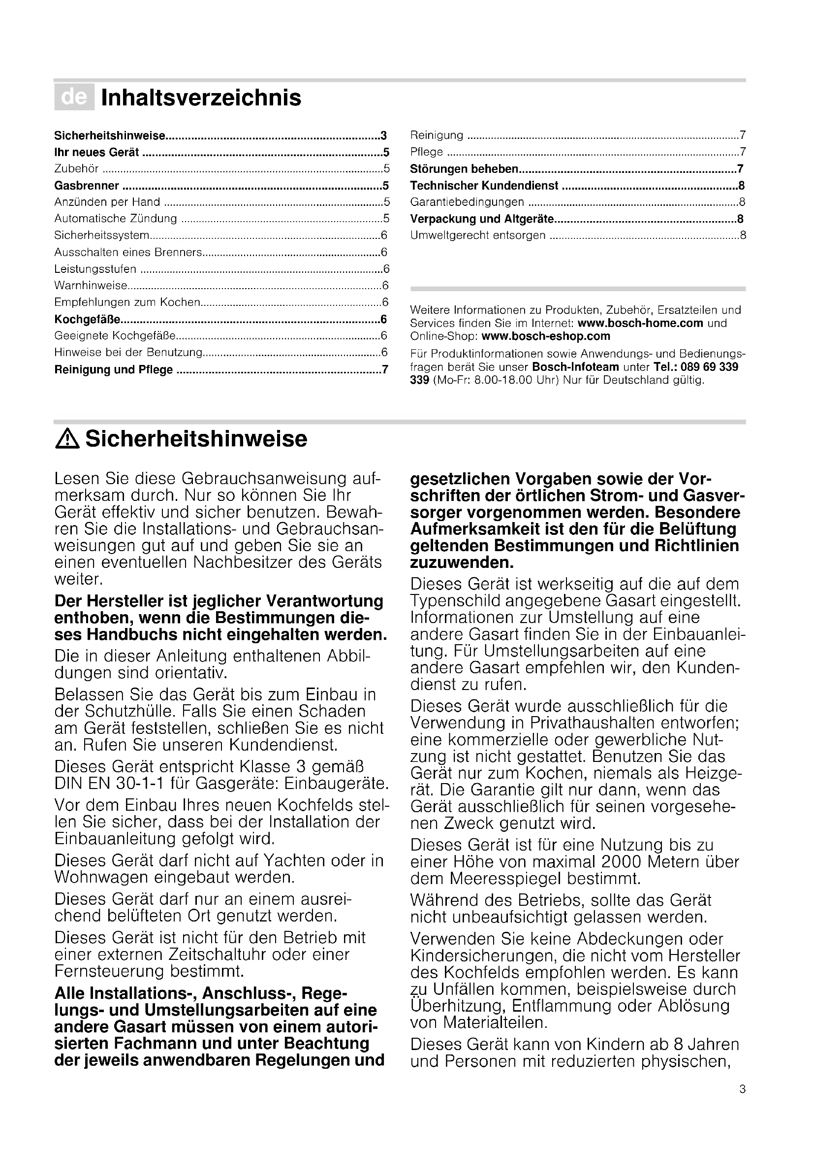 - Umweltgerecht entsorgen Produktinfo Weitere Informationen zu Produkten, Zubehör, Ersatzteilen und Services finden Sie im Internet: www.bosch-home.com und Online-Shop: www.bosch-eshop.com Für Produktinformationen sowie Anwendungs- und Bedienungs- fragen berät Sie unser Bosch-Infoteam unter Tel.: 089 69 339 339 (Mo-Fr: 8.00-18.00 Uhr) Nur für Deutschland gültig. : Sicherheitshinweise Lesen Sie diese Gebrauchsanweisung auf- merksam durch. Nur so können Sie Ihr Gerät effektiv und sicher benutzen. Bewah- ren Sie die Installations- und Gebrauchsan- weisungen gut auf und geben Sie sie an einen eventuellen Nachbesitzer des Geräts weiter. Der Hersteller ist jeglicher Verantwortung enthoben, wenn die Bestimmungen die- ses Handbuchs nicht eingehalten werden. Die in dieser Anleitung enthaltenen Abbil- dungen sind orientativ. Belassen Sie das Gerät bis zum Einbau in der Schutzhülle. Falls Sie einen Schaden am Gerät feststellen, schließen Sie es nicht an. Rufen Sie unseren Kundendienst. Dieses Gerät entspricht Klasse 3 gemäß DIN EN 30-1-1 für Gasgeräte: Einbaugeräte. Vor dem Einbau Ihres neuen Kochfelds stel- len Sie sicher, dass bei der Installation der Einbauanleitung gefolgt wird. Dieses Gerät darf nicht auf Yachten oder in Wohnwagen eingebaut werden. Dieses Gerät darf nur an einem ausrei- chend belüfteten Ort genutzt werden. Dieses Gerät ist nicht für den Betrieb mit einer externen Zeitschaltuhr oder einer Fernsteuerung bestimmt. Alle Installations-, Anschluss-, Rege- lungs- und Umstellungsarbeiten auf eine andere Gasart müssen von einem autori- sierten Fachmann und unter Beachtung der jeweils anwendbaren Regelungen und gesetzlichen Vorgaben sowie der Vor- schriften der örtlichen Strom- und Gasver- sorger vorgenommen werden. Besondere Aufmerksamkeit ist den für die Belüftung geltenden Bestimmungen und Richtlinien zuzuwenden. Dieses Gerät ist werkseitig auf die auf dem Typenschild angegebene Gasart eingestellt. Informationen zur Umstellung auf eine andere Gasart finden Sie in der Einbauanlei- tung. Für Umstellungsarbeiten auf eine andere Gasart empfehlen wir, den Kunden- dienst zu rufen. Dieses Gerät wurde ausschließlich für die Verwendung in Privathaushalten entworfen; eine kommerzielle oder gewerbliche Nut- zung ist nicht gestattet. Benutzen Sie das Gerät nur zum Kochen, niemals als Heizge- rät. Die Garantie gilt nur dann, wenn das Gerät ausschließlich für seinen vorgesehe- nen Zweck genutzt wird. Dieses Gerät ist für eine Nutzung bis zu einer Höhe von maximal 2000 Metern über dem Meeresspiegel bestimmt. Während des Betriebs, sollte das Gerät nicht unbeaufsichtigt gelassen werden. Verwenden Sie keine Abdeckungen oder Kindersicherungen, die nicht vom Hersteller des Kochfelds empfohlen werden. Es kann zu Unfällen kommen, beispielsweise durch Überhitzung, Entflammung oder Ablösung von Materialteilen. Dieses Gerät kann von Kindern ab 8 Jahren und Personen mit reduzierten physischen,4 sensorischen oder mentalen Fähigkeiten oder Mangel an Erfahrung oder Wissen benutzt werden, wenn sie von einer Person, die für ihre Sicherheit verantwortlich ist, beaufsichtigt oder von ihr bezüglich des sicheren Gebrauchs des Gerätes unterwie- sen wurden und sie die daraus resultieren- den Gefahren verstanden haben. Kinder dürfen nicht mit dem Gerät spielen. Reinigung und Benutzer-Wartung dürfen nicht durch Kinder durchgeführt werden, es sei denn, sie sind 15 Jahre und älter und werden beaufsichtigt. Kinder jünger als 8 Jahre vom Gerät und der Anschlussleitung fernhalten. Gefahr der Verpuffung! Bei Ansammlung von unverbranntem Gas in geschlossenen Räumen besteht Verpuf- fungsgefahr. Das Gerät nicht der Zugluft aussetzen. Die Brenner können sonst aus- gehen. Lesen Sie die Warnhinweise bezüg- lich der Funktionsweise der Gasbrenner aufmerksam durch. Vergiftungsgefahr! Die Benutzung eines Gaskochgeräts erzeugt in dem Raum, in dem es betrieben wird, Wärme, Feuchtigkeit und Verbren- nungsprodukte. Stellen Sie sicher, dass die Küche gut durchlüftet ist, vor allem wenn das Kochfeld in Betrieb ist: halten Sie die natürlichen Belüftungsöffnungen frei oder installieren Sie eine mechanische Belüf- tung (Abzugshaube). Ein langer und dauer- hafter Betrieb des Geräts kann eine zusätzliche oder effizientere Belüftung erfor- dern: öffnen Sie ein Fenster oder erhöhen Sie die Leistung der Abzugshaube. Verbrennungsgefahr! p. 8