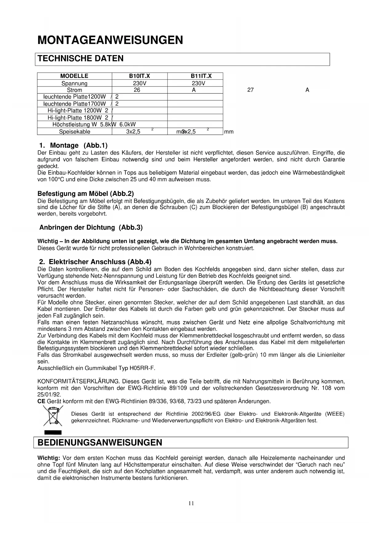 Die Daten kontrollieren, die auf dem Schild am Boden des Kochfelds angegeben sind, dann safer stellen, dass zur Verfugung stehende Netz-Nennspannung und Leistung fur den Betrieb des Kochfelds geeignet sind.