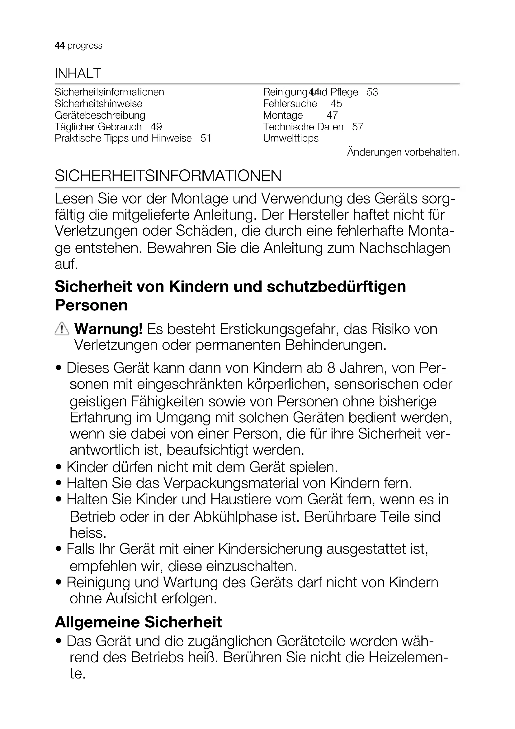 - Das Gerät und die zugänglichen Geräteteile werden wäh- rend des Betriebs heiß. Berühren Sie nicht die Heizelemen- te. 44 progress• Schalten Sie das Gerät nicht über eine externe Zeitschaltuhr oder eine separate Fernsteuerung ein.