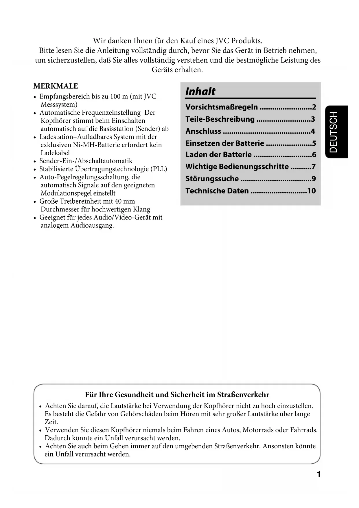 - Design and specifications subject to change without notice. HAW600_G.indb 10HAW600_G.indb 10 06.7.7 2:06:50 PM06.7.7 2:06:50 PM1 DEUTSCH Inhalt Vorsichtsmaßregeln .........................2 Teile-Beschreibung ..........................3 Anschluss ..........................................4 Einsetzen der Batterie ......................5 Laden der Batterie ............................6 Wichtige Bedienungsschritte ..........7 Störungssuche ..................................9 Technische Daten ...........................10 Wir danken Ihnen für den Kauf eines JVC Produkts. Bitte lesen Sie die Anleitung vollständig durch, bevor Sie das Gerät in Betrieb nehmen, um sicherzustellen, daß Sie alles vollständig verstehen und die bestmögliche Leistung des Geräts erhalten. Für Ihre Gesundheit und Sicherheit im Straßenverkehr