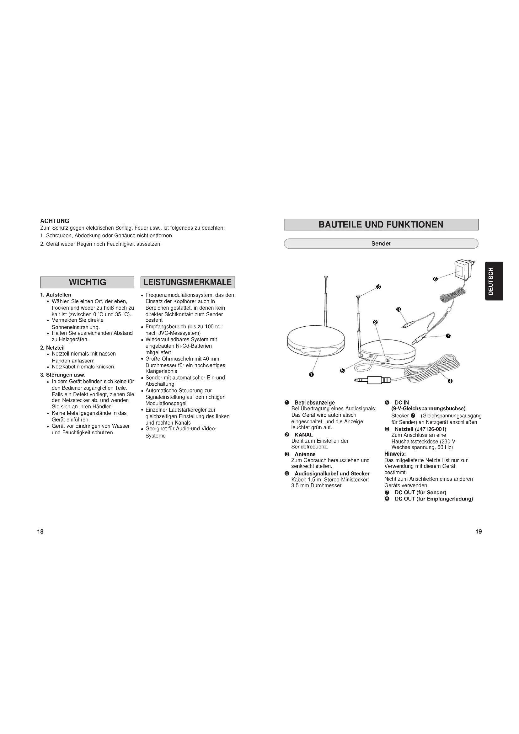 Was zunächst wie eine Störung aussieht, kann bei näherer Betrachtung eine harmlose Ursache haben. Prüfen Sie zunächst folgende Punkte ... Fehler Ursache Abhilfe Überprüfen Sie die Verbindung zum Sender.Schalten Sie die angeschlossenen Audio-/Videogeräte ein, und schalten Sie die Wiedergabefunktion ein.Schließen Sie den Sender mit einem optionalen Adapter an. (Setzt den Monoausgang des Audio-/Videogeräts auf den Stereoeingang des Kopfhörers um.)Drehen Sie zur Einstellung die Regler TUNING am Kopfhörer, oder wählen Sie die KANÄLE am Sender.Benutzen Sie die Kopfhörer nur innerhalb der Aktionsbereichs des Frequenzmodulationssignals. (Siehe Seite 22.)Tauschen Sie die Ni-Cd-Batterie gegen eine neue aus. Zum Batteriewechsel wenden Sie sich bitte an lhren Fachhändler.Ist der Sender ausgeschaltet?Sind die Kopfhörer ausgeschaltet?Ist die Kopfhörer-Batterie erschöpft?Ist der Lautstärkeregler der Kopfhörer auf kleinste Lautstärke eingestellt?Sind die Lautstärkeregler der angeschlossenen Audio-/Videogeräte auf kleinste Lautstärke eingestellt?Ist der Sender über den Monoausgang an die Audio-/Videogeräte angeschlossen?Sind die Akkus in den Kopfhörern erschöpft?Ist der Lautstärkeregler der angeschlossenen Audio-/Videogeräte zu hoch eingestellt?Sind die Akkus in den Kopfhörern erschöpft?Werden die Frequenzmodulations-signale einwandfrei empfangen?Ist der Lautstärkeregler der angeschlossenen Audio-/Videogeräte zu niedring eingestellt?Ist der Abstand zwischen Kopfhörern und Sender zu groß?Ist die Ni-Cd-batterie zu alt?Kein Ton.Schalten Sie die Kopfhörer ein. (Die Anzeige leuchtet.)Die Kopfhörerbatterie vollständing aufladen.Stellen Sie den Lautstärkeregler der Kopfhörer auf die richtige Lautstärke ein.Stellen Sie die Lautstärke der angeschlossenen Audio-/Videogeräte so hoch wie möglich, ohne dass Verzerrungen auftreten.Stellen Sie den Lautsärkeregler der angeschlossenen Audio-/Videogeräte so hoch wie möglich, ohne dass Verzerrungen auftreten.Stellen Sie den Lautstärkeregler der angeschlossenen Audio-/Videogeräte so hoch wie möglich, ohne dass Verzerrungen auftreten.Die Kopfhörerbatterie vollständig aufladen.Die Kopfhörerbatterie vollständig aufladen.Kein Ton im rechten Kanal.Ton ist verzerrt.Rauschen.Die Batterie lässt sich nicht aufladen. Allgemeines System : Radiofrequenz (UHF-Stereo) Modulation : Frequenzmodulation Trägerfrequenz : 863 – 865 MHz Aktionsradius (max. Entfernung) : Max. 100 m (mit JVC-Messgeräten unter kontrollierten Umgebungsbedingungen) Frequenzgang : 30 – 15,000 Hz Verzerrung : Kleiner als 4% (bei 1 kHz) Sender (J22121-001) Elektrischer Anschluss : 9 V Gleichspannung (mit dem exklusiven Netzgerät) Audioeingang : 3,5 mm Stereo-Miniklinkenstecker Eingangsimpedanz : 25kΩ Referenzeingangs- pegel : 300 mV Abmessungen, BxTxH : 100 x 100 x 106 mm (einschließlich Antenne) Gewight : 115 g (ohne Anschlusskabel und Steckernetzteil) Kopfhörer (HA-W500RF) Elektrischer Anschluss : Ni-Cd-Batterie (1,2 V) x 2 Batterienutzungsdauer : 20 Stunden (bei Ladezeit von 24 Stunden) Gewight : 280 g (mit installierter wiederaufladbarer Ni-Cd-Batterie x 2) Mitgeliefertes Zubehör Bedienungs- anleitung x 1 Steckernetzteil x 1 (nur mitgeliefertes Steckernetzteil verwenden) Anschlusskabel x 1 (3,5 mm Stereo-Miniklinkenbuchse — Cinch-Stecker x 2; 0,1 m Länge) Klinkenstecker- adapter x 1 (Stereo-Klinkenstecker 3,5 mm (Mini) auf 6,3 mm (Standard)