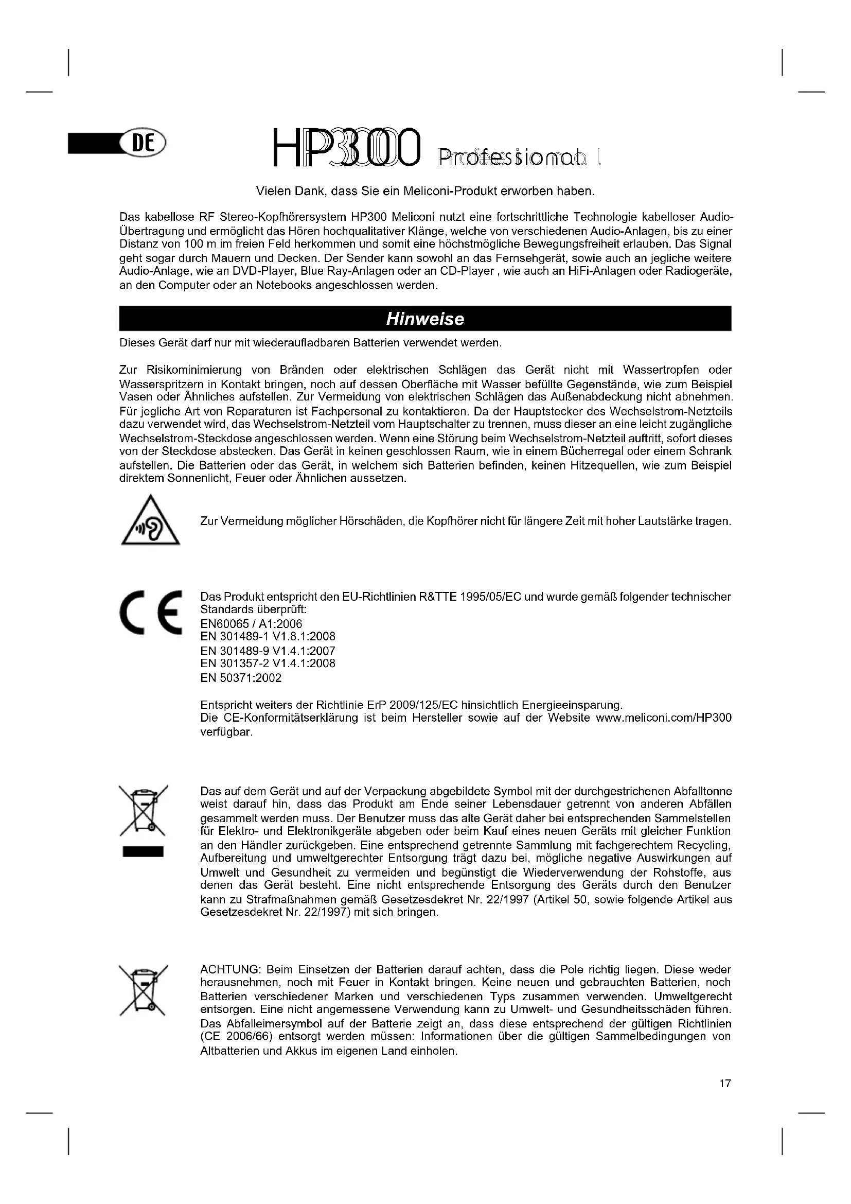 Zur Vermeidung möglicher Hörschäden, die Kopfhörer nicht für längere Zeit mit hoher Lautstärke tragen.Das Produkt entspricht den EU-Richtlinien R&TTE 1995/05/EC und wurde gemäß folgender technischer Standards überprüft:EN60065 / A1:2006 EN 301489-1 V1.8.1:2008EN 301489-9 V1.4.1:2007EN 301357-2 V1.4.1:2008EN 50371:2002Entspricht weiters der Richtlinie ErP 2009/125/EC hinsichtlich Energieeinsparung.Die CE-Konformitätserklärung ist beim Hersteller sowie auf der Website www.meliconi.com/HP300 verfügbar. Dieses Gerät darf nur mit wiederaufl adbaren Batterien verwendet werden. Zur Risikominimierung von Bränden oder elektrischen Schlägen das Gerät nicht mit Wassertropfen oder Wasserspritzern in Kontakt bringen, noch auf dessen Oberfl äche mit Wasser befüllte Gegenstände, wie zum Beispiel Vasen oder Ähnliches aufstellen. Zur Vermeidung von elektrischen Schlägen das Außenabdeckung nicht abnehmen. Für jegliche Art von Reparaturen ist Fachpersonal zu kontaktieren. Da der Hauptstecker des Wechselstrom-Netzteils dazu verwendet wird, das Wechselstrom-Netzteil vom Hauptschalter zu trennen, muss dieser an eine leicht zugängliche Wechselstrom-Steckdose angeschlossen werden. Wenn eine Störung beim Wechselstrom-Netzteil auftritt, sofort dieses von der Steckdose abstecken. Das Gerät in keinen geschlossen Raum, wie in einem Bücherregal oder einem Schrank aufstellen. Die Batterien oder das Gerät, in welchem sich Batterien befi nden, keinen Hitzequellen, wie zum Beispiel direktem Sonnenlicht, Feuer oder Ähnlichen aussetzen. HP300 HP300 Profess i o n a l Professional Vielen Dank, dass Sie ein Meliconi-Produkt erworben haben. Das kabellose RF Stereo-Kopfhörersystem HP300 Meliconi nutzt eine fortschrittliche Technologie kabelloser Audio-Übertragung und ermöglicht das Hören hochqualitativer Klänge, welche von verschiedenen Audio-Anlagen, bis zu einer Distanz von 100 m im freien Feld herkommen und somit eine höchstmögliche Bewegungsfreiheit erlauben. Das Signal geht sogar durch Mauern und Decken. Der Sender kann sowohl an das Fernsehgerät, sowie auch an jegliche weitere Audio-Anlage, wie an DVD-Player, Blue Ray-Anlagen oder an CD-Player , wie auch an HiFi-Anlagen oder Radiogeräte, an den Computer oder an Notebooks angeschlossen werden.ACHTUNG: Beim Einsetzen der Batterien darauf achten, dass die Pole richtig liegen. Diese weder herausnehmen, noch mit Feuer in Kontakt bringen. Keine neuen und gebrauchten Batterien, noch Batterien verschiedener Marken und verschiedenen Typs zusammen verwenden. Umweltgerecht entsorgen. Eine nicht angemessene Verwendung kann zu Umwelt- und Gesundheitsschäden führen. Das Abfalleimersymbol auf der Batterie zeigt an, dass diese entsprechend der gültigen Richtlinien (CE 2006/66) entsorgt werden müssen: Informationen über die gültigen Sammelbedingungen von Altbatterien und Akkus im eigenen Land einholen. Hinweise Das auf dem Gerät und auf der Verpackung abgebildete Symbol mit der durchgestrichenen Abfalltonne weist darauf hin, dass das Produkt am Ende seiner Lebensdauer getrennt von anderen Abfällen gesammelt werden muss. Der Benutzer muss das alte Gerät daher bei entsprechenden Sammelstellen für Elektro- und Elektronikgeräte abgeben oder beim Kauf eines neuen Geräts mit gleicher Funktion an den Händler zurückgeben. Eine entsprechend getrennte Sammlung mit fachgerechtem Recycling, Aufbereitung und umweltgerechter Entsorgung trägt dazu bei, mögliche negative Auswirkungen auf Umwelt und Gesundheit zu vermeiden und begünstigt die Wiederverwendung der Rohstoffe, aus denen das Gerät besteht. Eine nicht entsprechende Entsorgung des Geräts durch den Benutzer kann zu Strafmaßnahmen gemäß Gesetzesdekret Nr. 22/1997 (Artikel 50, sowie folgende Artikel aus Gesetzesdekret Nr. 22/1997) mit sich bringen.18