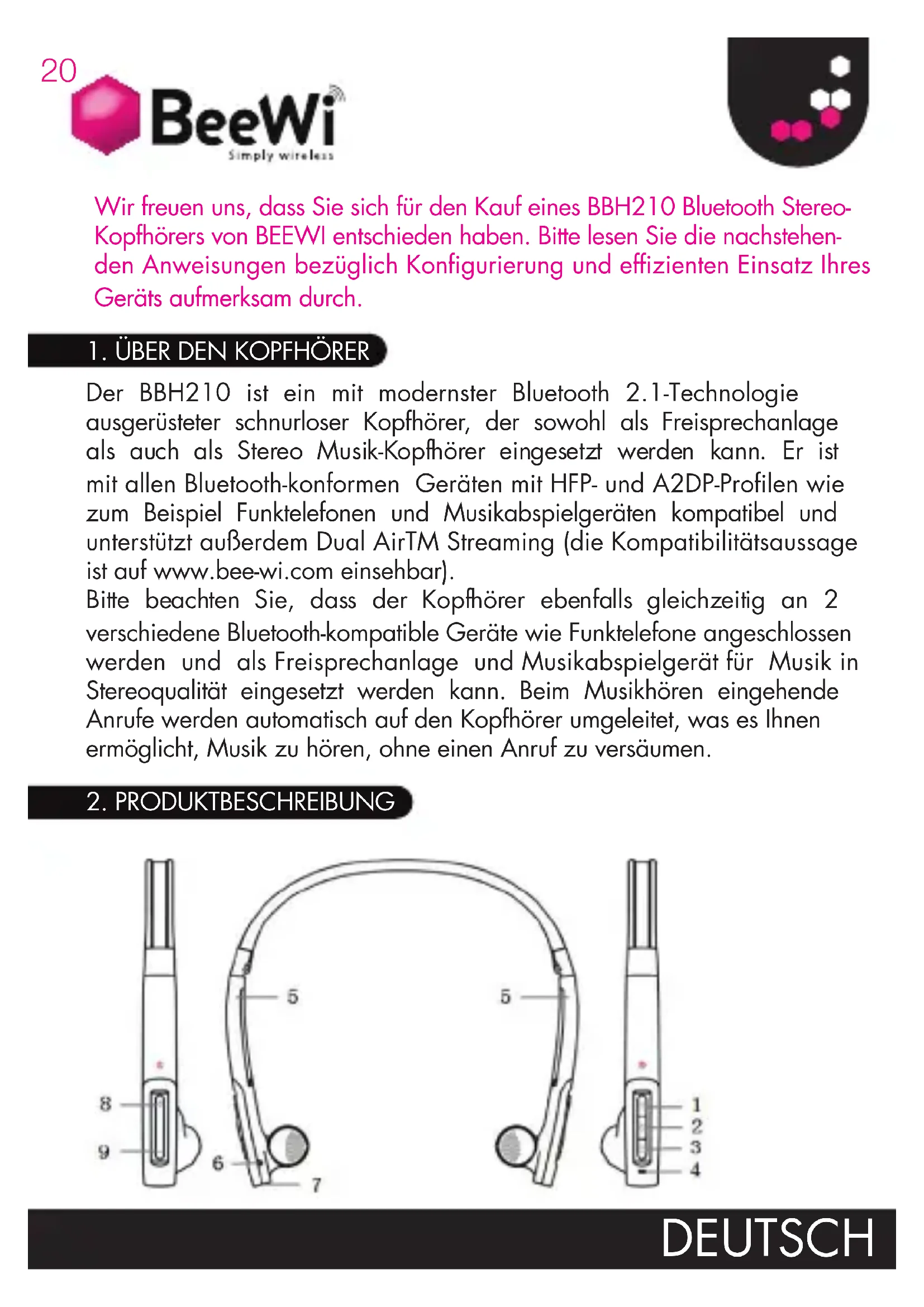 Wir freuen uns, dass Sie sich für den Kauf eines BBH210 Bluetooth Stereo- Kopfhörers von BEEWI entschieden haben. Bitte lesen Sie die nachstehen- den Anweisungen bezüglich Konfigurierung und effizienten Einsatz Ihres Geräts aufmerksam durch.